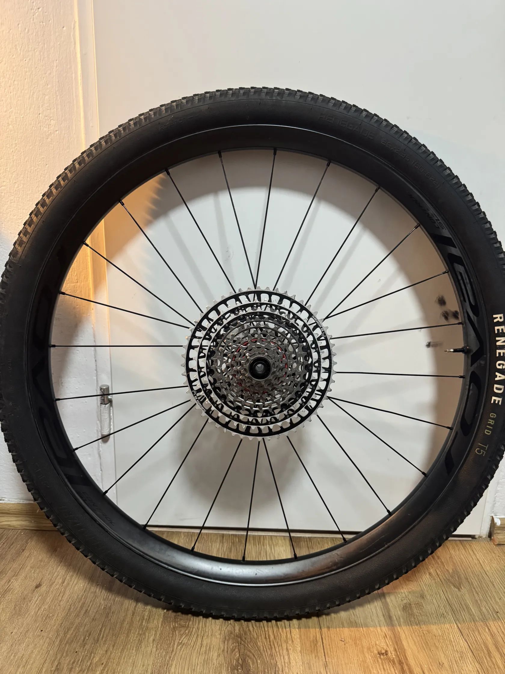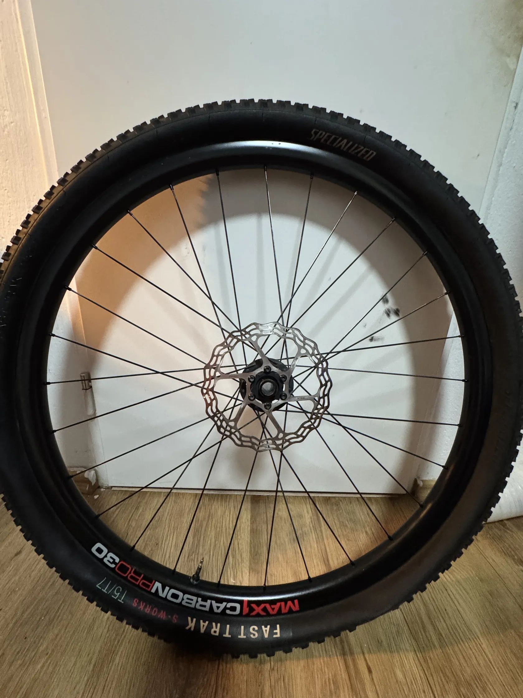 Dále nabízím karbonové ráfky Max1 Carbon PRO 30, také ježděné pouze jednu sezónu. Jsou osazeny novou kazetou SRAM GX z nové generace Transmission, novými plášti Specialized Fast Trak S-Works a stejnými špicemi jako u Roval Control SL.