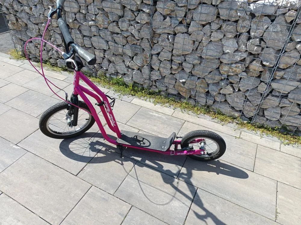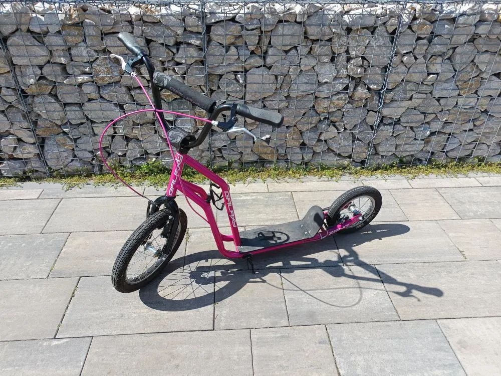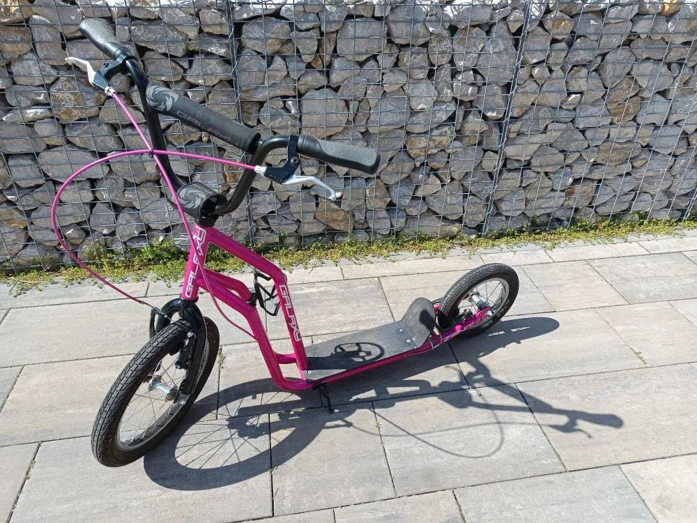 Nabízím k prodeji velmi zachovalou (TOP stav), skoro vůbec neježděnou koloběžku české značky Galaxy Zenit barvy růžové. Přední kolo velikost 16“ a zadní 12“, nafukovací kola, brzdy V-brake, hmotnost 9,5 kg, nosnost 100 kg, délka 134 cm. Použitím trubek většího průměru a přidáním příčné a podélné trubky je zvýšena celkové tuhost a nosnost. Součástí je i košík na lahev. V případě zájmu mě kontaktujte. C