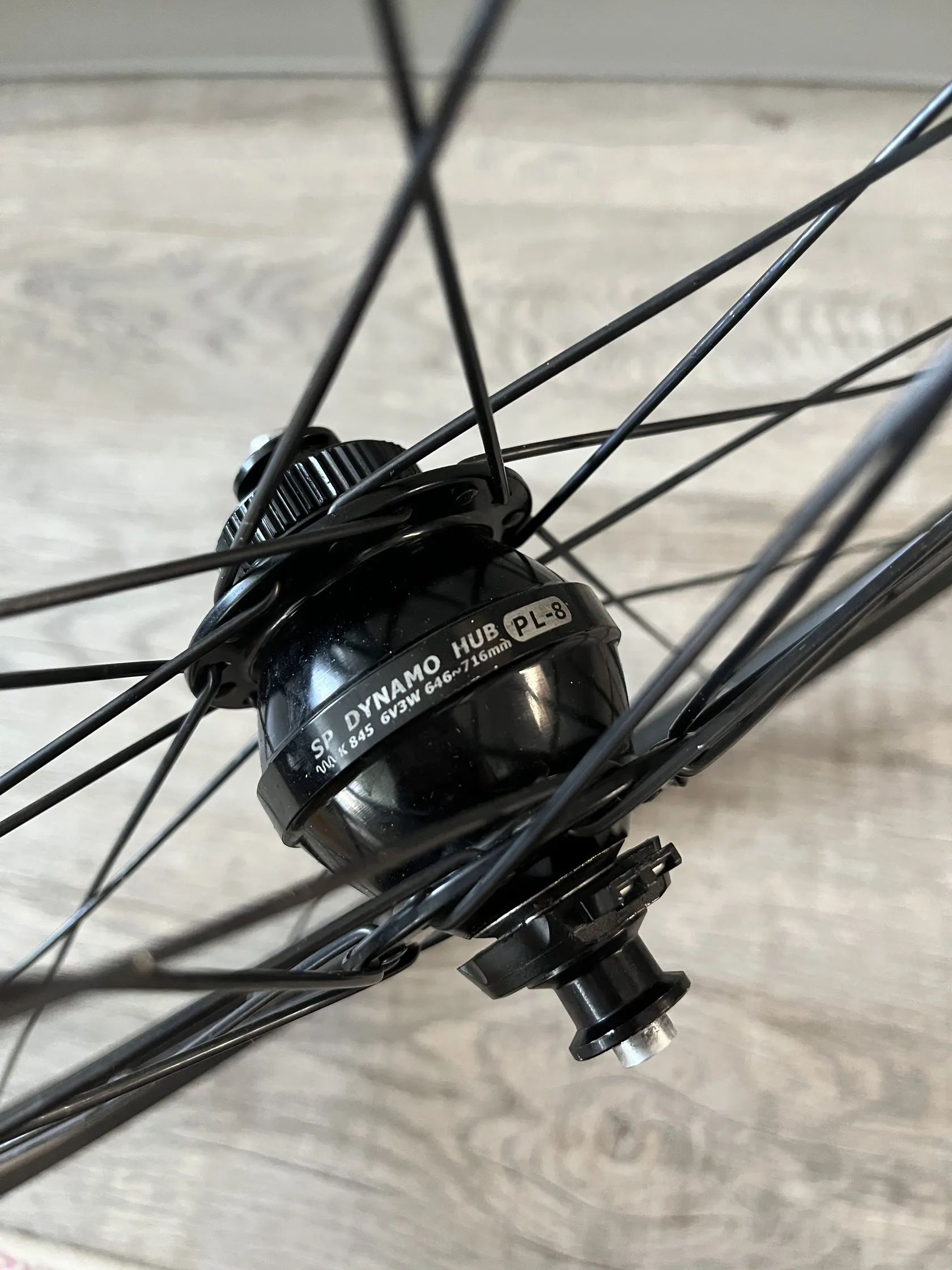 Přední kolo z dynamem Shutter Precision PL-8 (6V/3W) – jedno z nejlehčích a nejúčinnějších dynam na trhu, zaručuje minimální odpor při jízdě, uchyceni kotouče CenterLock, 32 děr. Ráfek Oxygen SSL (Ryde), double wall, ETRTO 622x21.