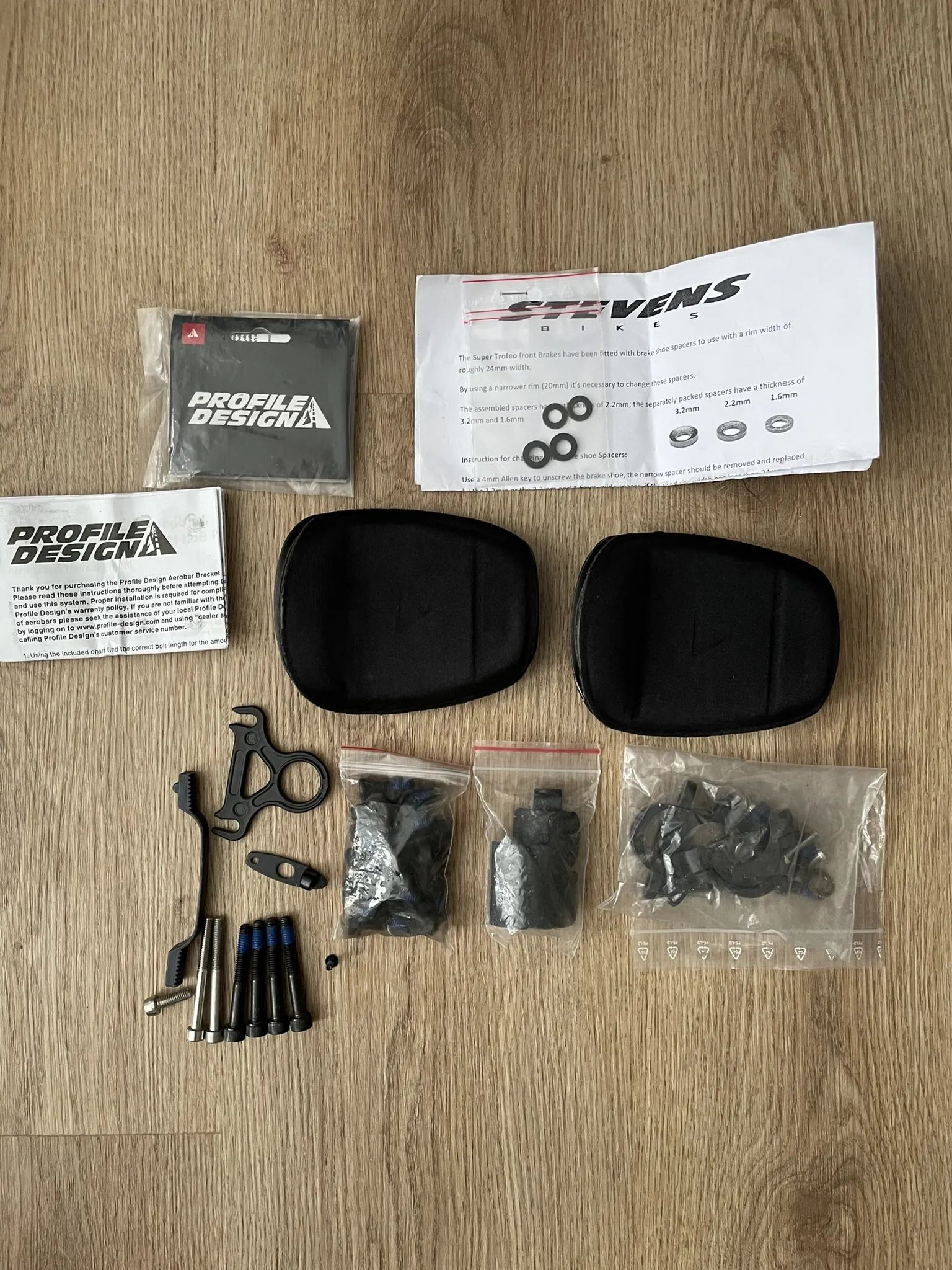 Profile Design T3+ Carbon nástavce + náhradní hliníkové nástavce Profile Design 35a, podložky a košíky pro doladění pozice.