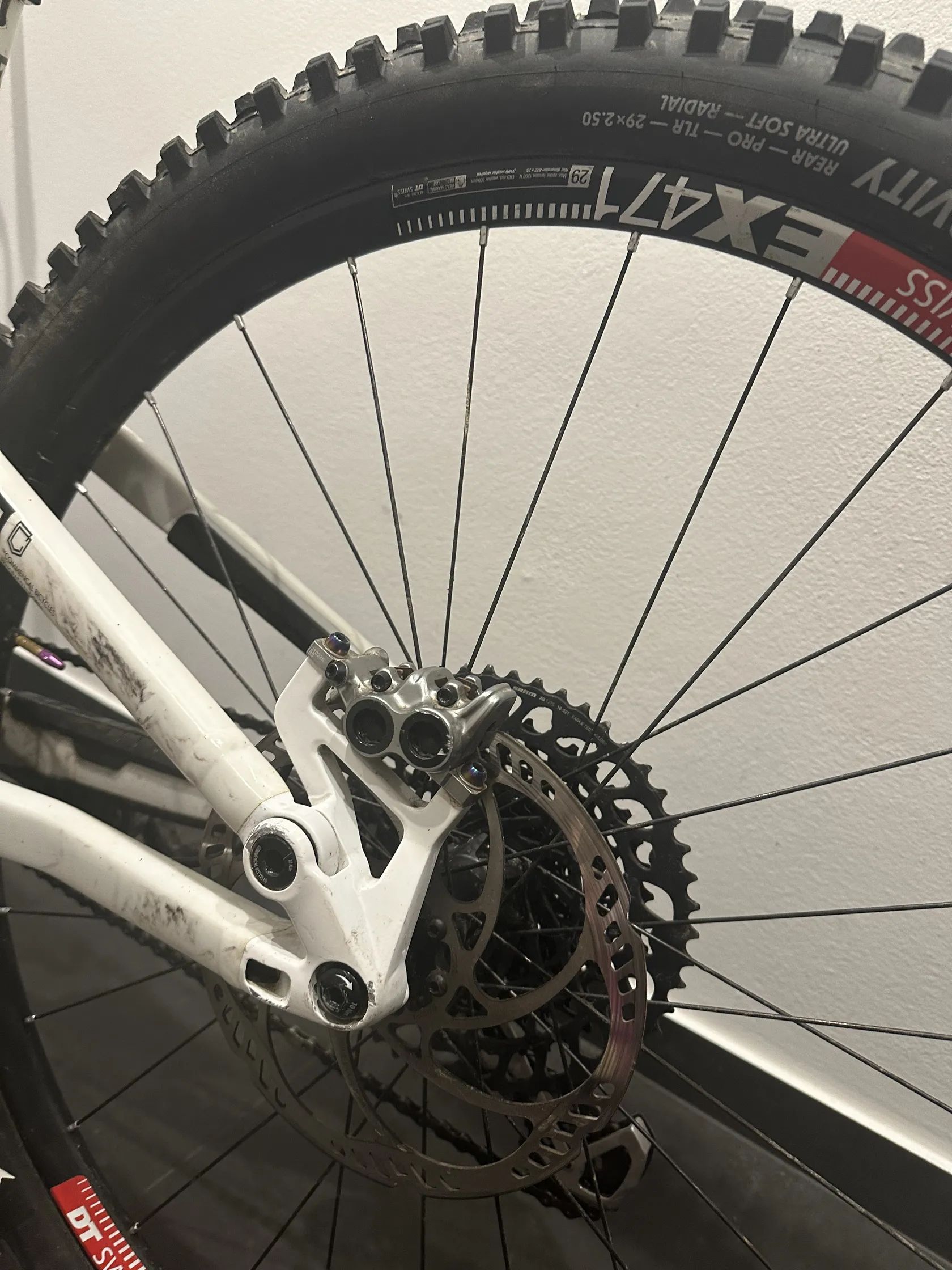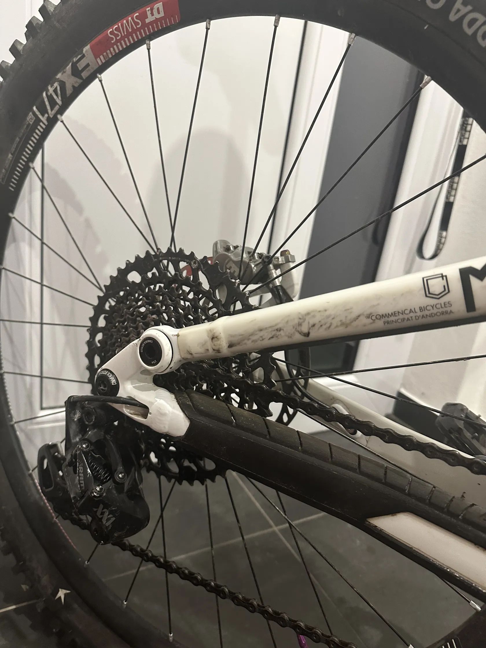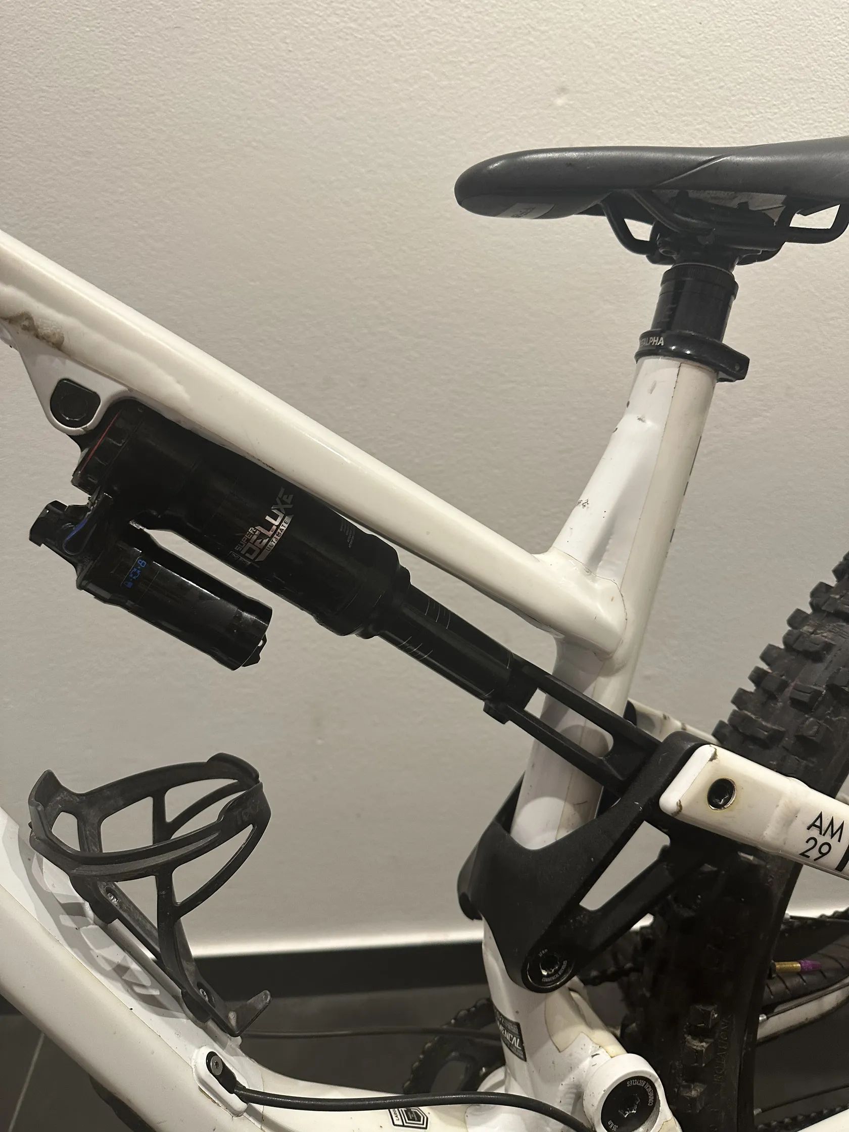 Komponenty: Vidlice: rockshox zeb ultimate rc2 charger 3 170mm Tlumič: rockshox super deluxe ultimate 165mm Brzdy: magura mt7 pro Řazení: sram xx1 Teleskopická sedlovka: KS Lev 175mm sundaná z nového kola, jetá párkrát Kliky: sram gx Náboje: dt swiss 350 Ráfky: dt swiss ex511 a ex471 vzadu Pláště: schwalbe shreda gravity (bezduše + vložky v obou kolech) Rám polepen celofólií (již zažloutlou)