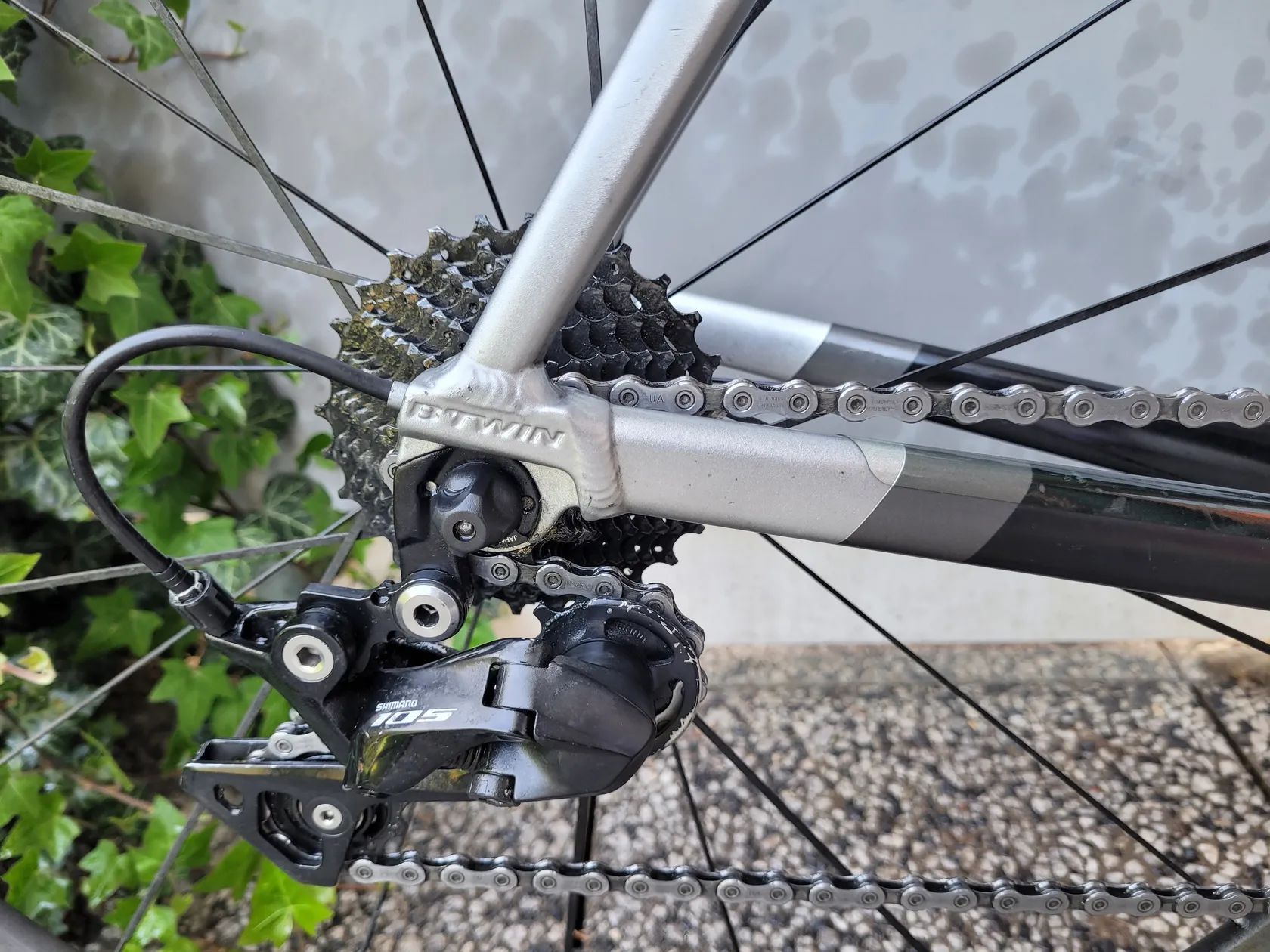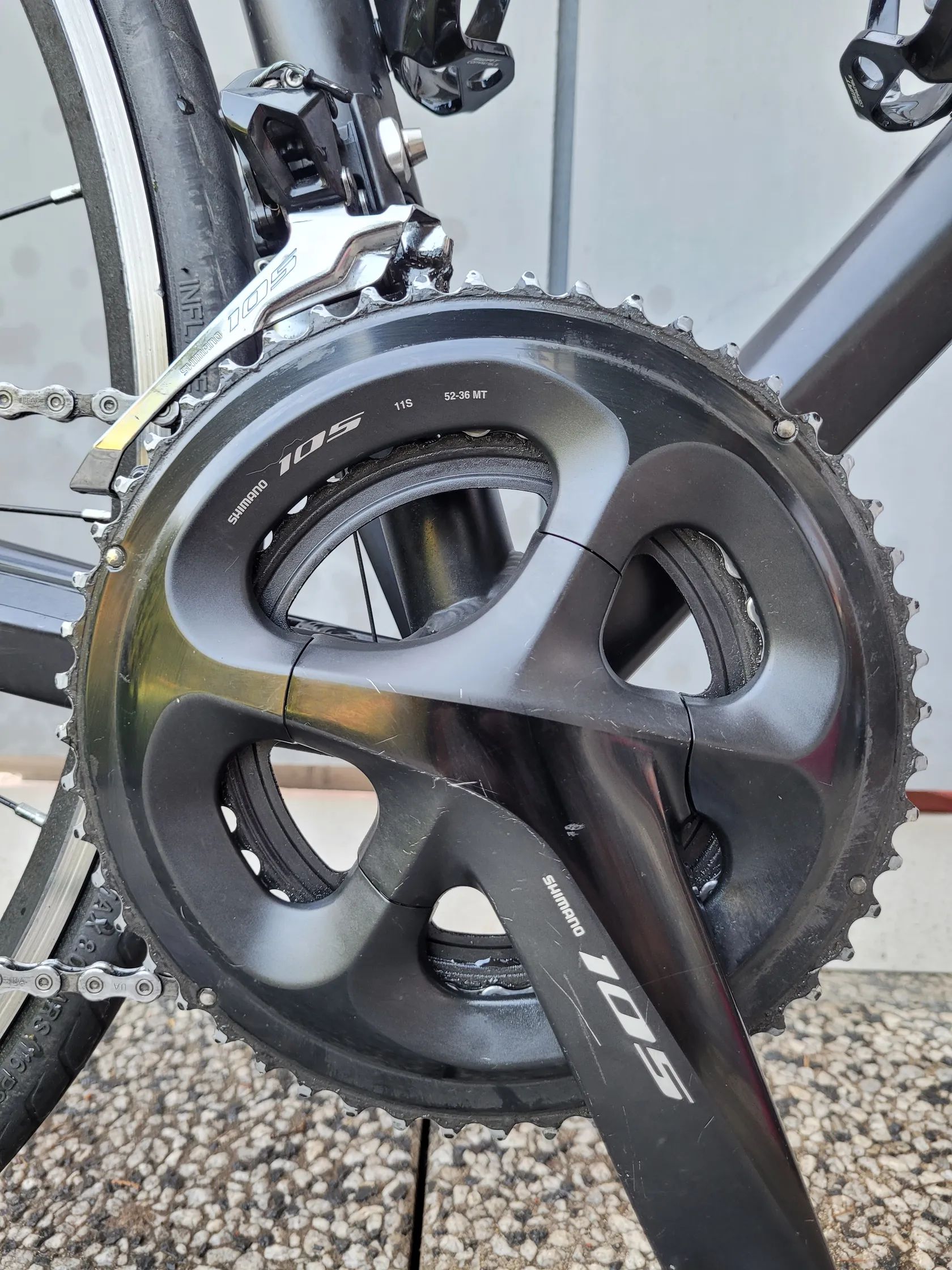 Brzdy a převody jsou Shimano 105, převodů má 2×11, 52-36 zubů vepředu, 11-28 zubů vzadu.