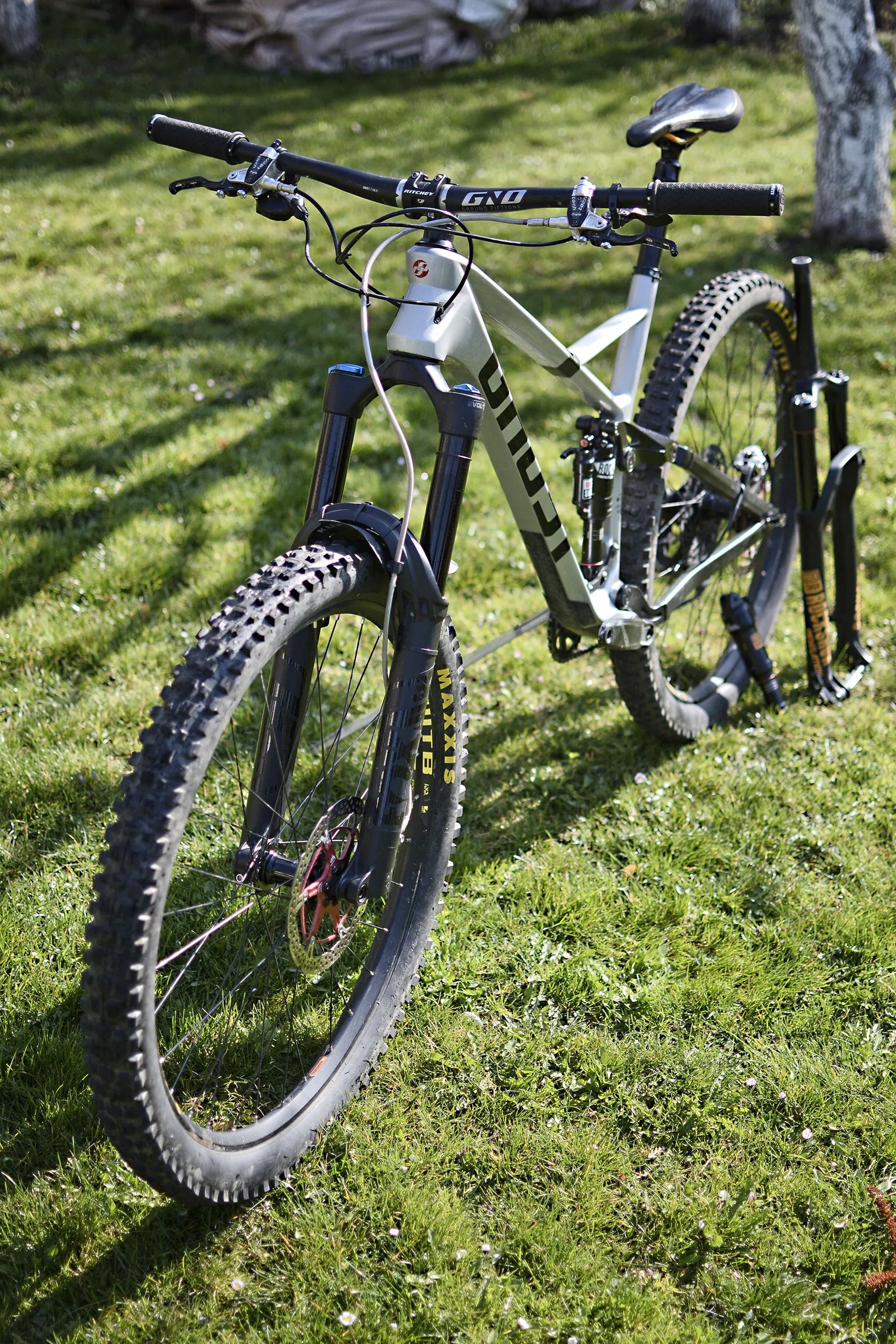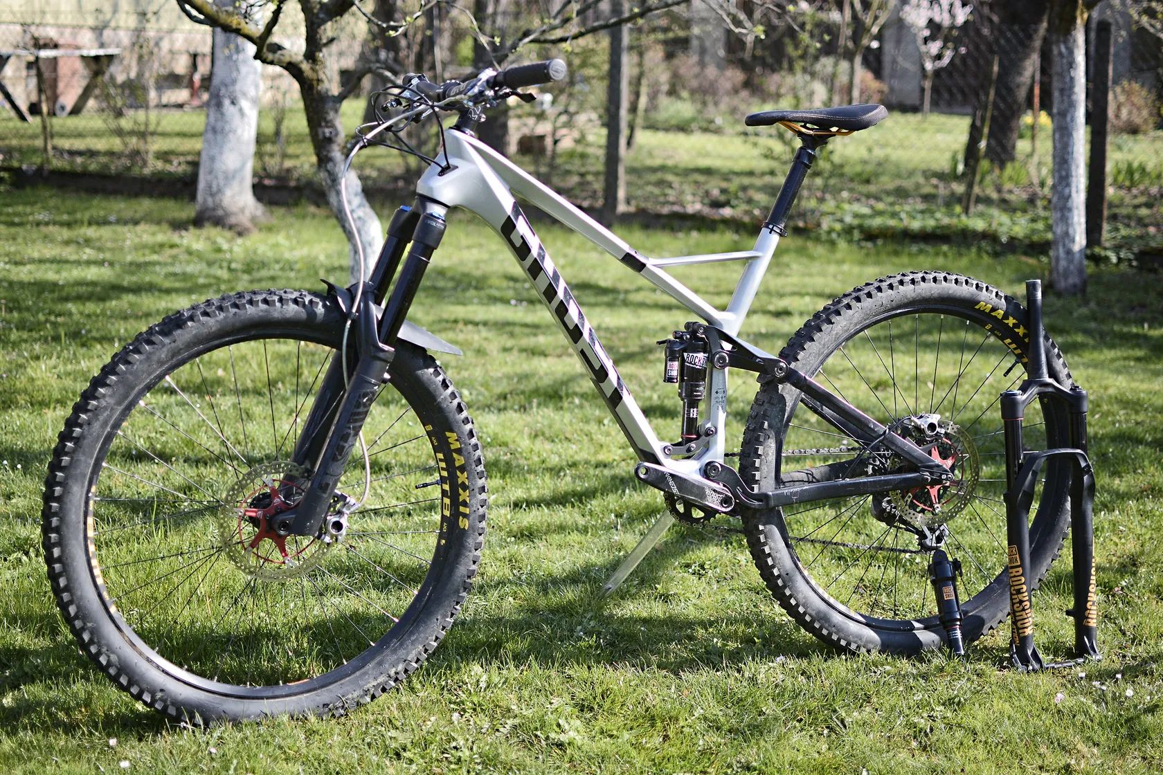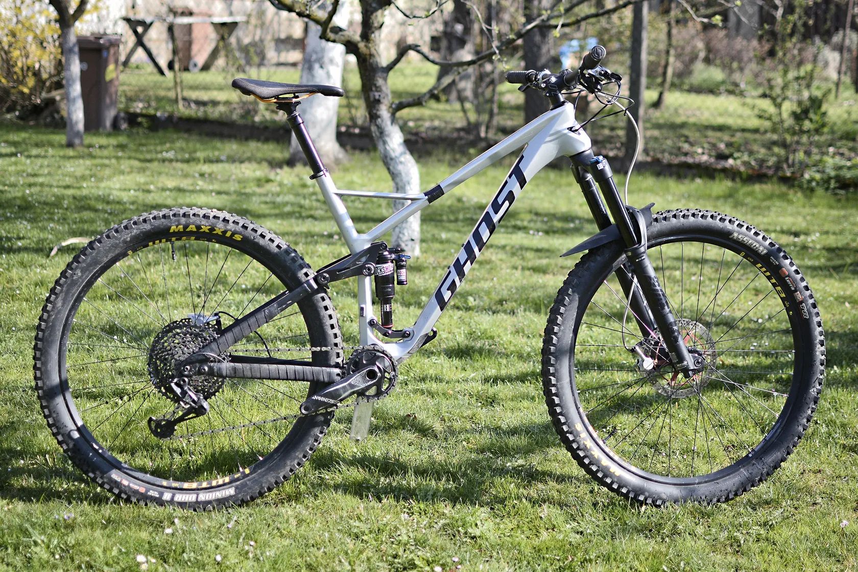 Tento kus je přestavěný na enduro (zdvih cca 170/160 mm, vidlice Fox 38), vhodnější pro náročnější terén a agresivnější jízdu z kopce.