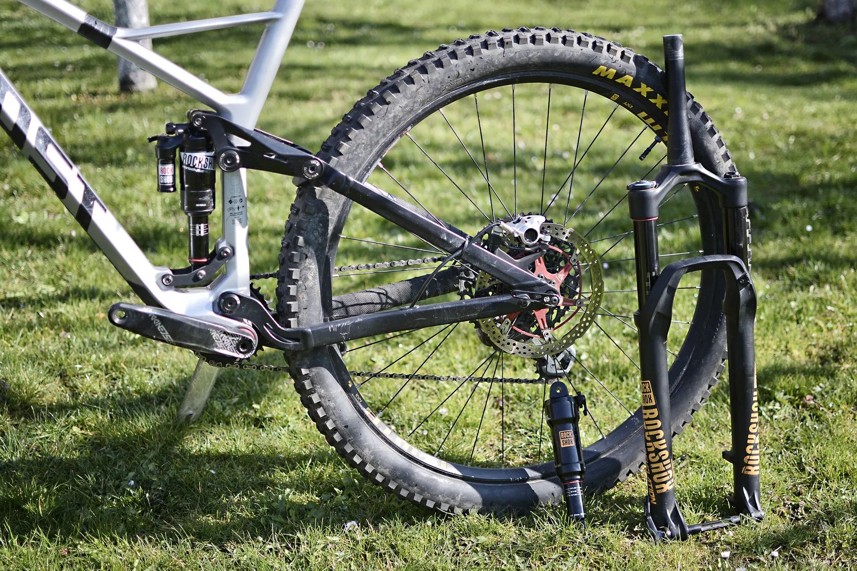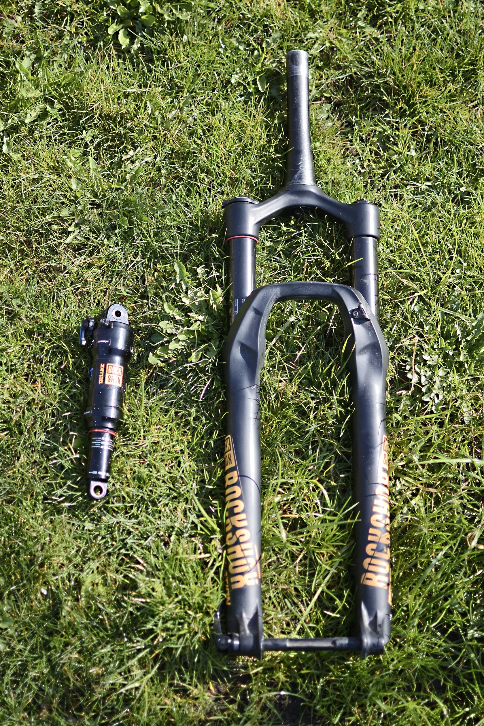 Odpružení enduro úrovně: Fox 38 Float Performance 170 mm + RockShox Monarch Plus RC3 – vhodné pro těžší terén.