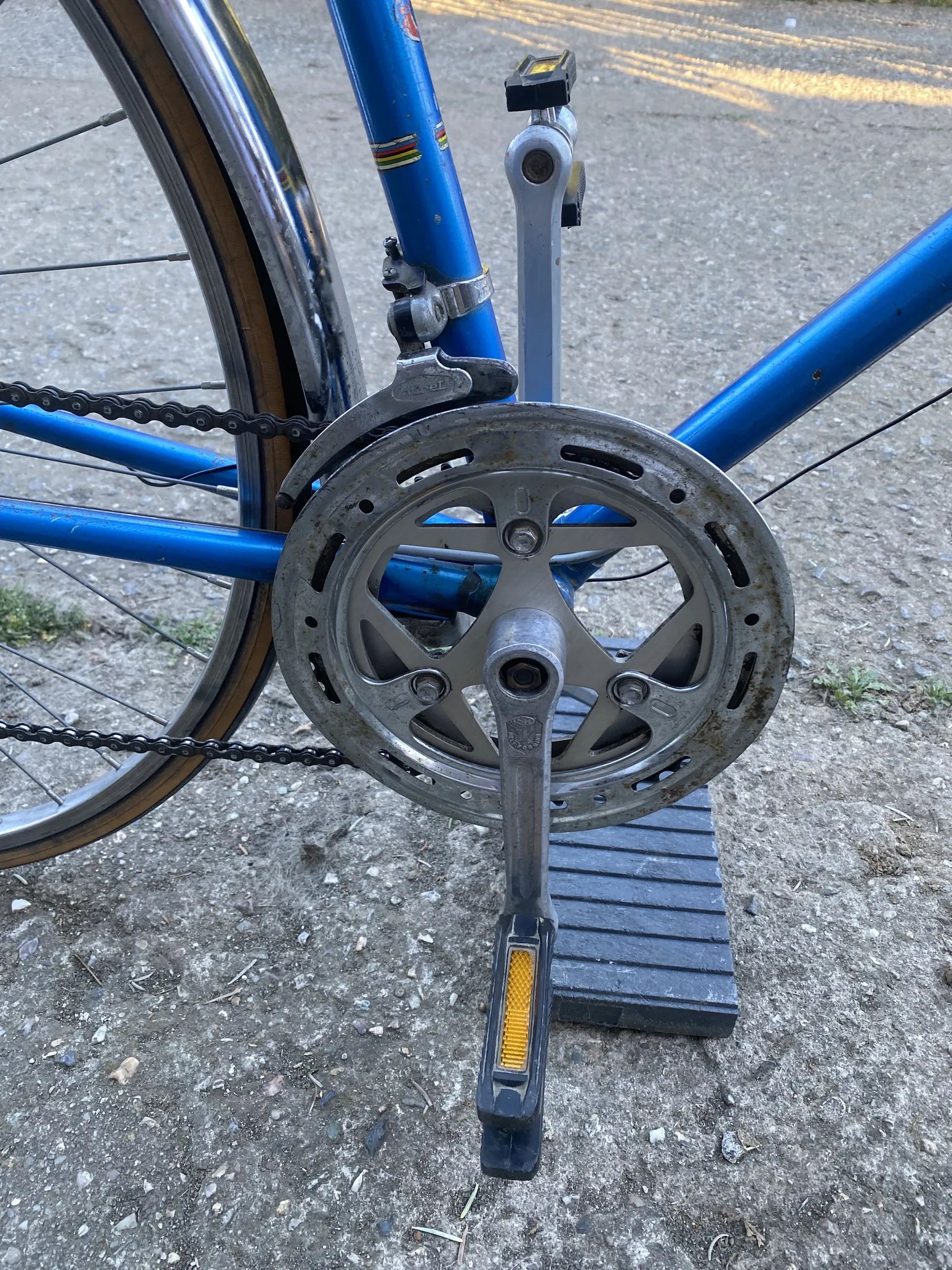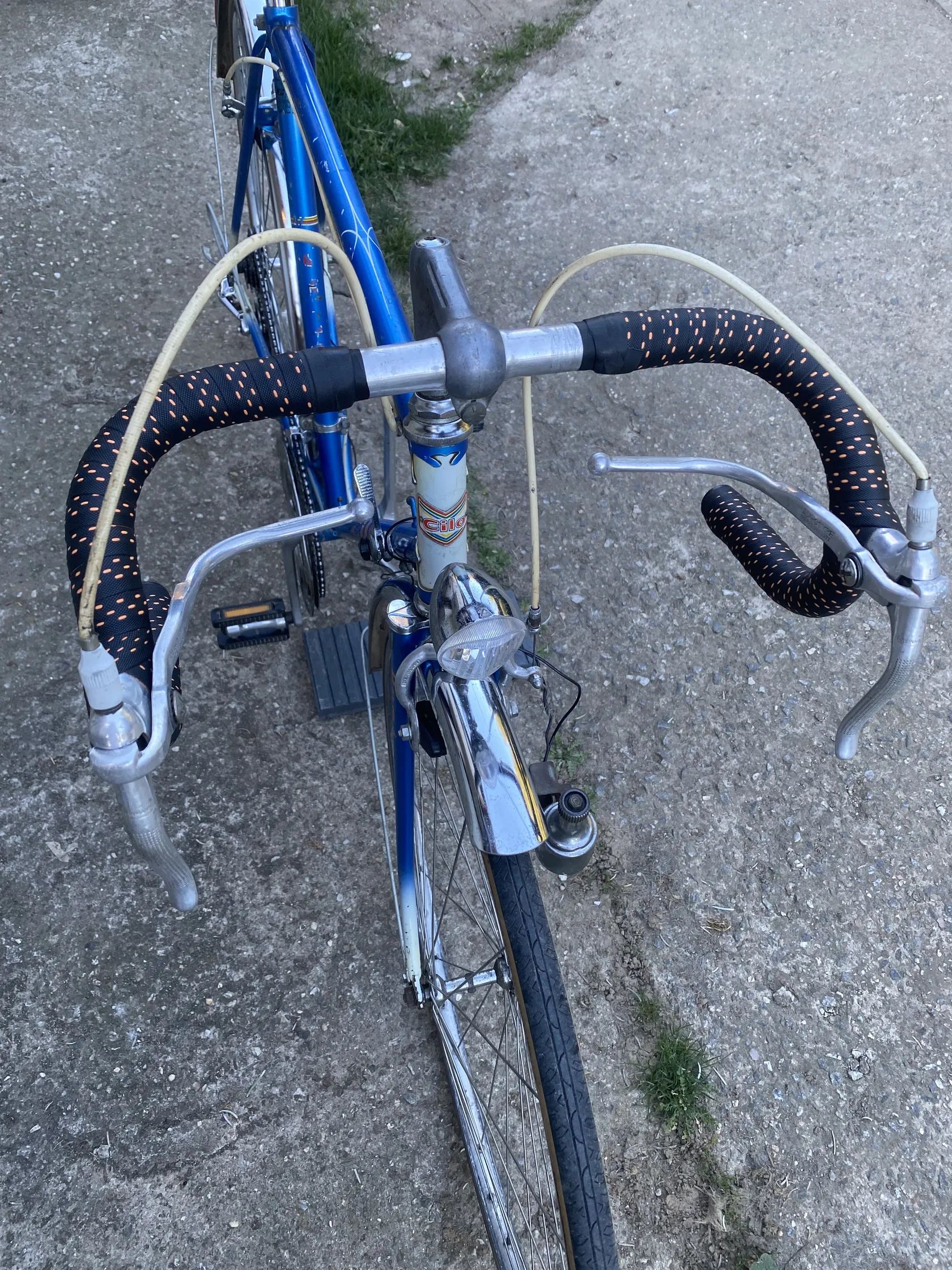 Nabízím k prodeji silniční kolo Cilo (švýcarský výrobce), řazení 2x5, pětikolečko Maillard, páčky a smyk Huret, přehazovačka Shimano RS, brzdy komplet Weinmann, přední kolo Weinmann, krásné chromované blatníky, dynamo Aprilia, přední světlo funkční, zadní bohužel poškozené. Kolo je vzhledem ke stáří zachovalé, není však celé originál, s původní modro-bílou barvou, novou omotávkou řídítek. Nejvyšší nabídce. Osobní předání.
