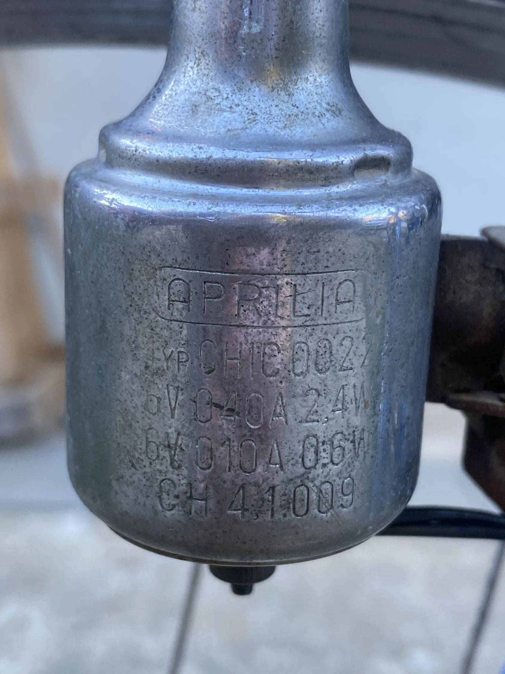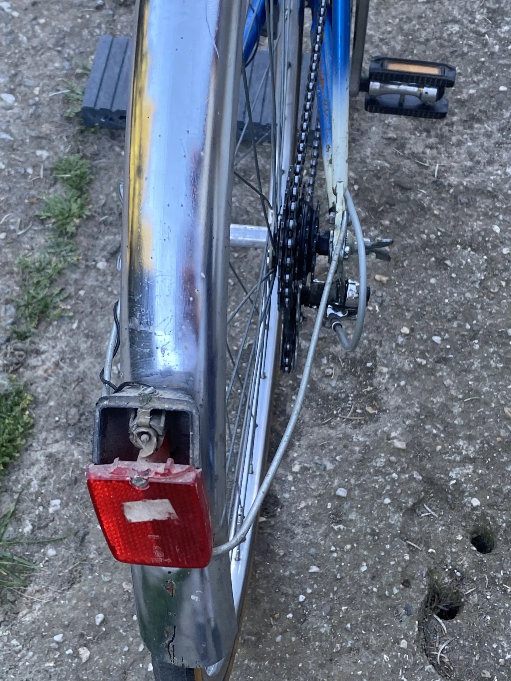 Doplňky: chromované blatníky, dynamo Aprilia, přední funkční světlo, zadní poškozené