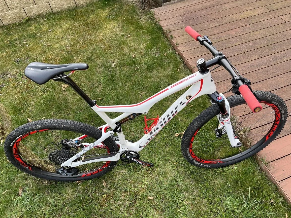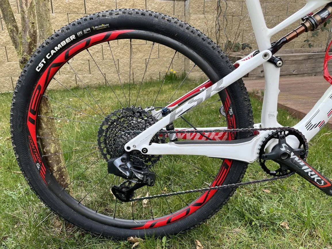 Lehký závodní full, tak jak je na fotkách váží 10,4 kg. Rámová sada rok 2014, karbonová kola Roval Control SL 29 (nově vypletené v loňském roce, bezdušové pláště). Nové osazení (XX1 AXS, brzdy XT) postupně v letech 2021 až 2024. Podle Stravy jsem s ním najel 3510 km od konce roku 2020, kdy jsem pořídil jen lehce jetou rámovou sadu a kola. Letos jen visí na stěně. MTB mám jako doplněk k silničnímu triatlonu. Pár provozních šrámů (hlavně jeden pád- přetočený řídítka odřely horní rámovku). Vše plně funkční. K vidění v Rokycanech, cena k jednání nejlépe při prohlídce a projetí. Ke kolu nabíječka, nářadí do rámu (specialized), náhradní převodníky (32z oval a větší 38, na kole je 36 oval).