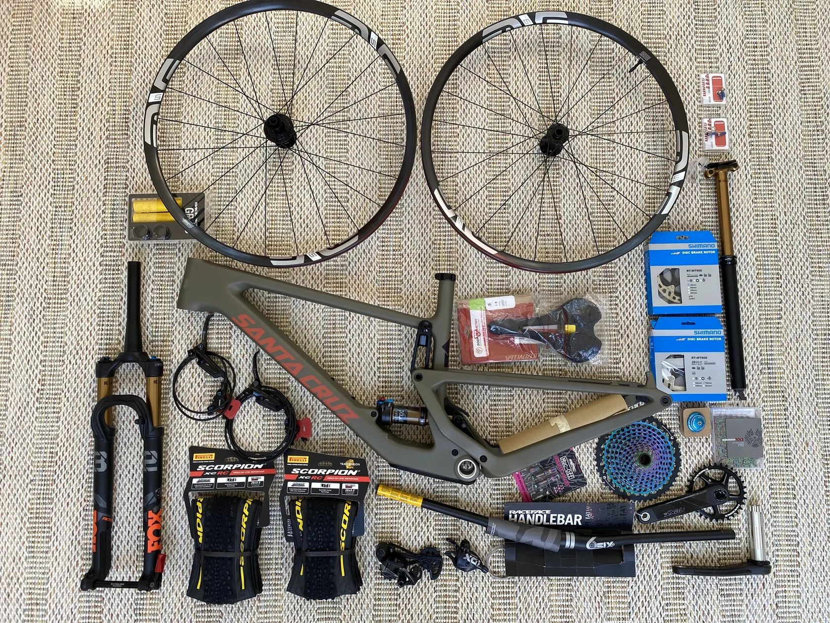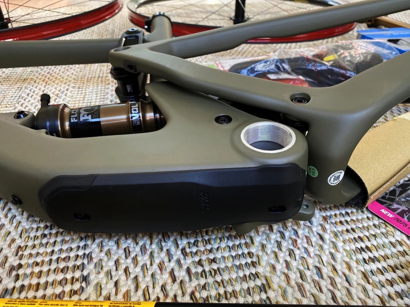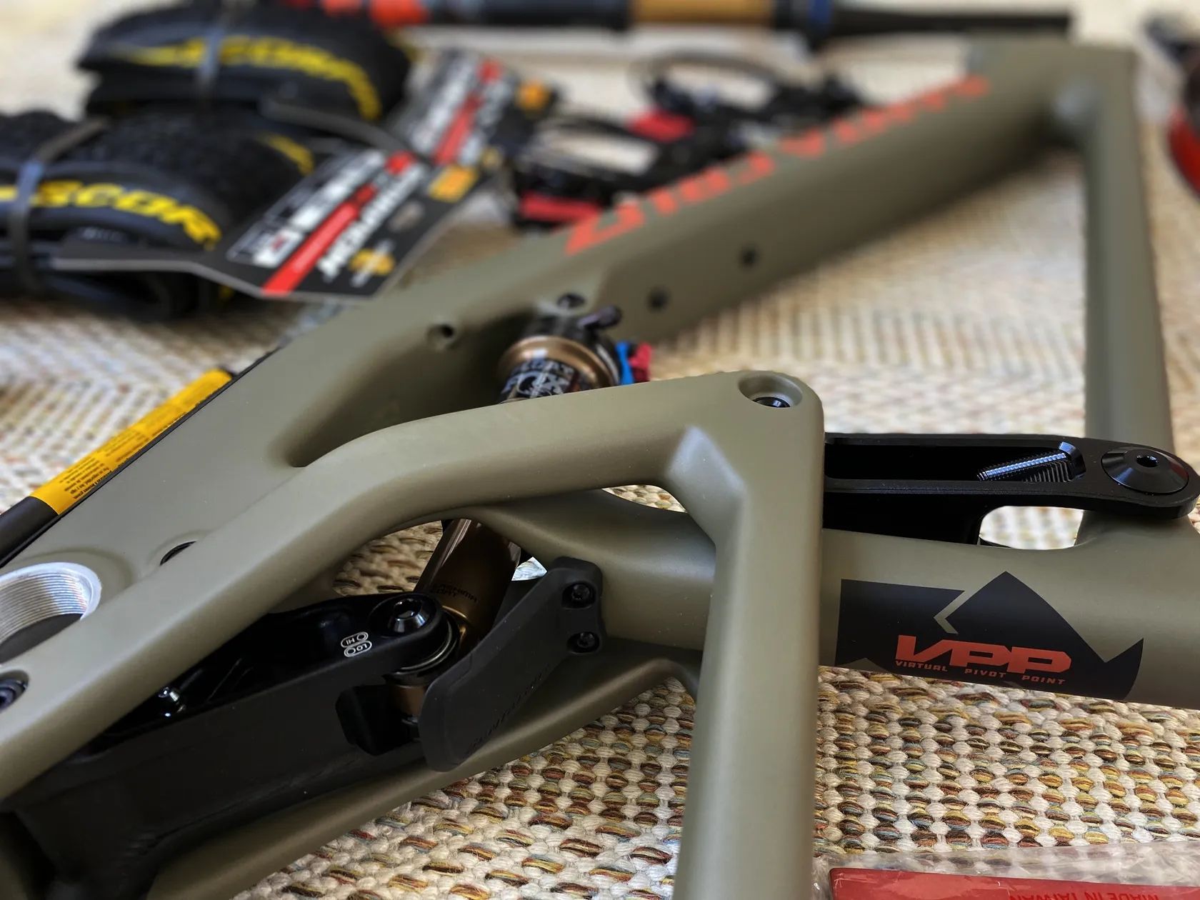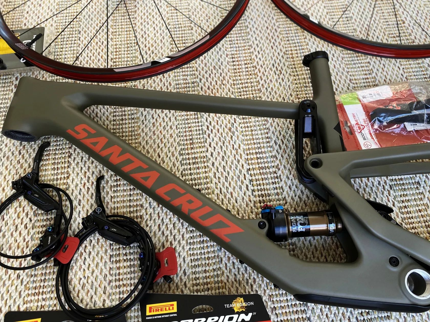 Nová žehlička a sjezdařův XC bike - dnes již legendární rám Santa Cruz Tallboy V4 v krásném barevném zpracování Flatte Earth a velikosti XXL pro čahouna.