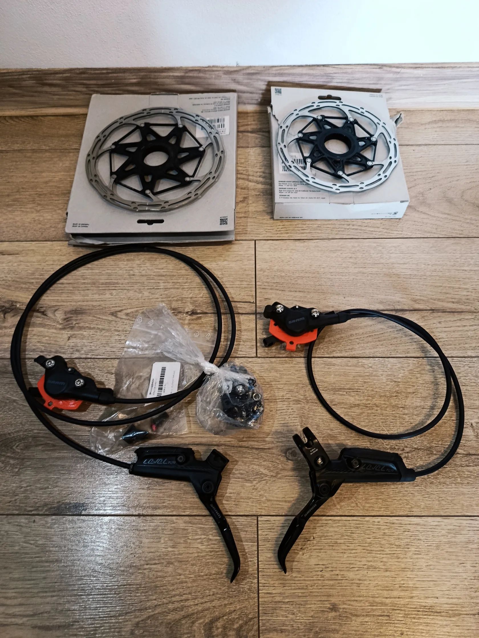 Příslušenství: Spojovací šrouby pro kotouče a třmeny, oranžové transportní vložky, originální krabičky od kotoučů. Stav: Brzdy jsou minimálně jeté, bez viditelných oděrek na pákách i třmenech. Destičky mají cca 90 % životnosti. Systém je těsný, nikde nic neteče, chod pák je hladký.