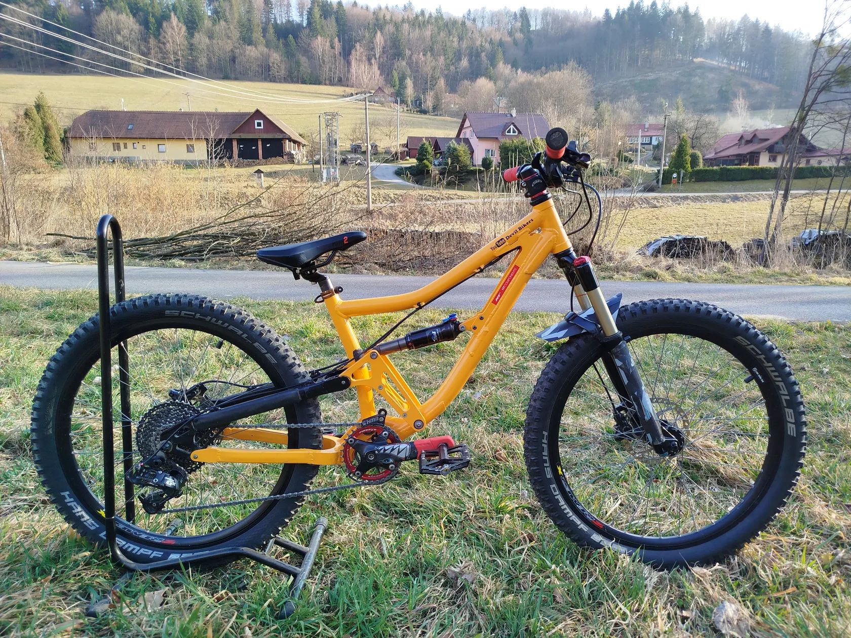 Zdravím, syn roste a tak tu mám na prodej ceoodpružené kolo ideální nejen do bikeparku. Kolo je na zakázku stavěné u cyklo Beneš, s ohledem na malého jezdce. Kola 24", pláště Schwalbe Hans Dampf Brzdy Shimano deore, malé jednoprstové nastavitelné páky, super pro malé ruce, kotouče 160mm. Přehazovačka sram GX 10-speed s velkým rozsahem, převodník Fireeye 32 zubů, skládané tak, aby pro kolo nebyly problém ani prudší kopce. Tlumení: vidlice Manitou, tlumič Fox, minulou sezonu servisované. Řidítka 35mm rise Chain guard- ochrana převodníku a další.. Minulou sezonu nový řetěz, sedlo, pedály, přední náboj, destičky. Kolo dostávalo pravidelný servis, připravené na sezónu. Pro více info pište. Vhodné pro výšku 125-140cm
