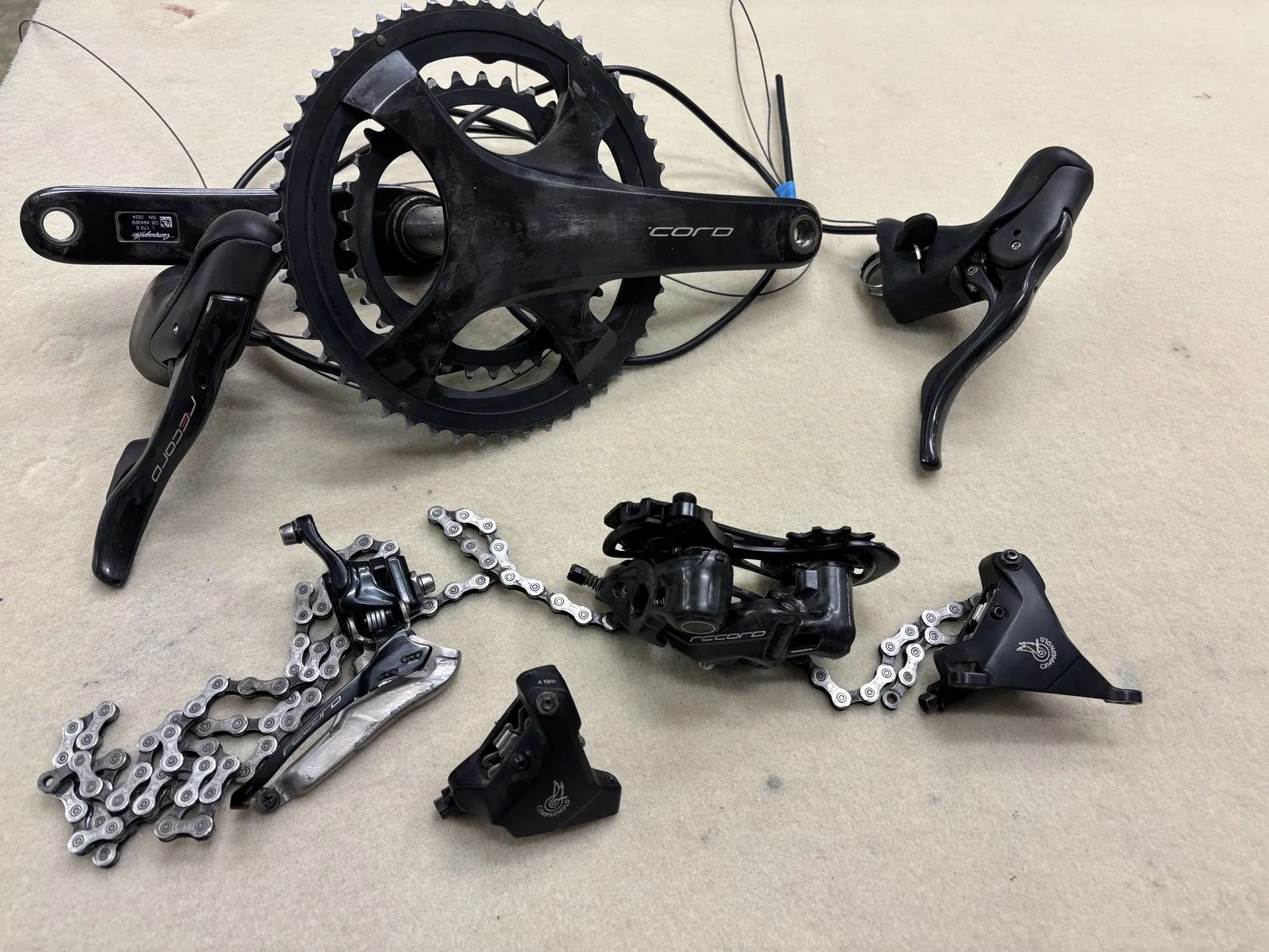 Prodám kompletní mechanickou sadu na kotouče Campagnolo Record 2x12, jetá něco málo přes 3000km. Byla namontována na Mkovem rámu, takže na větší bude stoprocentně nutné měnit hydraulické hadice. Kliky 50/34 mají ošoupaný nápis od treter viz foto. Včetně kazety, která na fotce není. Možnost prohlédnout v Brně nebo Rousínově.