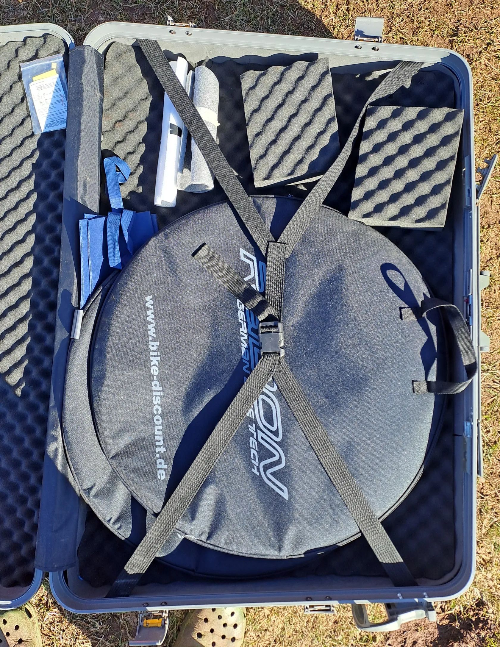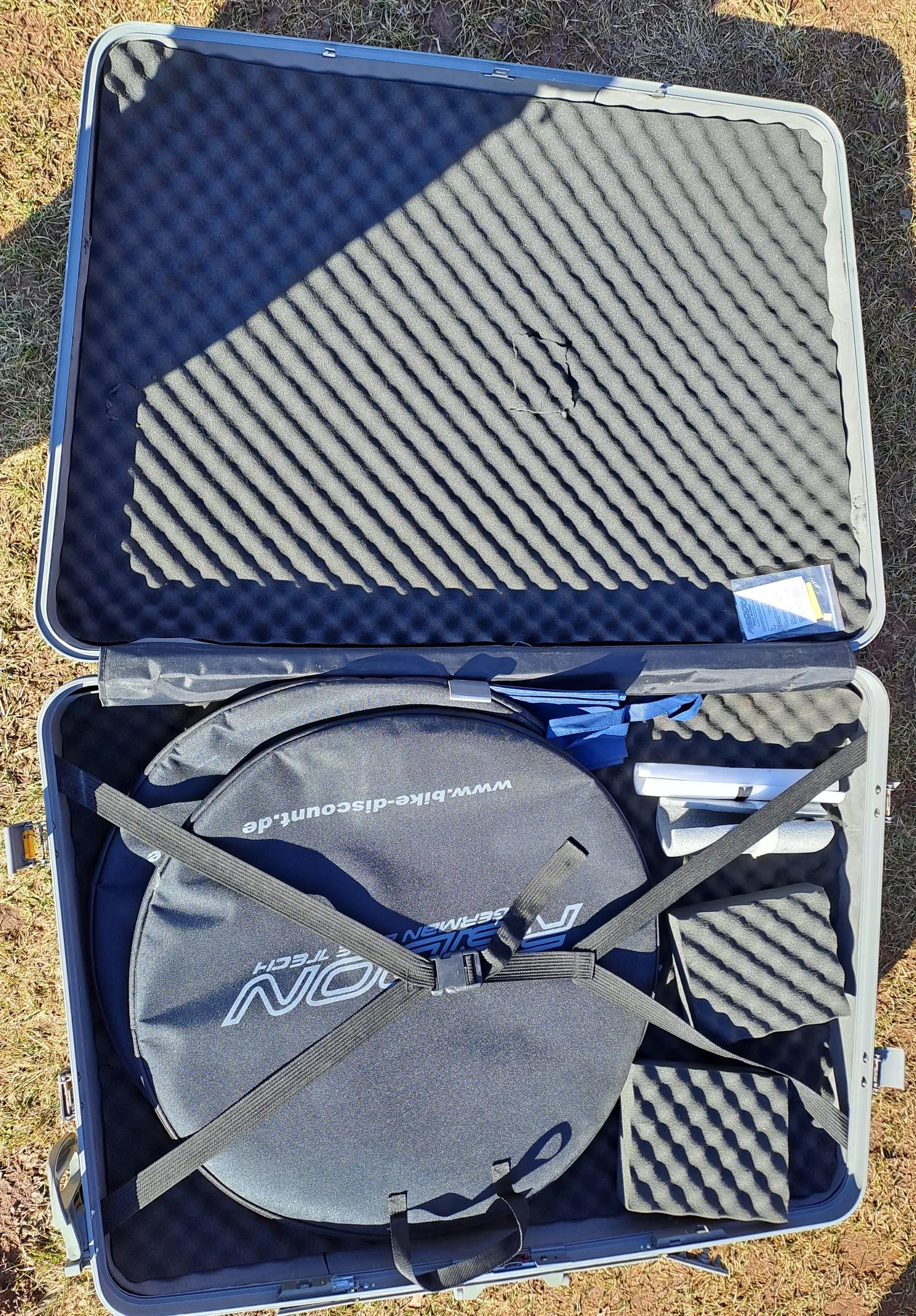 Nabízím k prodeji použitý pevný kufr na kolo do letadla Radon z Německa. Dobře polstrovaný + obaly na kola. Poškozena jedna boční přezka a chybí jedno kolečko (viz foto) - nemá žádný zásadní vliv na funkci. Používal jsem převážně na silničku na Mallorcu, ale už si půjčuji na místě.