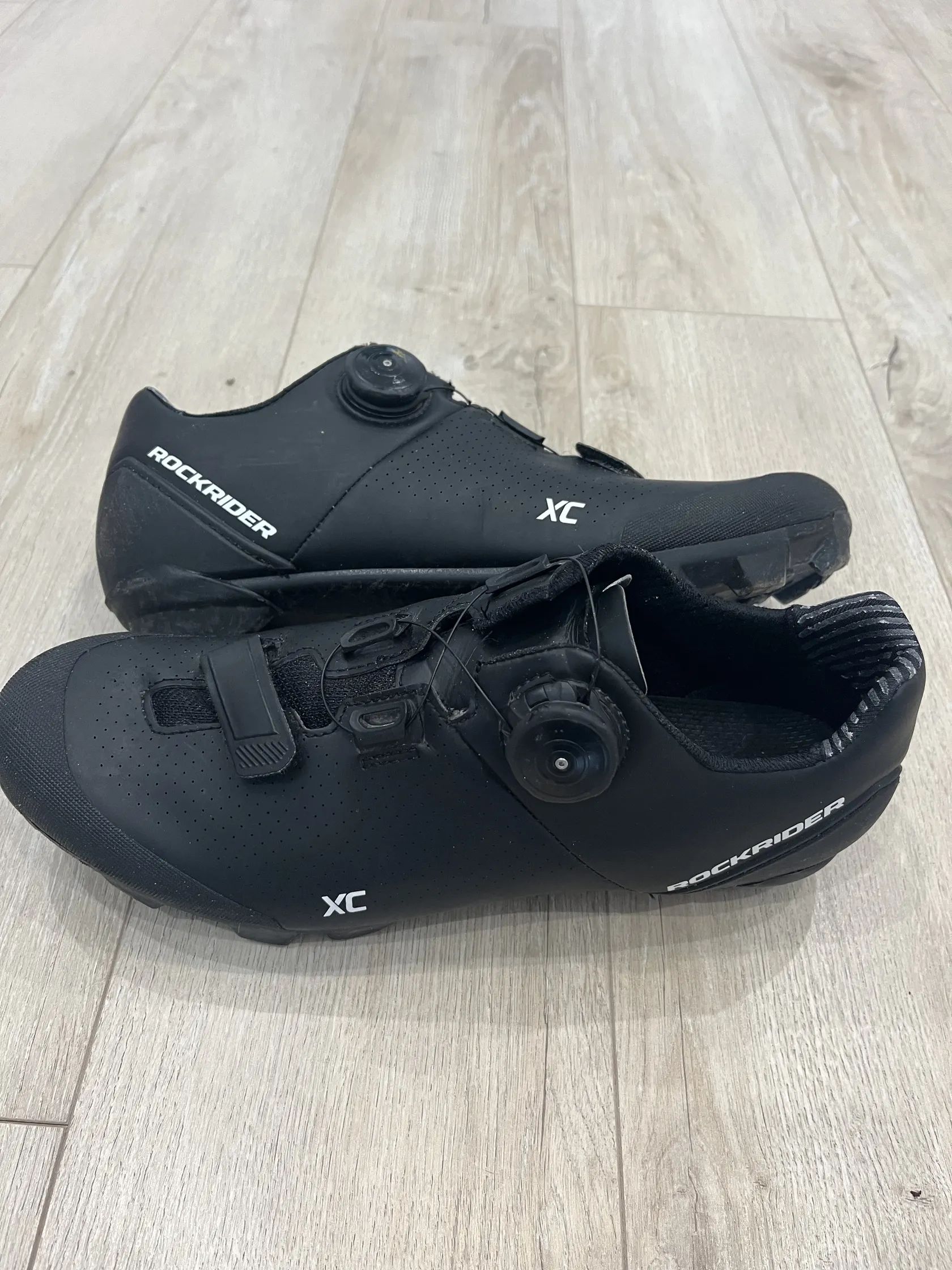 Prodám MTB tretry Rockrider XC 500 v černé barvě, velikost 43 EU. Kupoval jsem je jako použité jako záložní pár, ale bohužel mi nesedí velikost, tak je posílám dál. Boty jsou vybaveny funkčním rychloupínacím kolečkem a jedním suchým zipem na špičce. Svršek je zachovalý, boty jsou čisté a kompletně vydesinfikované. Všechny mechanismy zapínání fungují bez problémů. Spodní strana a podrážka nese klasické stopy užívání od pedálů a chození, což ale nemá vliv na funkčnost. Cena je 400 Kč. Možné osobní předání v Havířově nebo Ostravě, případně zaslání přes Zásilkovnu.