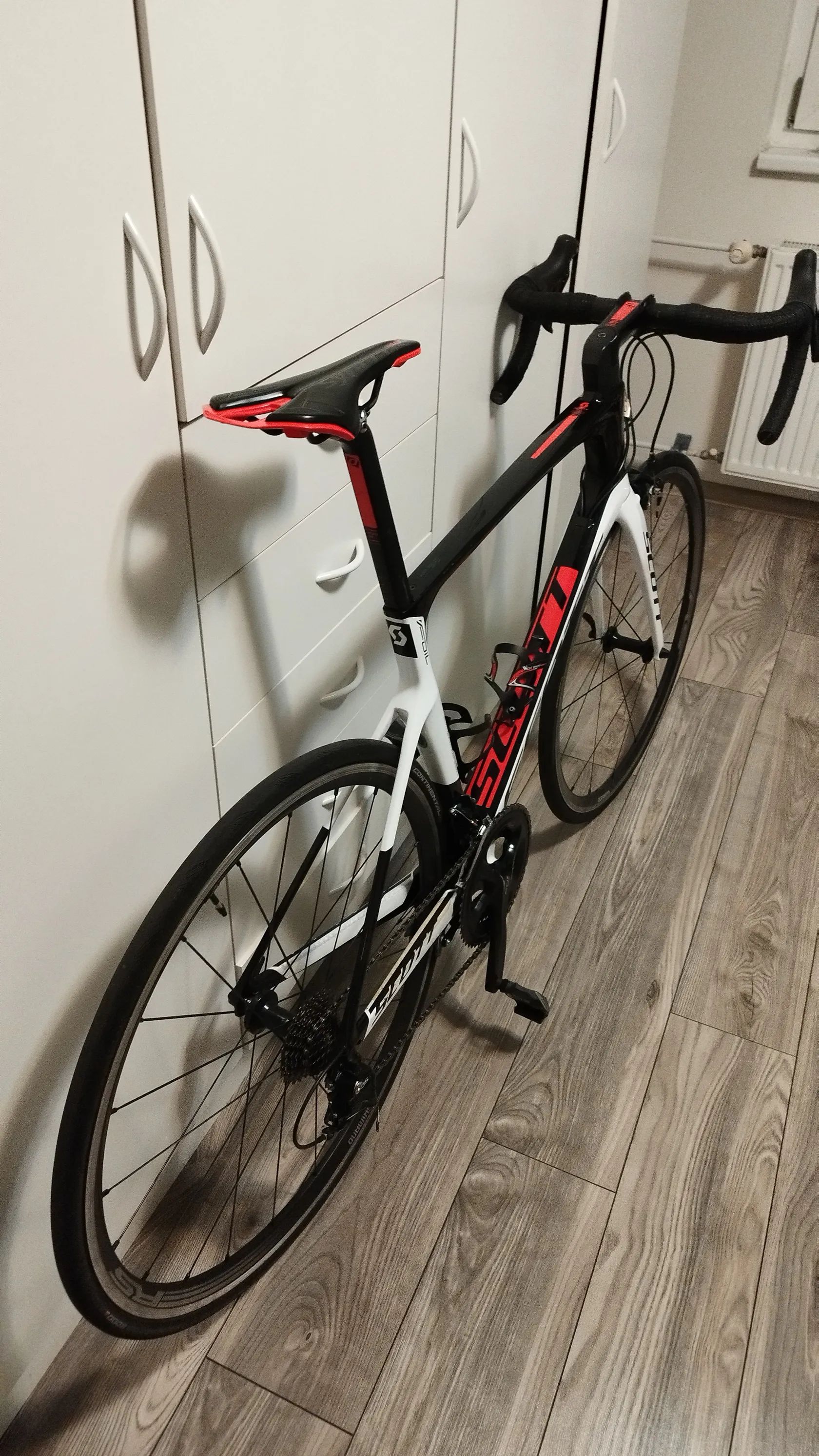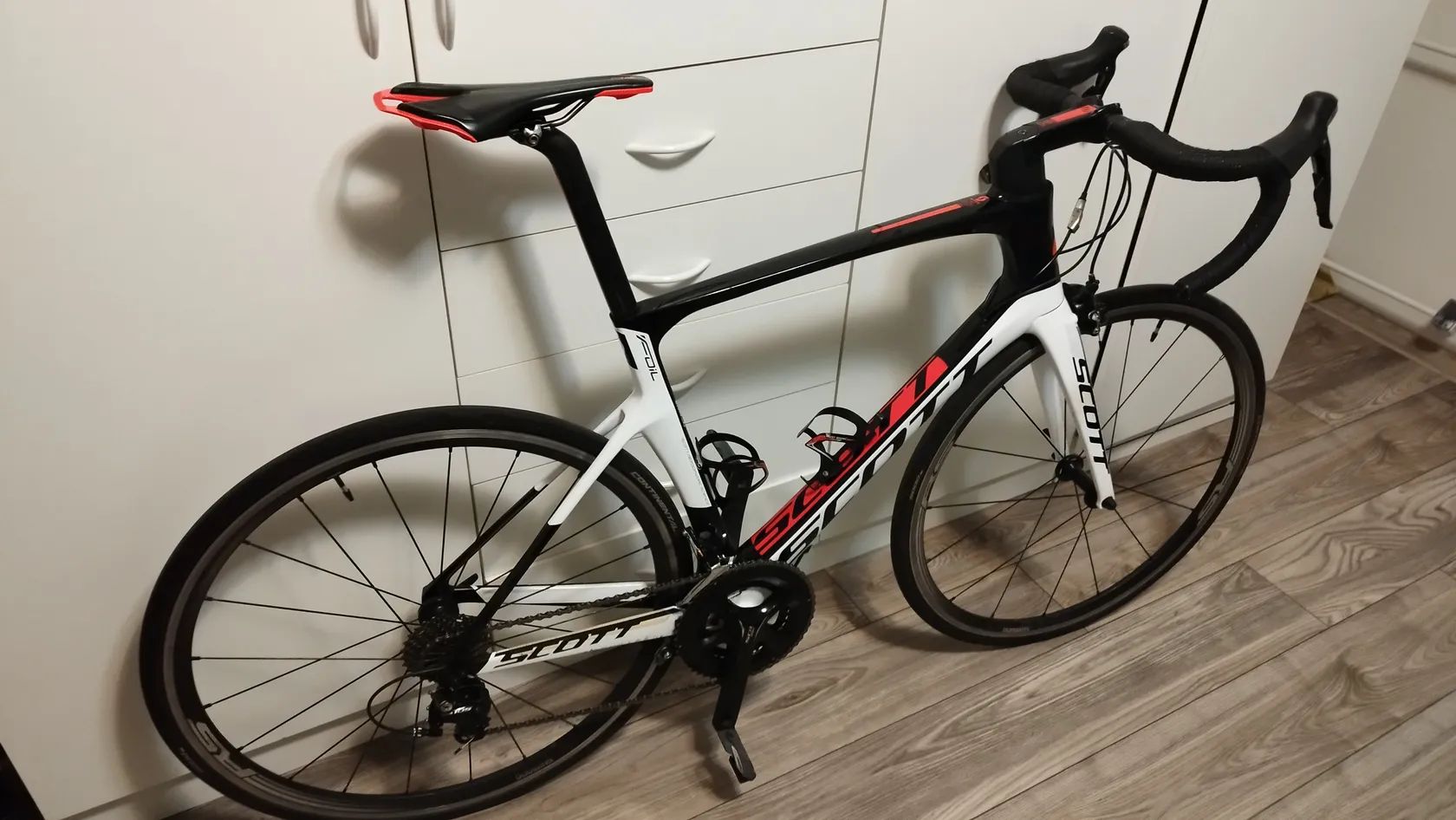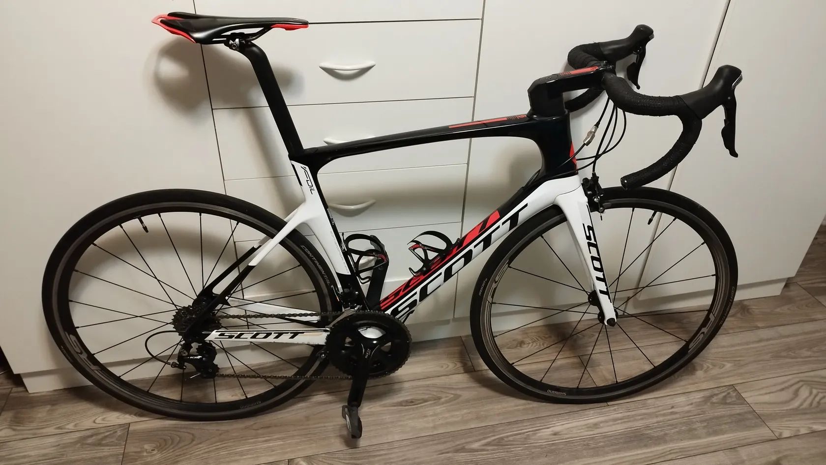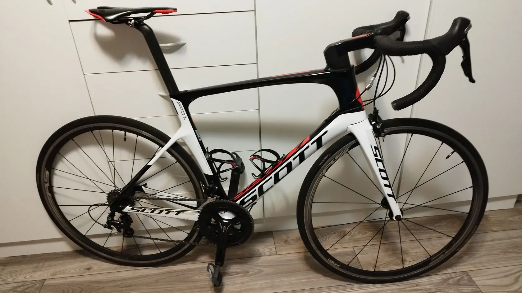 Scott Foil 30 (2017) – Aero silnička na karbonu Popis: Prodám aerodynamické silniční kolo Scott Foil 30, modelový rok 2017. Kolo je postavené na tuhém karbonovém rámu HMF s integrovanou kabeláží a závodní geometrií.