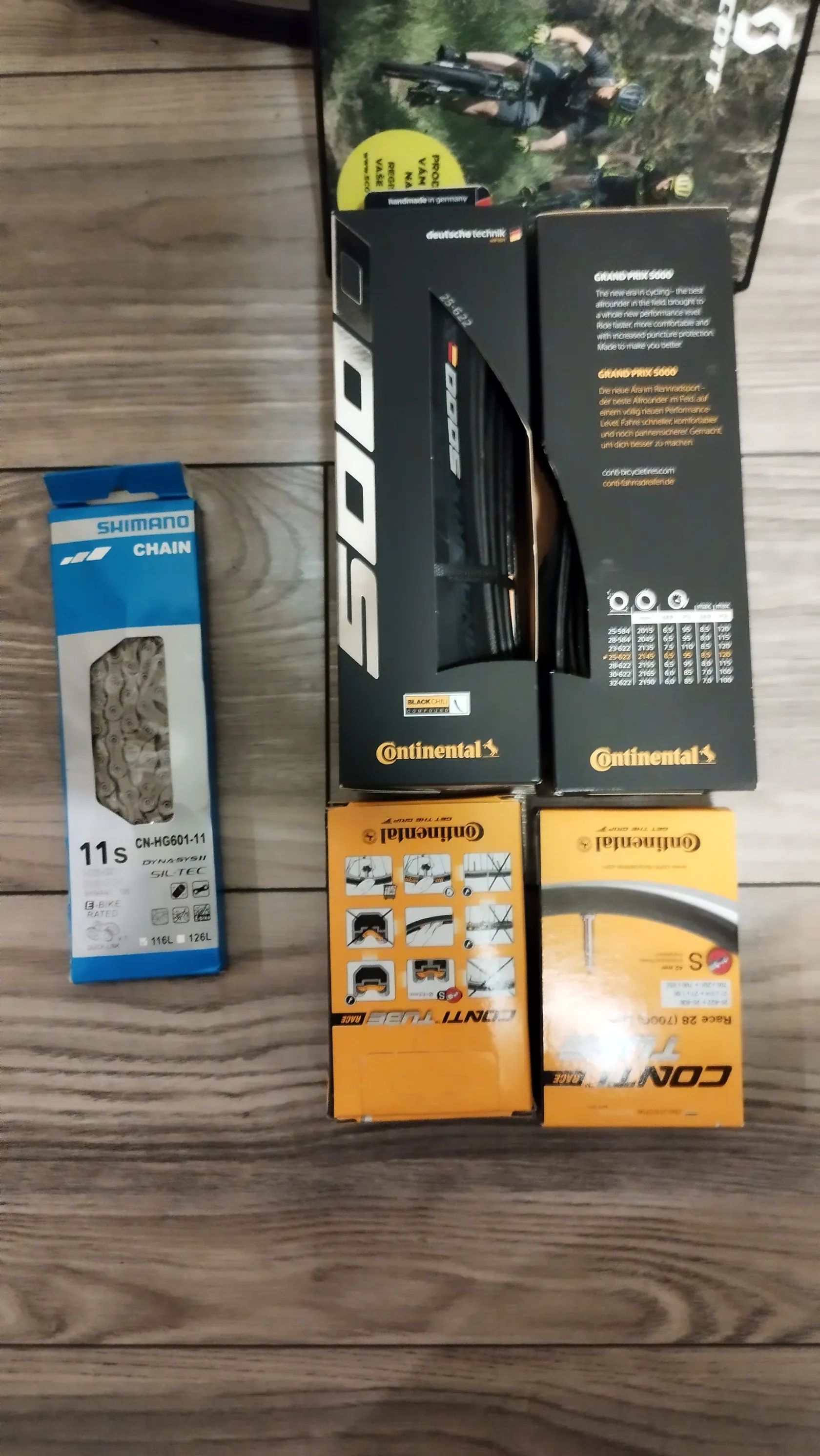 ke kolu přidám 2x nové pláště pláště Grand Prix 5000 25x622, 2x duše Continental race 28 light, nový řetěz Shimano 11s CN-HG601-11