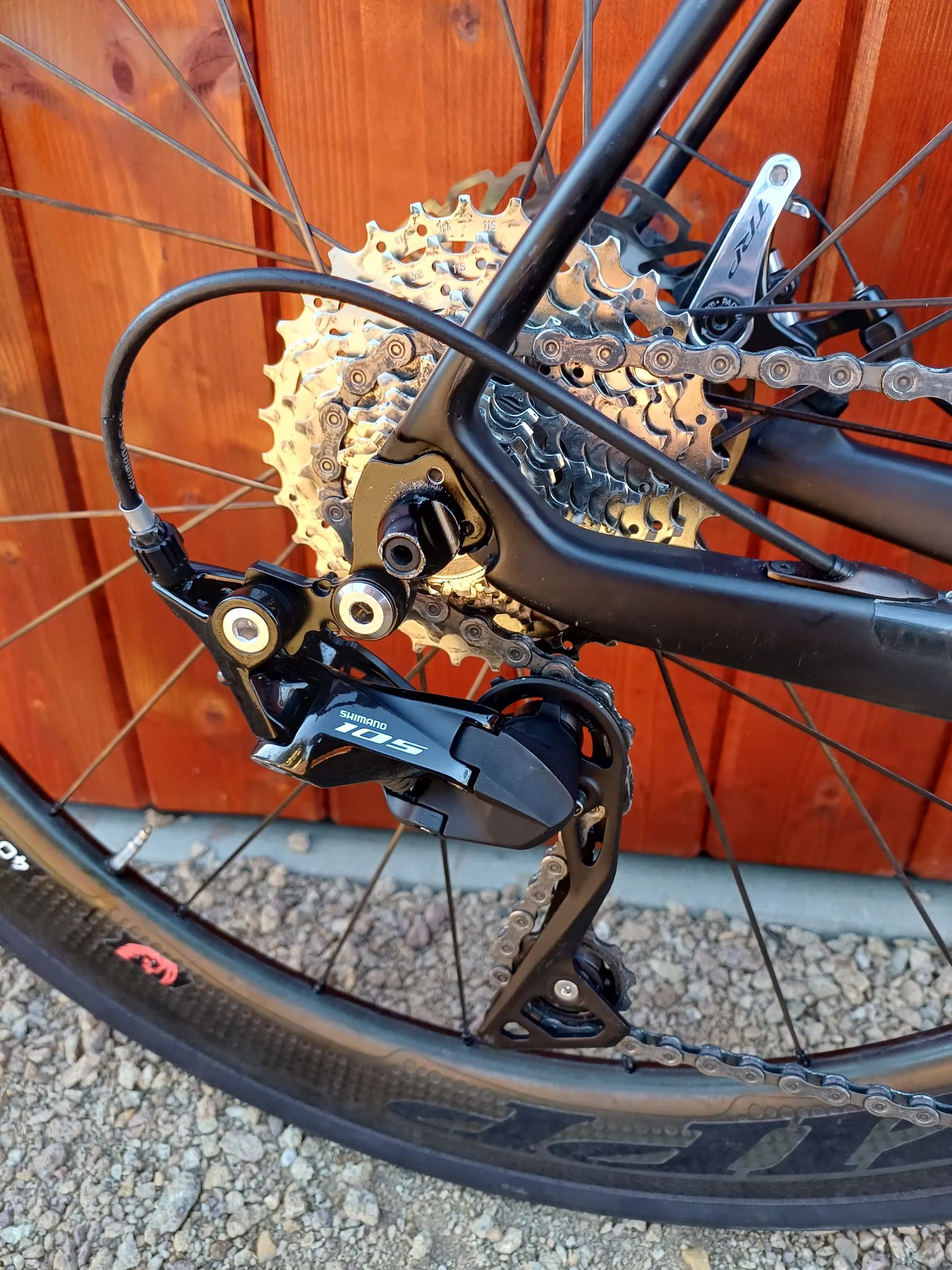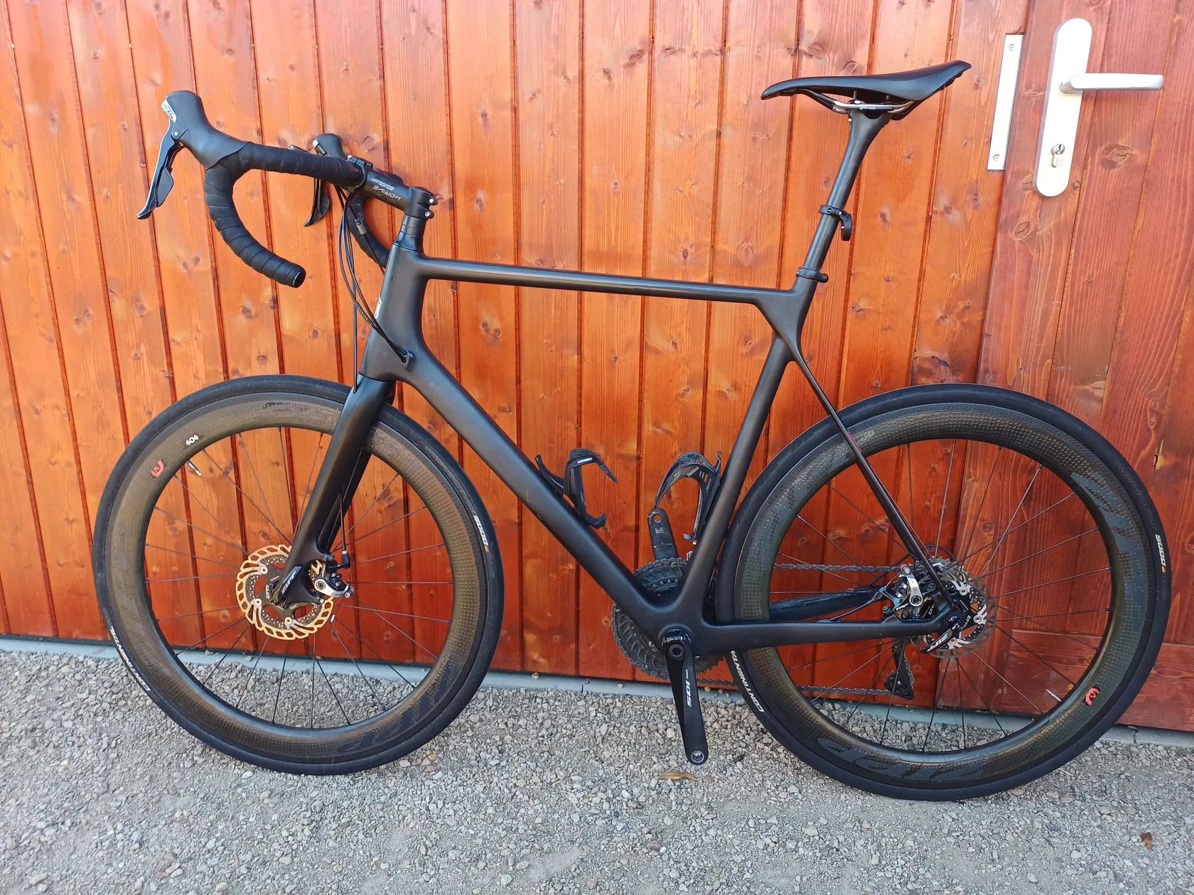 Nabízím k prodeji svoji Black rocket. Jedná se stavbu na rámu pravděpodobně Canyon Ulimate bez polepů. Mechanická sada Shimano 105 R7000. Převodník 52-36, aktuálně 11 kazeta 11-32, přidám ke kolu 11-28. Karbonová kola 40mm, vysoká osazená plášti GP5000 šíře 28, zadní je nový. Mechanické kotoučové brzdy ZTTO. Kolo váží kolem 8kg. Nechám i s hliníkovým držákem na Garmin.