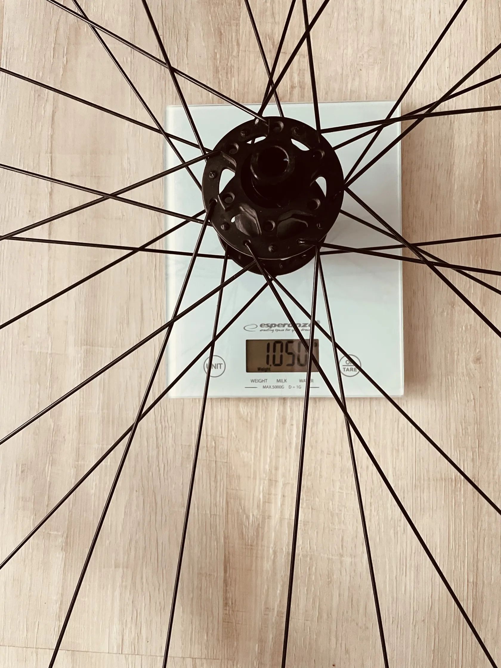 Přední kolo 879g, ráfek vnitřní šířka 27mm, osa 15x110mm, 6 bolt.