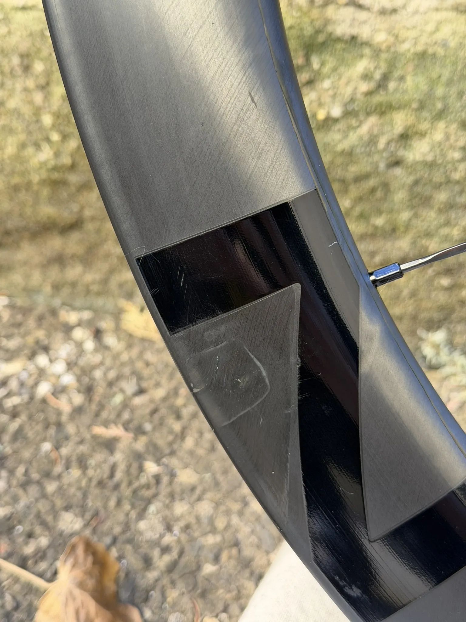 Zadní ráfek byl opravován v profi opravně karbonu, opravené místo viz fotka. Po opravě odjety dvě sezóny (cca 10 tis km) bez problémů. Z ráfků jsem sundal bezdušové pásky, takže ho lze v klidu celý prohlédnout.