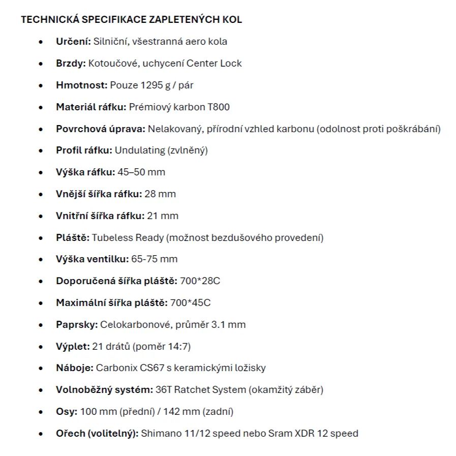 TUHOST A RYCHLOST: Srdcem těchto kol jsou celokarbonové špice (průměr 3.1 mm), které jsou lehčí, tužší a pevnější než tradiční ocel. Spolu s kvalitním ručním výpletem (systém 21 drátů, poměr 14:7) zajišťují nulové ztráty energie a bleskovou akceleraci.