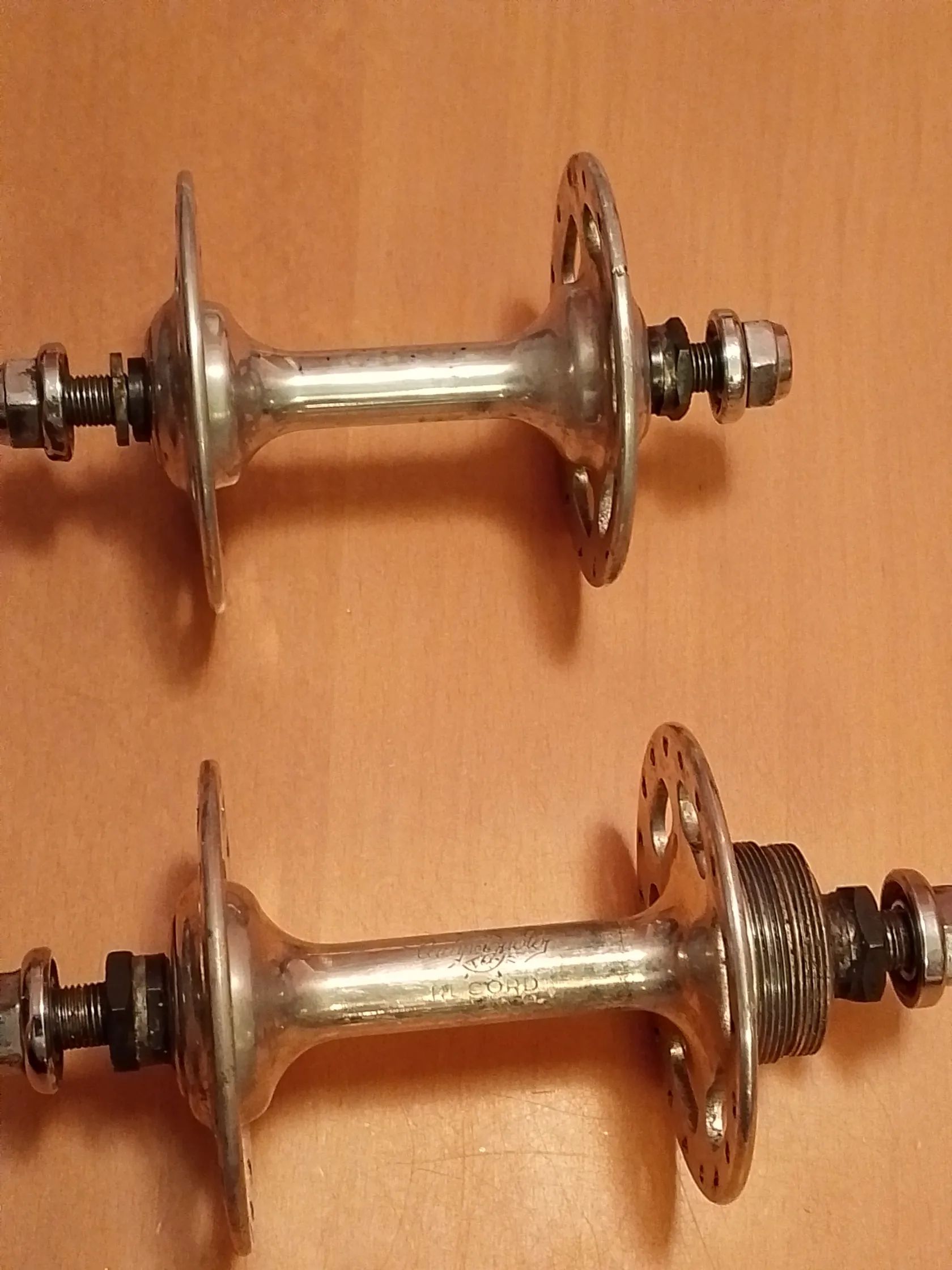 Mám tady na prodej dráhové náboje Campagnolo Record s vysokými flanšemi. Jsou jeté, ale v pořádku.Mám přední i zadní, ale náboje nemají stejný počet děr. Přední má 28, a zadní 36. Prodám buď jako pár, nebo lze i jednotlivě . 1400,- ks.