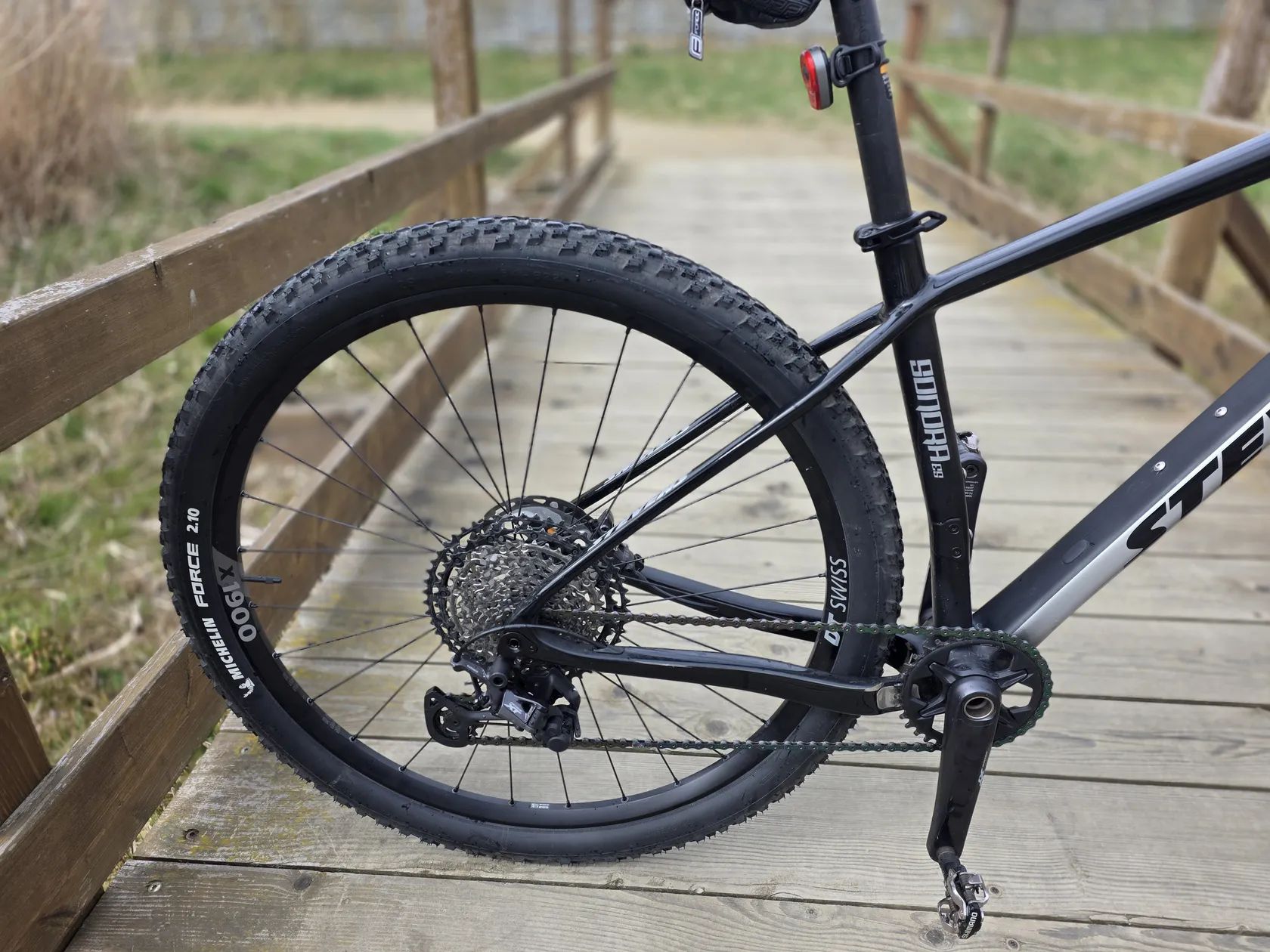 Zvládá lehčí až středně náročný terén, kořeny a kameny v rámci XC tratí