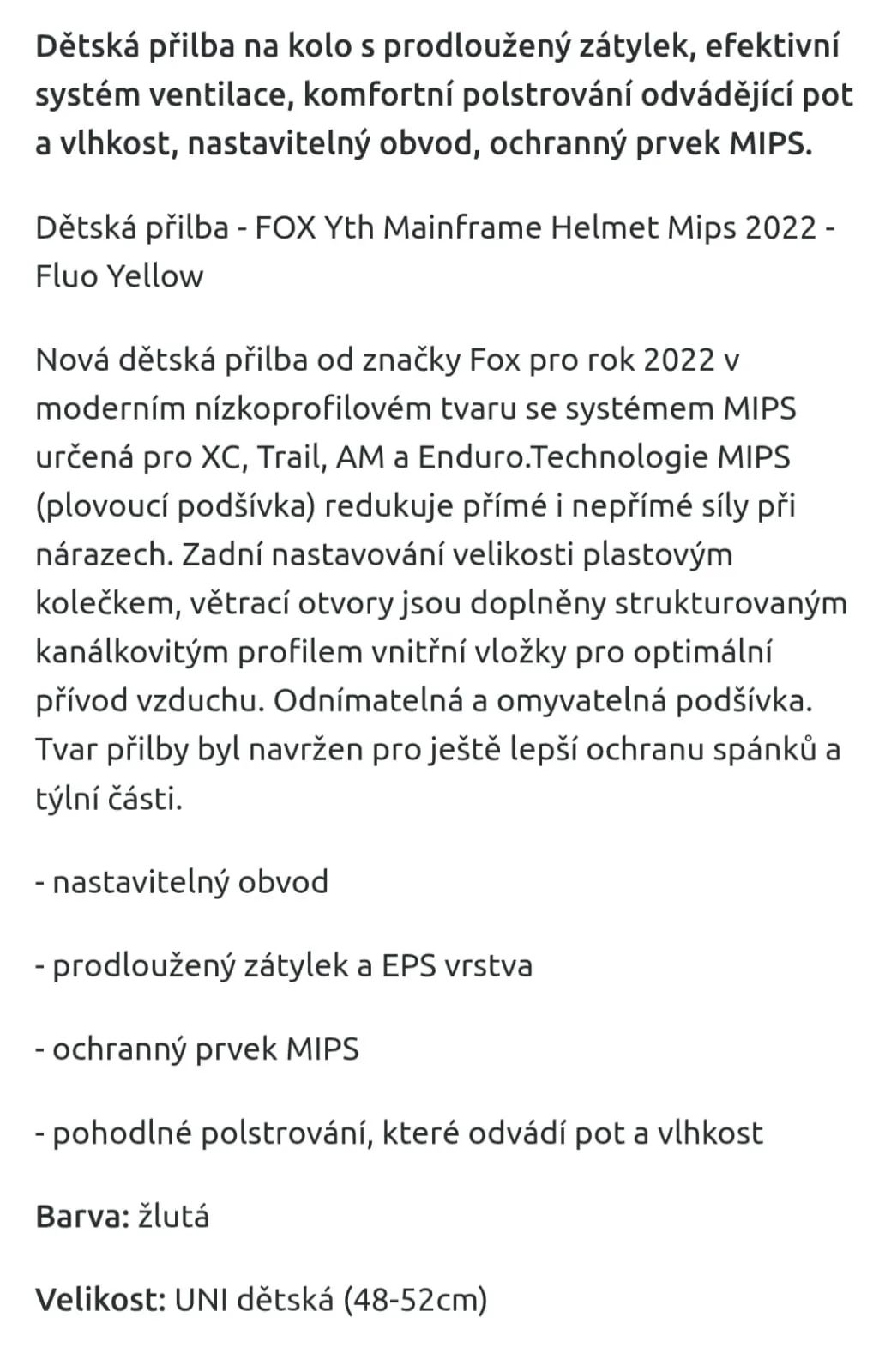 Dobrý den, prodám dětskou helmu FOX Mainframe MIPS ve výrazné fluo žluté barvě. Velikost UNI 48–52 cm. Helma je plně funkční, nepadená. Má jen běžné kosmetické oděrky z používání (viz foto), na funkci ani bezpečnost nemají vliv. PC: 1 690,- Osobní odběr, či mohu zaslat. (Balíkovna/Zásilkovna)