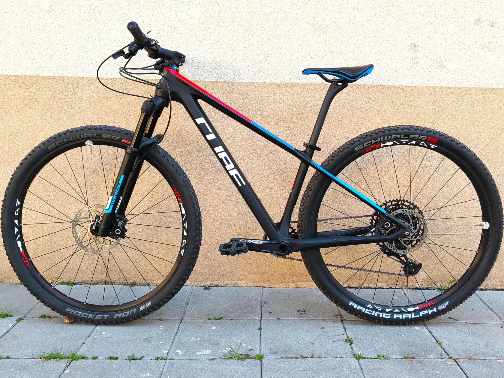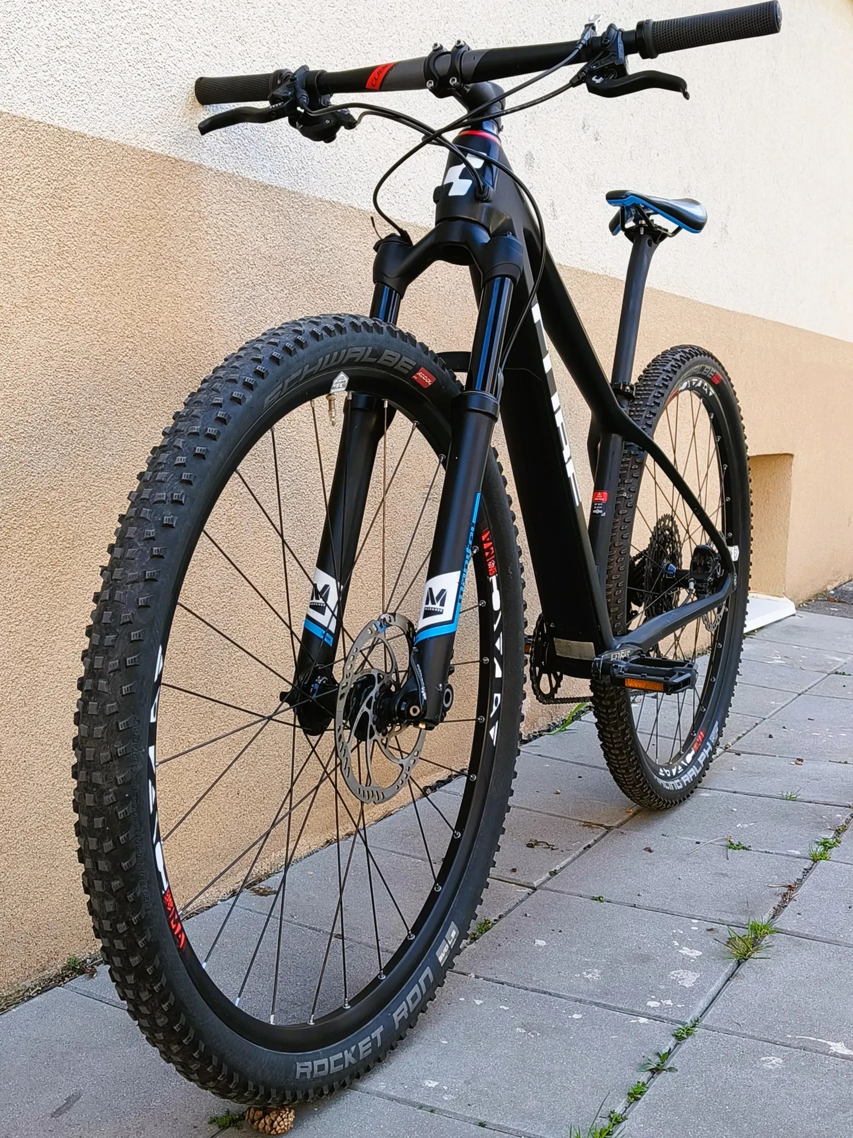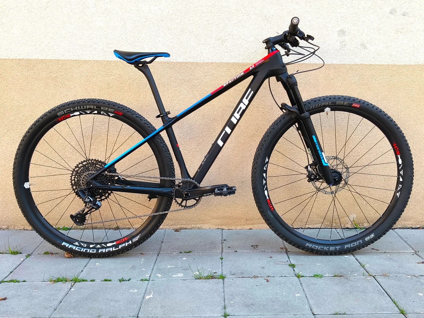 Prodám lehounké carbonové XCčko CUBE REACTION Youth C:62 Teamline rok 2020 v matné černé barvě carbon´n´blue. Velikost rámu je 15"/XS, vhodné na postavu cca 150 - 165 cm, na fotkách seřízeno zhruba na 157 cm. Velikost můžeme na místě dost upravit a přizpůsobit úpravou pozice řídítek, sedla, případně přidám kratší představec. Kolo má navíc měněnou carbonovou sedlovku, na čem se ušetřilo dalších cca 250 g. Hmotnost dle výrobce je 9,9 kg, s touto sedlovkou tedy 9,7 kg. Zároveň tato sedlovka dokáže požírat drobné nerovnosti a jízda je o trochu pohodlnější. Cena samotné sedlovky je cca 1300 Kč. Stav: Kolo je ve skvělém stavu, má pouze drobné, vyloženě kosmetické vady. Přední pneumatika ještě původní, cca 60% dezénu, zadní měněná, zánovní (cca 95%). Kolo právě dostalo nový řetěz, destičky cca 70%. Jediná drobná vada je ne úplně tvrdý lockout vidlice. Ztuhne, ale zamčení není úplně tvrdé (zohleděno v ceně). Chod vidlice je ale velmi hladký a takový, jaký má být. Na kole je vše tuhé, bez vůlí, seřízené a připravené na novou sezónu. Zaměření kola: Kolo je vhodné jak pro dorostence nebo menší postavy. Má moderní XC geometrii a 29" kola, díky čemu je vhodné jak na dlouhé výlety po přírodě, tak i lehké flowtraily nebo jako základ pro závodní kolo. Sviští jedna radost, každým šlápnutím jde ochotně dopředu, perfektní přenos síly do dopředného pohybu díky pevným osám. Výbava: Rám: carbonový, s pevnou osou a vnitřním vedením kabelů Vidlice: Vzduchová Manitou Markhour, zdvih 100 mm Pohon: Sram NX 1x12 Kazeta: Sram XG-1230, 11-50 zubů Brzdy: hydraulické Magura MT4, kotouče 180/160 mm (perfektně brzdí), nastavitelné páčky Plášť vpředu: Schwalbe Rocket Ron 29" x 2,25" Plášť vzadu: Schwalbe Racing Ralph 29" x 2,25" Původní představec, sedlo, řídítka, gripy Hmotnost dle výrobce: 9,9 kg (9,7 kg nyní)