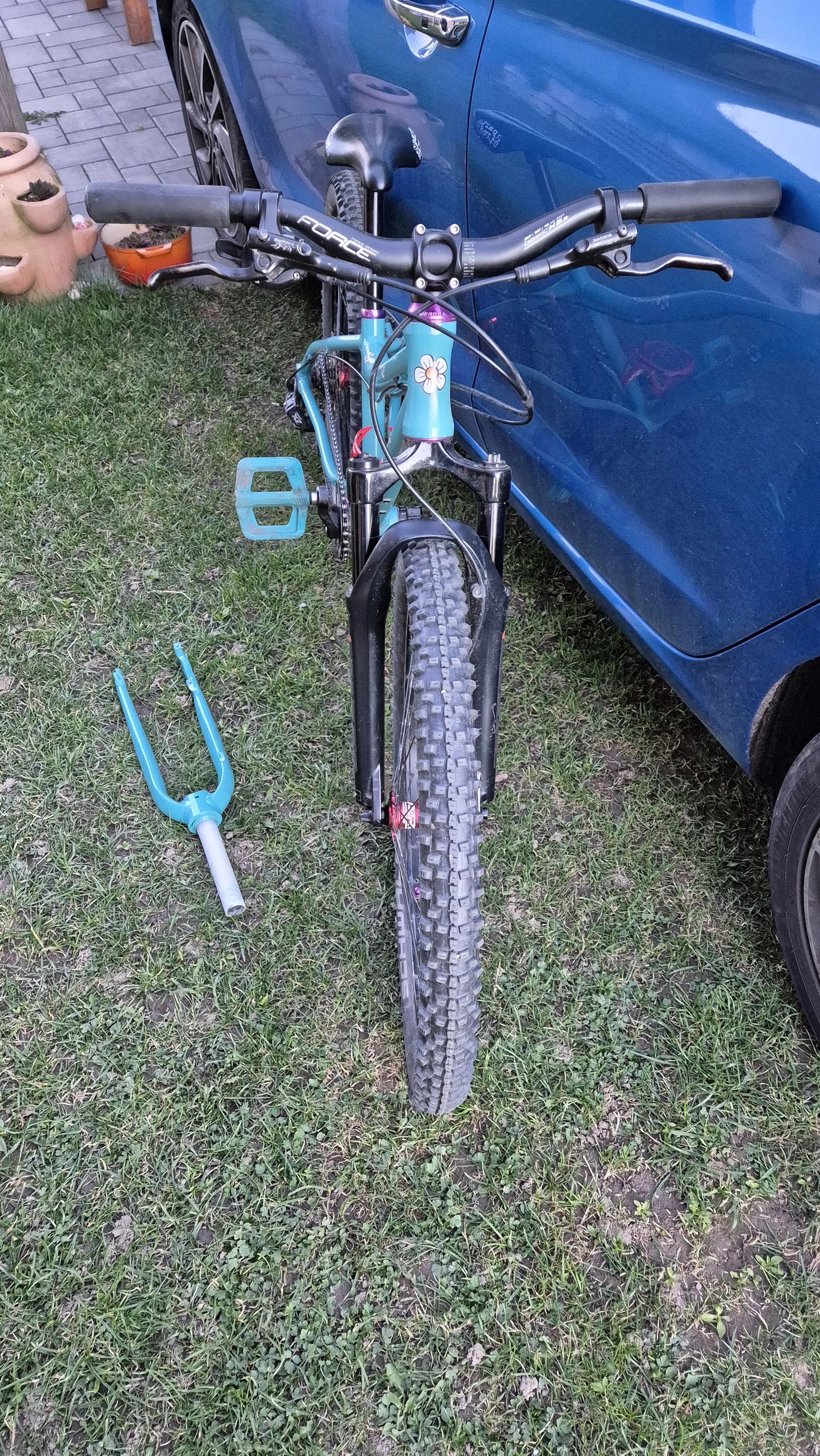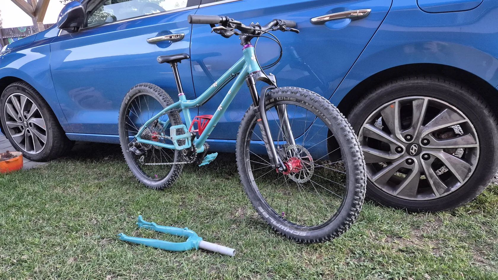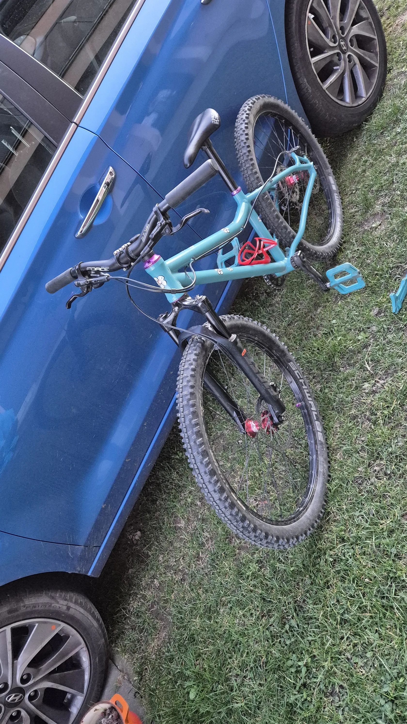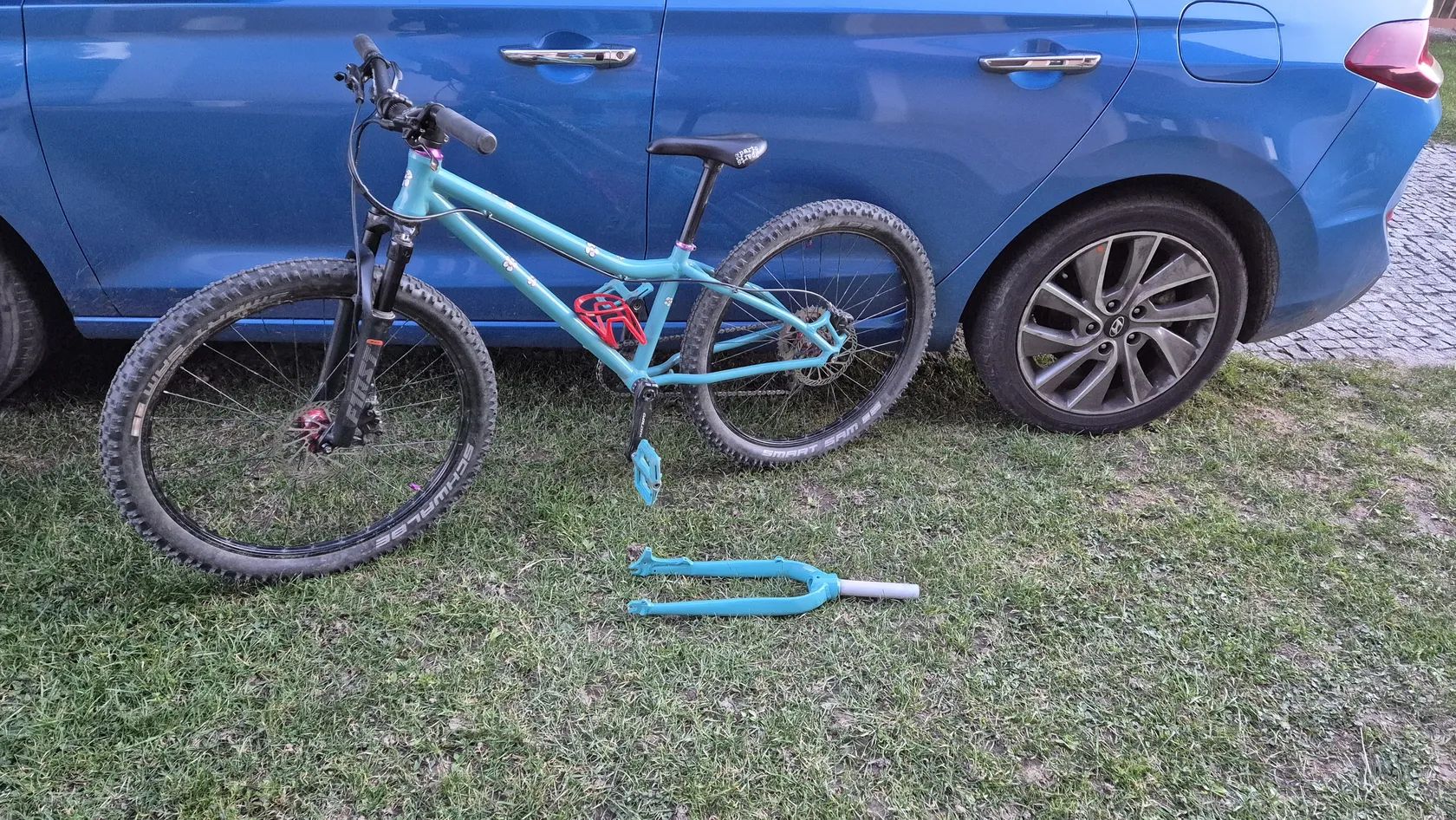Původní Amulet Youngster 24 jsem nechal dceri opiskovat a prelakovat tyrkysovym komaxitem. Jsou tam lehka kola zapletena na nabach z Ali a Remerx rafcich. Shimano kotoucovky. Kratke 127mm detske kliky s prevodnikem 28T. Pohon Sram X7 1x10. Pedaly Race Face. Sedlo se sedlovkou Kubikes nebo najdu klasickou sedlovku a detske sedlo. Fialove dily muzu vymenit za cerne, pripadne dam barevny kratsi predstavec. Mam pripadne i 2 obyc teleskopicke sedlovky, kdyby vase dite chtelo vyzkouset. Cena 10000kc s pevnou vidlici nebo 13000kc s odpruzenou RST First 24.