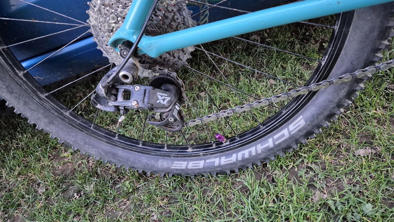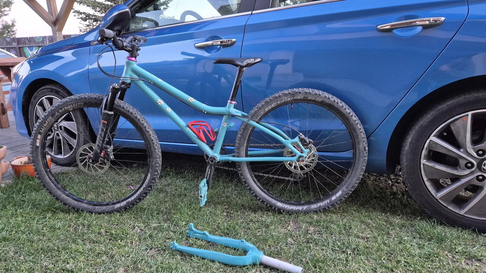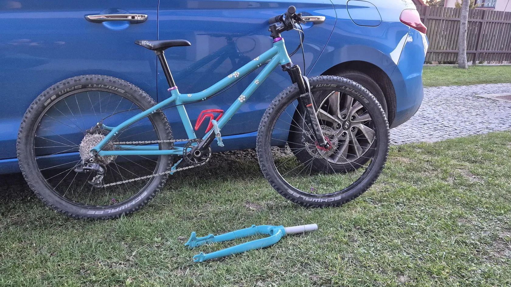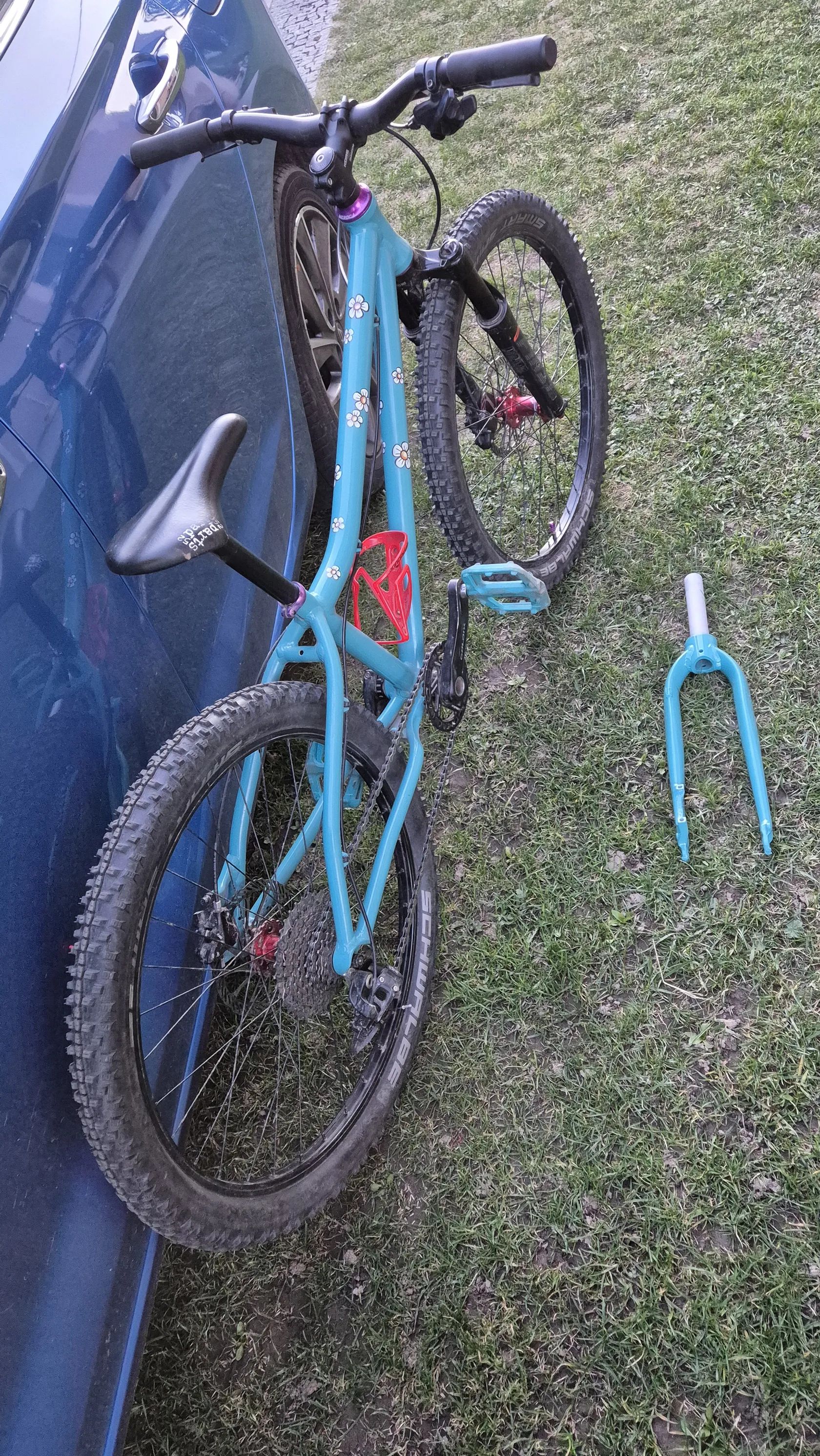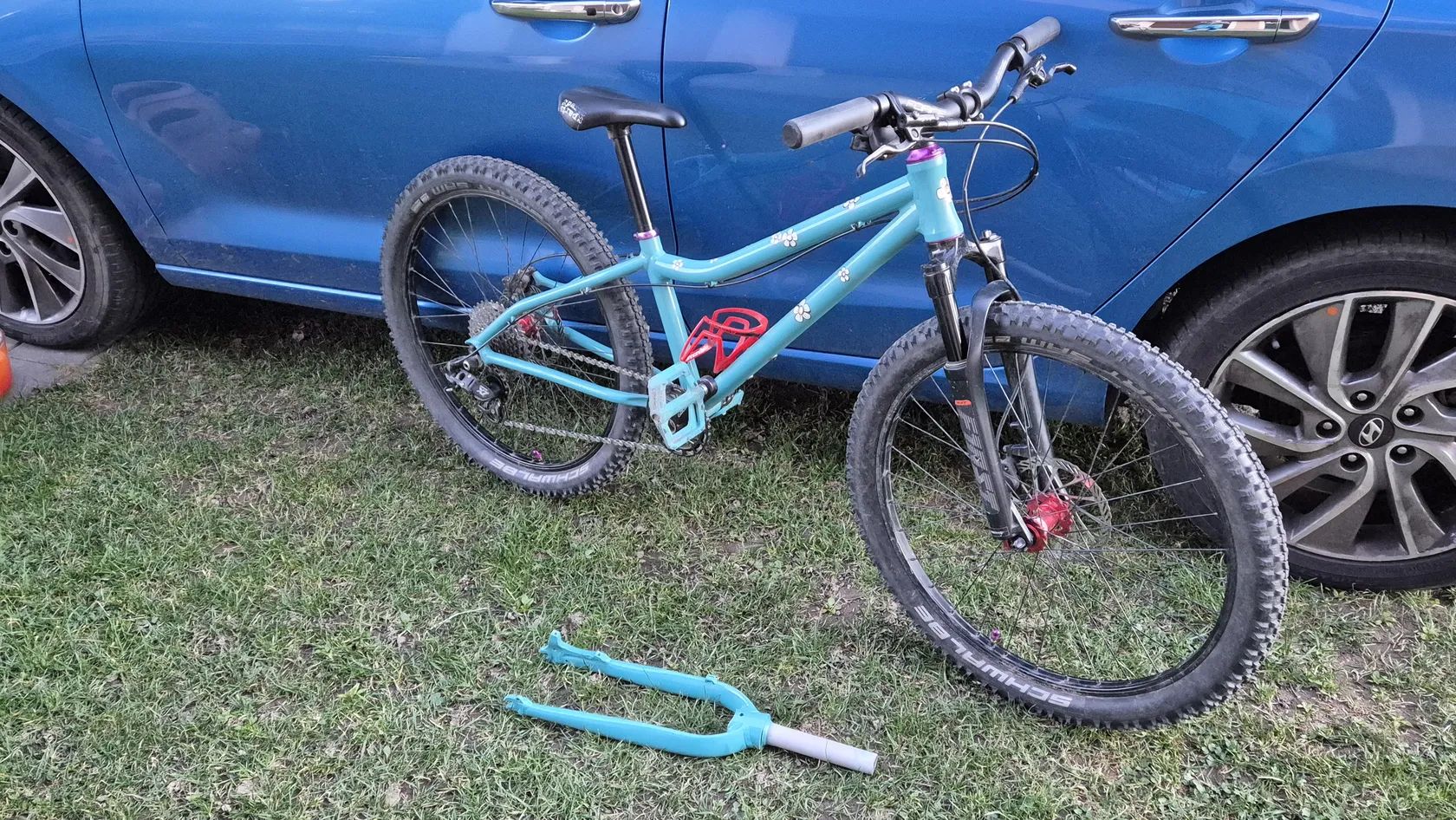 Původní Amulet Youngster 24 jsem nechal dceri opiskovat a prelakovat tyrkysovym komaxitem. Jsou tam lehka kola zapletena na nabach z Ali a Remerx rafcich. Shimano kotoucovky. Kratke 127mm detske kliky s prevodnikem 28T. Pohon Sram X7 1x10. Pedaly Race Face. Sedlo se sedlovkou Kubikes nebo najdu klasickou sedlovku a detske sedlo. Fialove dily muzu vymenit za cerne, pripadne dam barevny kratsi predstavec. Mam pripadne i 2 obyc teleskopicke sedlovky, kdyby vase dite chtelo vyzkouset. Cena 10000kc s pevnou vidlici nebo 13000kc s odpruzenou RST First 24.