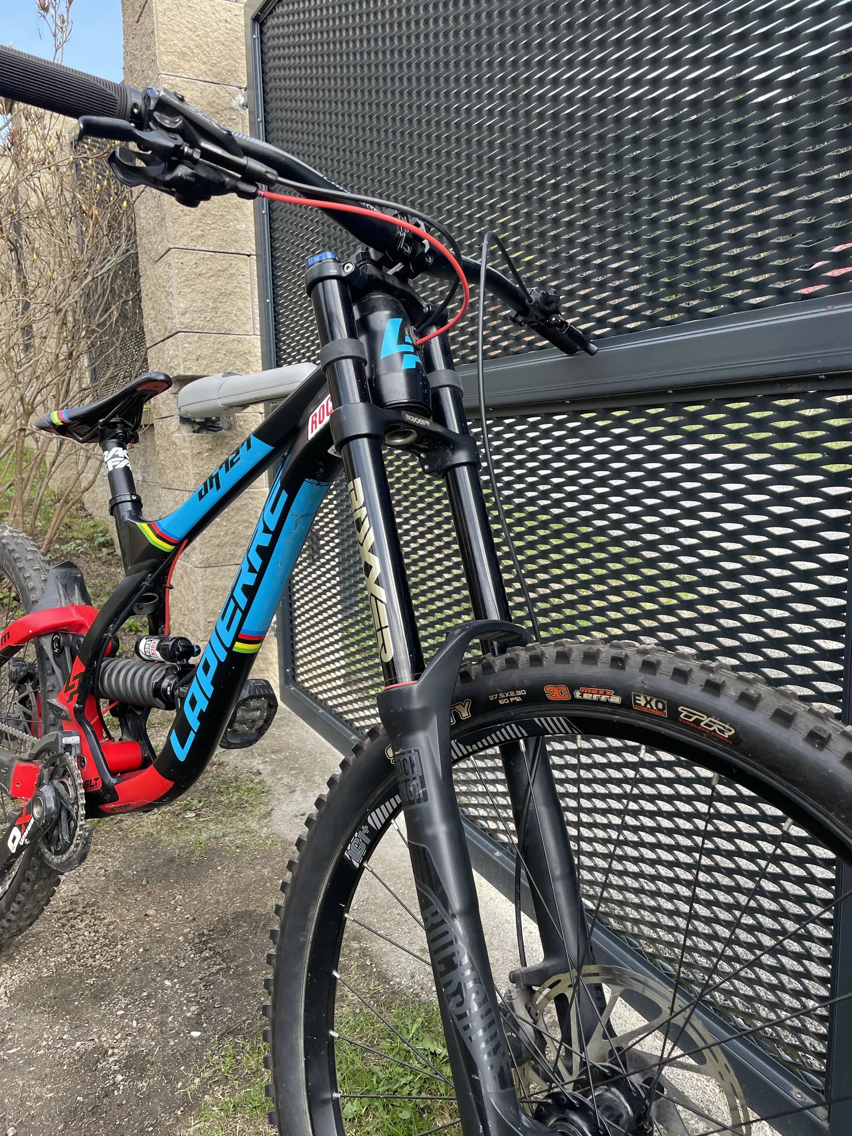 Prodam nebo vyměním za enduro Po úrazu mi kolo stálo celou sezonu v garáži, ale stále má co nabídnout – proto ho posílám dál k někomu, kdo ho využije naplno. Kolo bylo pravidelně servisováno a nenese žádné výrazné vady. Jako u každého ježeného kola se sem tam najde oděrka a zadní kolo má mikro osmičku, ale nic co by ovlivňovalo funkčnost. Při rychlém jednání možná sleva. Pro více fotek nebo informací pište na tel. Výrobce: Lapierre Model: DH 727 Materiál: Hliník (Alloy Supreme 6) Průměr kol: 27,5” Zdvih: 210 mm zadní / 200 mm přední Velikost: M Barva: Černá / modrá / červená (Loic Bruni World Champ edice) Rok výroby/modelu: 2017 Přední vidlice: RockShox Boxxer Zadní tlumič: RockShox Vivid Kliky: SRAM Descendant DH Řazení: SRAM GX DH 7 rychlostí Brzdy: Shimano Řídítka: Lapierre 780mm Představec: Lapierre Direct Mount