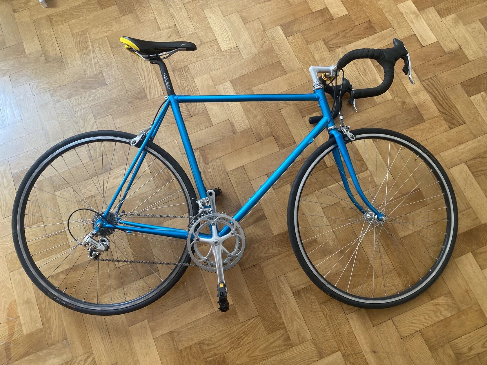 Rám vel. 56, Reynolds 531, krásný nový lak, unikátní odstín metalické modré. Osazení Campagnolo Chorus 170, Campagnolo Mirage, gumy Continental Ultra Sport 25mm.