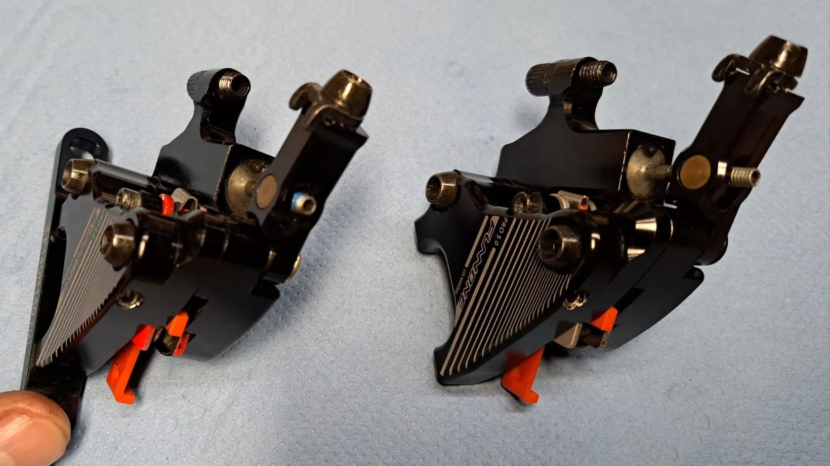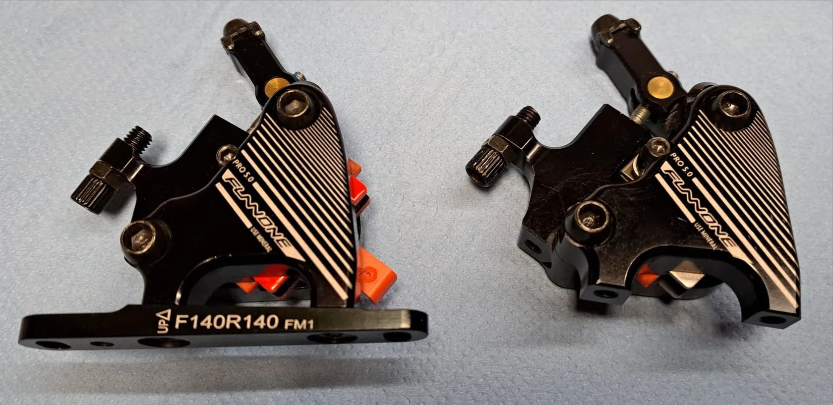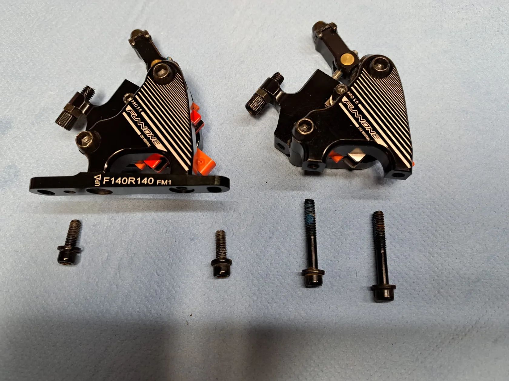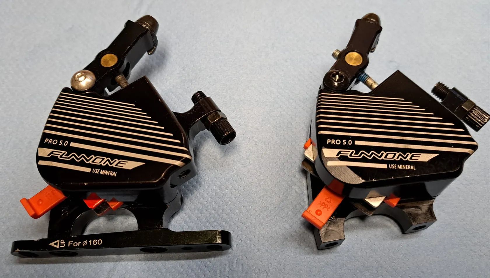 Prodám mechanicko-hydraulické brzdové třmeny. Ve třmenech byla provedena výměna minerálního oleje a byly odvzdušněny. Součástí jsou také upevňovací šrouby. Jsou připraveny k montáži na kolo bez oprav a investic. Brzdové destičky jsou na 80%