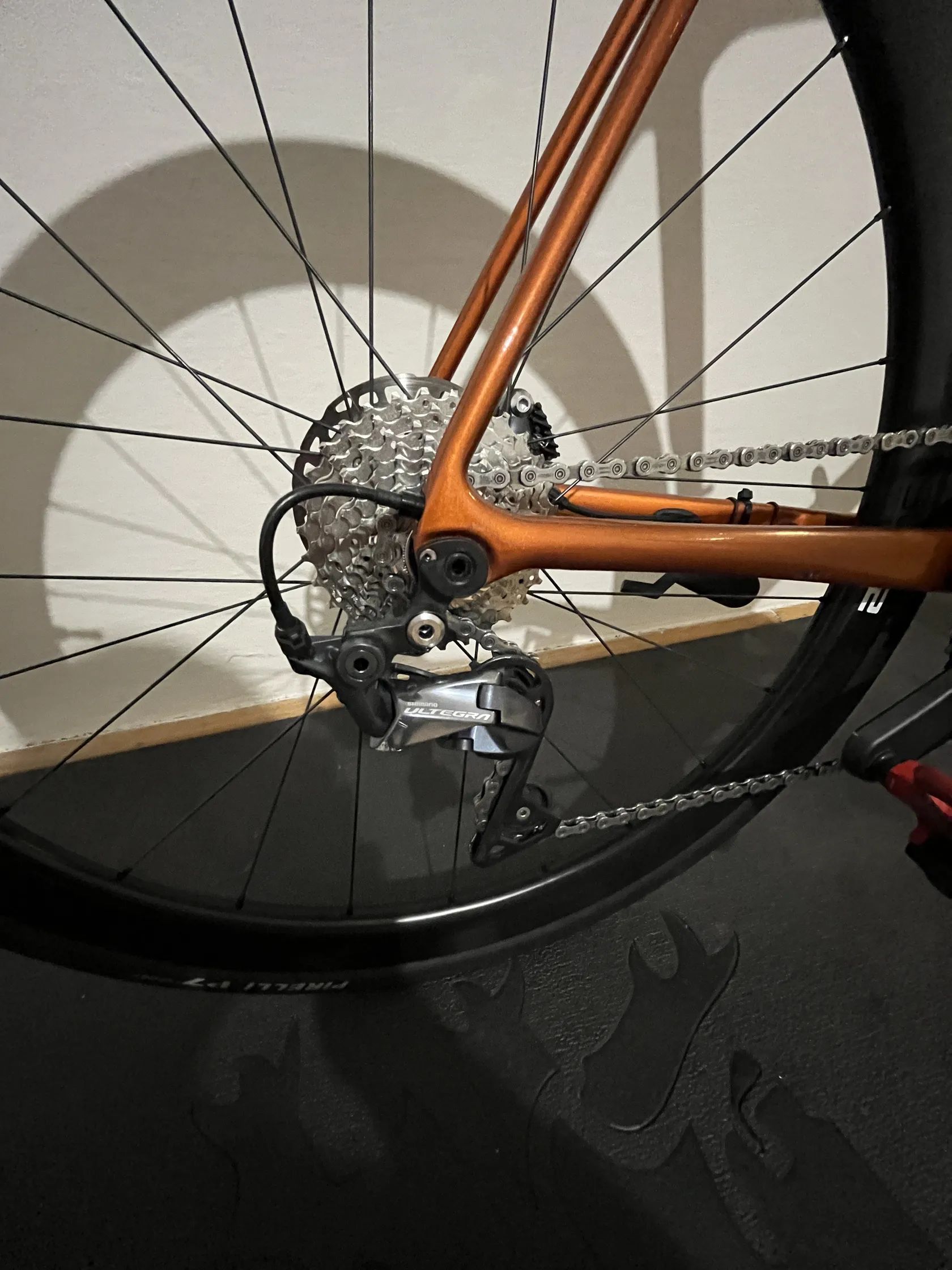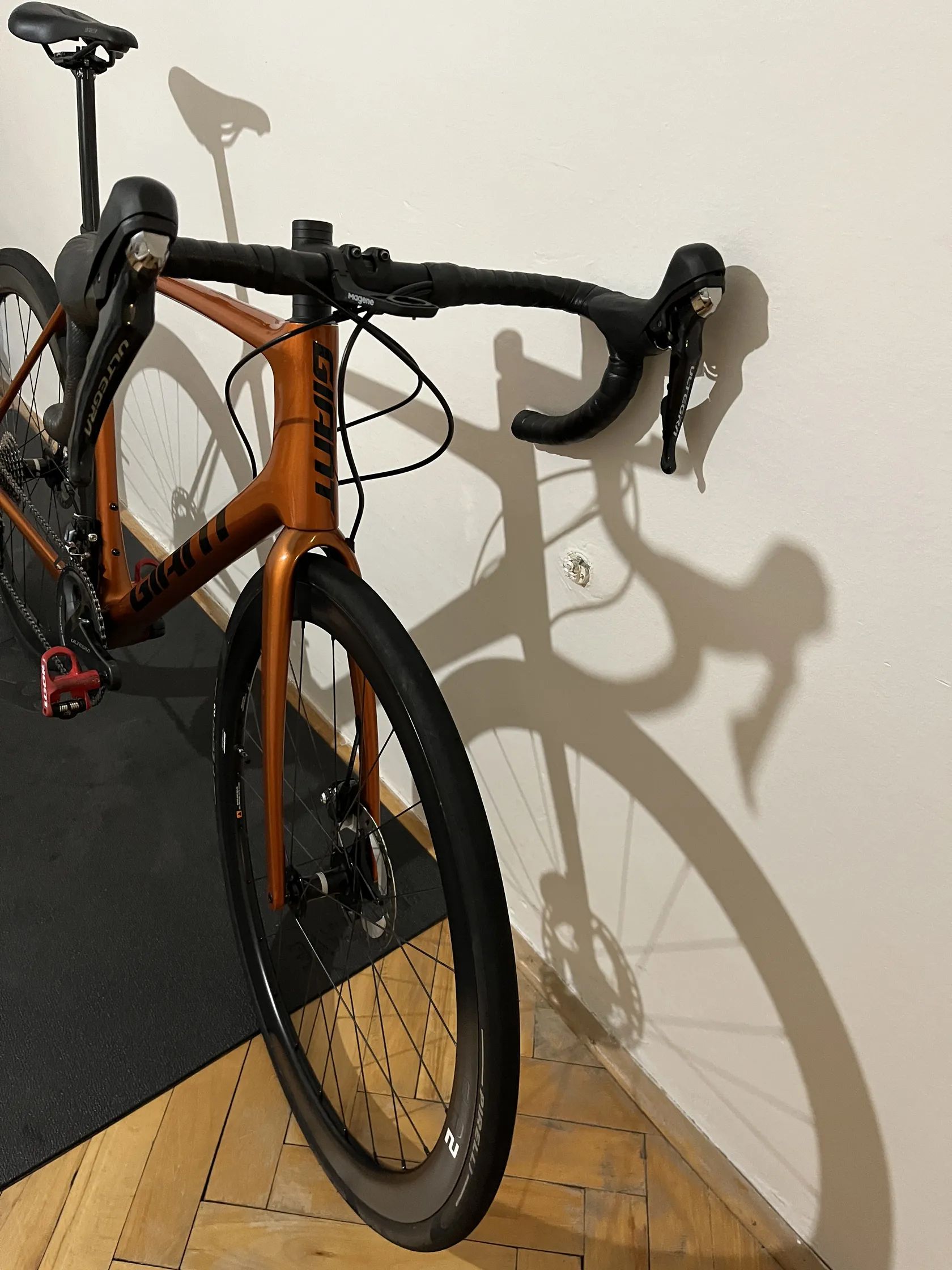 Model: Giant TCR Advanced Rok výroby: 2022 Velikost rámu: L Materiál rámu: karbon Barva: metalická měděná/oranžová Pohon: Shimano Ultegra (2×11) – kliky Ultegra Převodníky: 50/34 Brzdy: hydraulické kotoučové Shimano Ultegra Kola: karbonová zapletená kola (bezdušová kompatibilita) Pláště: Pirelli P Zero 28/30 Sedlo: Fizi:k Antares karbonová sedlovka, Kolo je v dobrém stavu až na jednu odřeninu laku. Preferuji hotovost a osobní předání