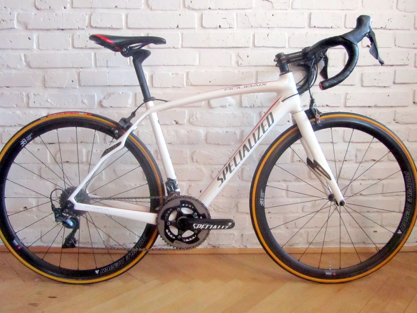 Nejpohodlnější silniční kolo na trhu, pro jezdce cca 160-175 cm Zanedbatelné oděrky, bez známek opotřebení. Karbonový rám, vidlice, sedlovka, kliky, páky dualů! Osazeno sadou ULTEGRA 8000, 11x2sp Kliky 50x34z TOP TOP TOP Karbonová kola PROFILE DESIGN 38/24 PC 40.000 Kč https://road.cc/content/review/149009-profile-design-38twentyfour-clincher-wheels