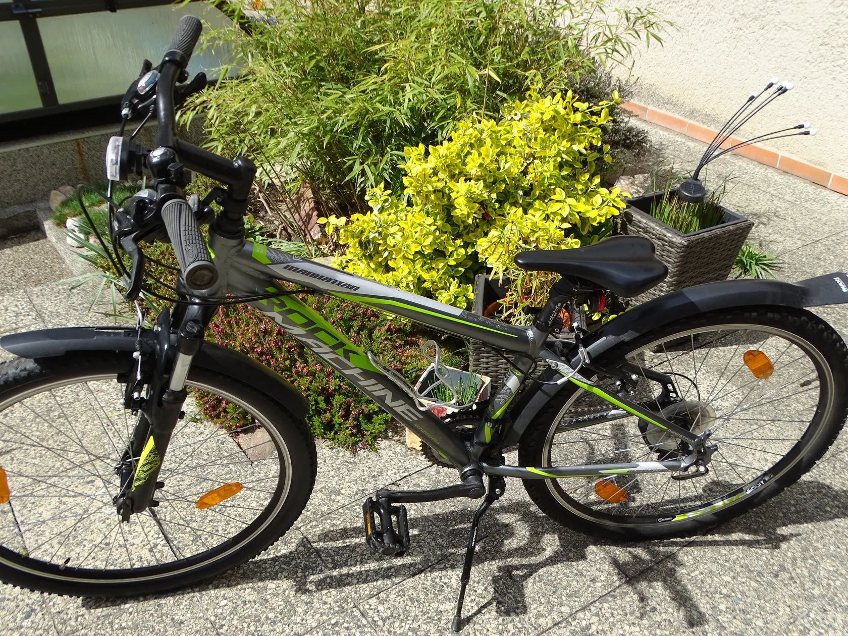 Výbava kola: stojánek, zvonek, košík na láhev s pitím, blatníky, přední a zadní světlo/blikačka