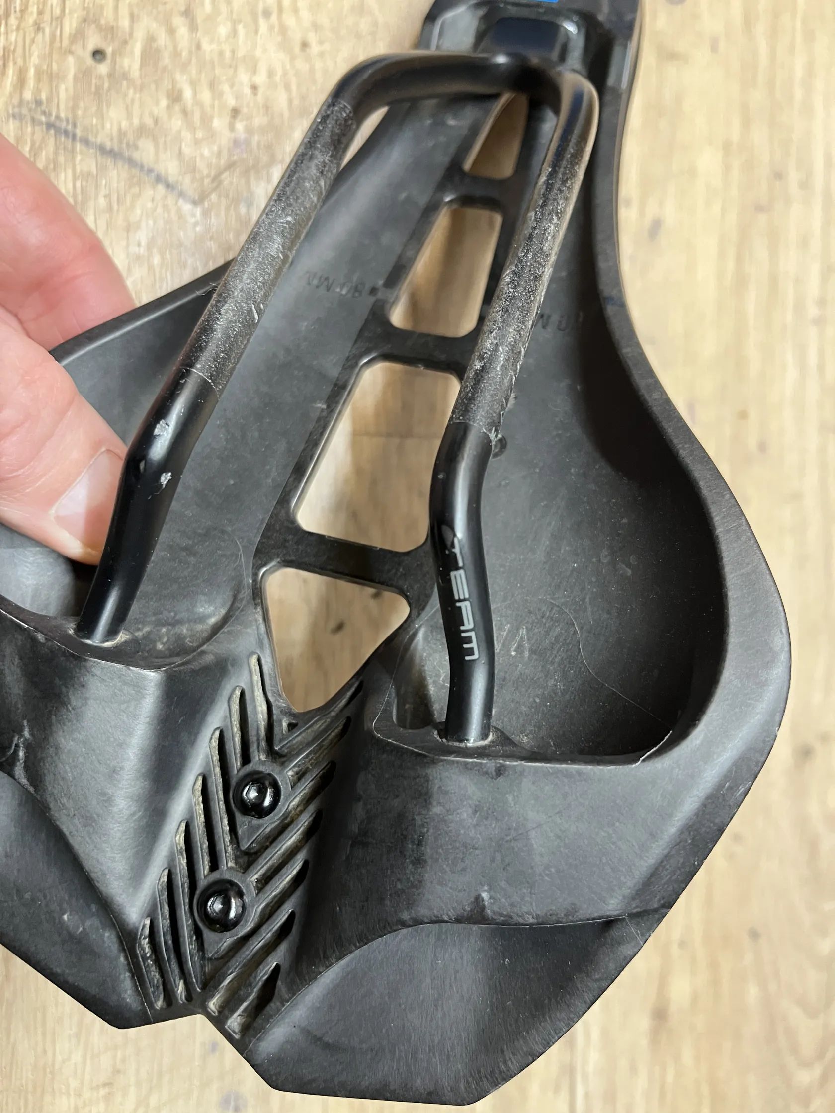 Sedlo je v dobrém stavu, pár oděrek na boční části (plast, karbon nevím, polstrování 100% stav, netknuté) od opírání kola o zeď...