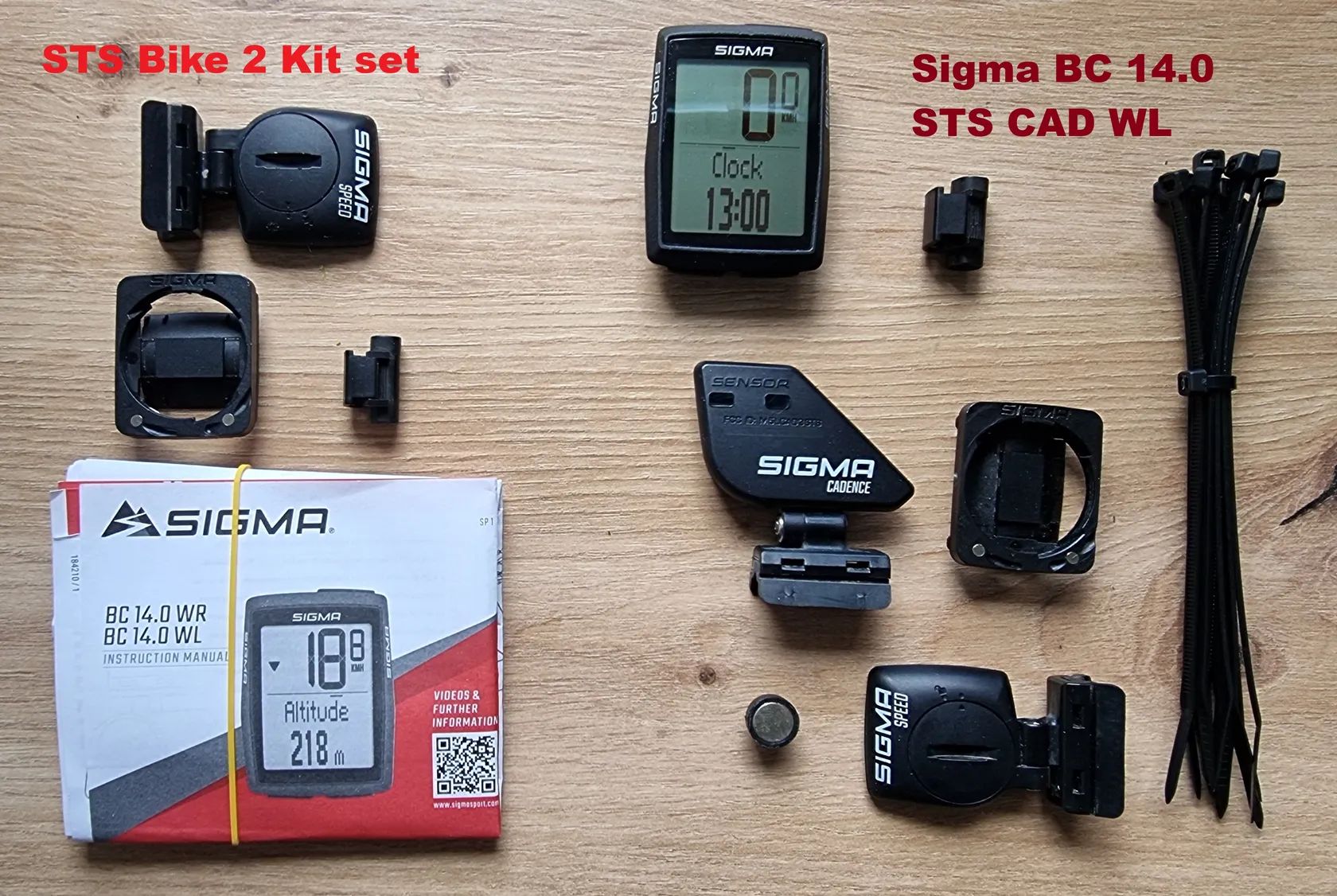 Sigma BC 14.0 STS CAD WL obsahuje: cyklopočítač, STS držák na řidítkal, STS vysílač, magnet, upevňovací materiál, návod k použití, snímač kadence