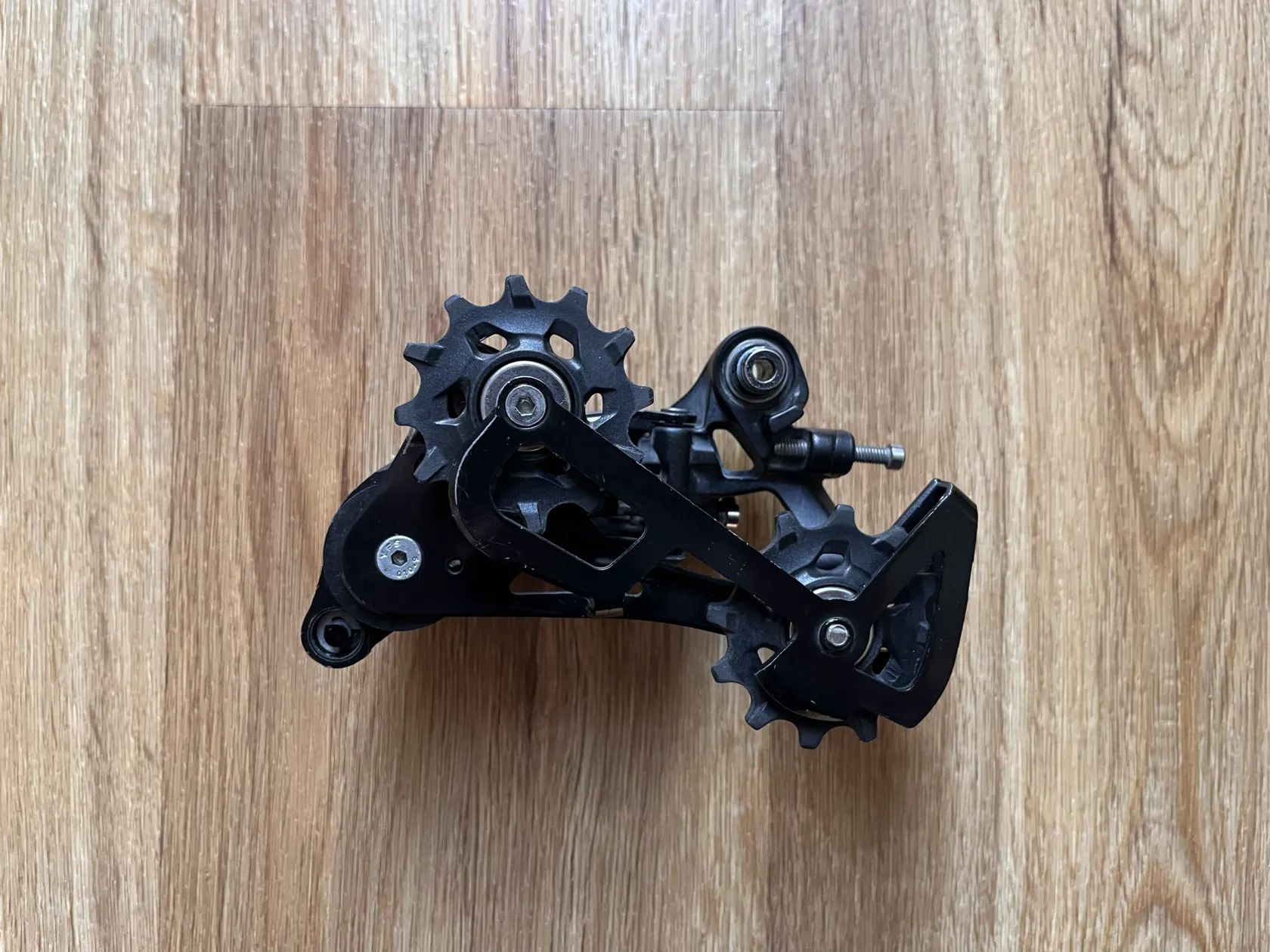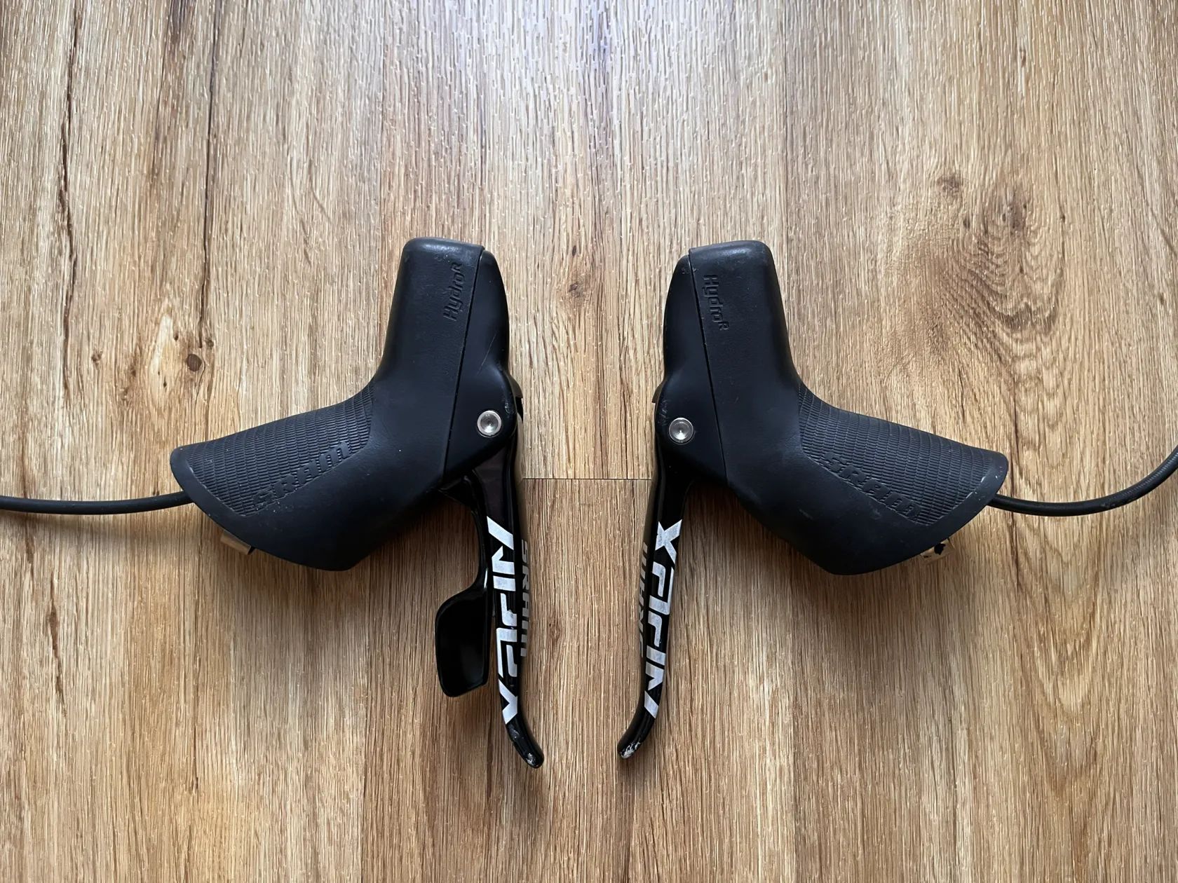 Páky s minimálními kosmetickými vadami, mechanicky plně funkční. Brzdové třmeny v provedení Flat Mount. Kazeta SRAM PG 1170 11-32 zubů s minimálním opotřebením. Přehazka SRAM APEX 1 s dlouhým ramínkem pro kazetu s až 42 zuby.