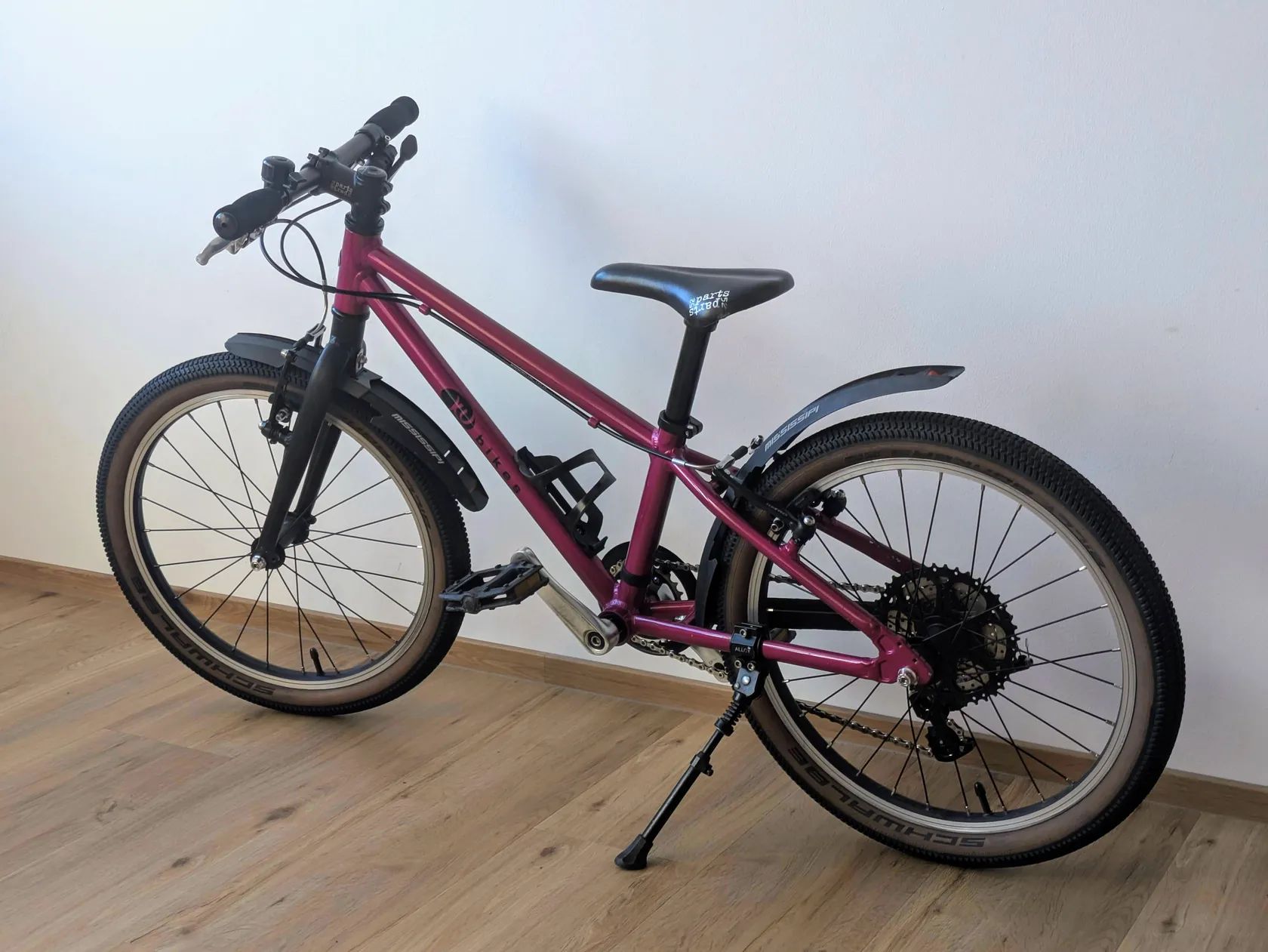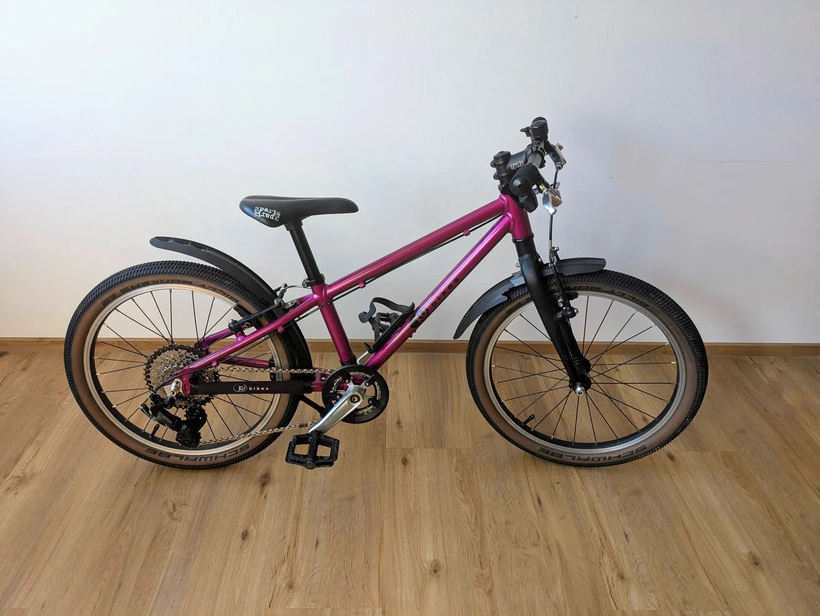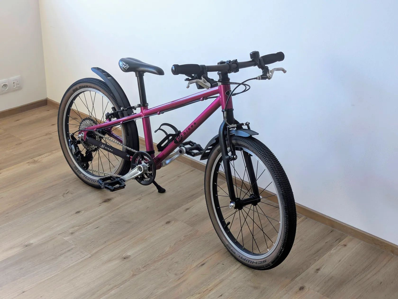 Prodám dětský KUbikes 20L MTB, vhodné od 110 cm výšky, 5 let, 50 cm vnitřní délky nohy Kolo bylo kupováno jako nové, používáno celkem 3 sezóny a v mnoha ohledech vylepšeno: - 9s páčkové řazení Microshift s větším rozsahem Sunshine kazety 11-40z - vhodnější velikost převodníku 26z - voskovaný řetěz SRAM 10s - do začátku kratší kliky 114mm - pláště, duše Schwalbe - stojánek, zvonek, košík na láhev, blatníky - kvalitní lanka, bowdeny Kolo jsem teď kompletně oservisoval, připravené nasednout a jezdit. Ke kolu je dále: - nová náhradní přehazovačka - původní kliky 127mm do druhé sezóny - stavitelný představec - náhradní duše, špalíky, brzdová lanka - sedlovka pro objímkové sedlo - reflexní trubičky do výpletů Osobní předání je možné ve Světicích u Říčan nebo na metru po Praze. Případně ho lze vzít někdy i cestou po dálnici do Teplic nebo Českých Budějovic. Můžu i poslat v krabici od jiného kola, ale přepravu obstará kupující.