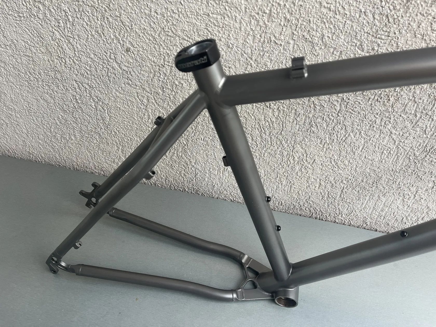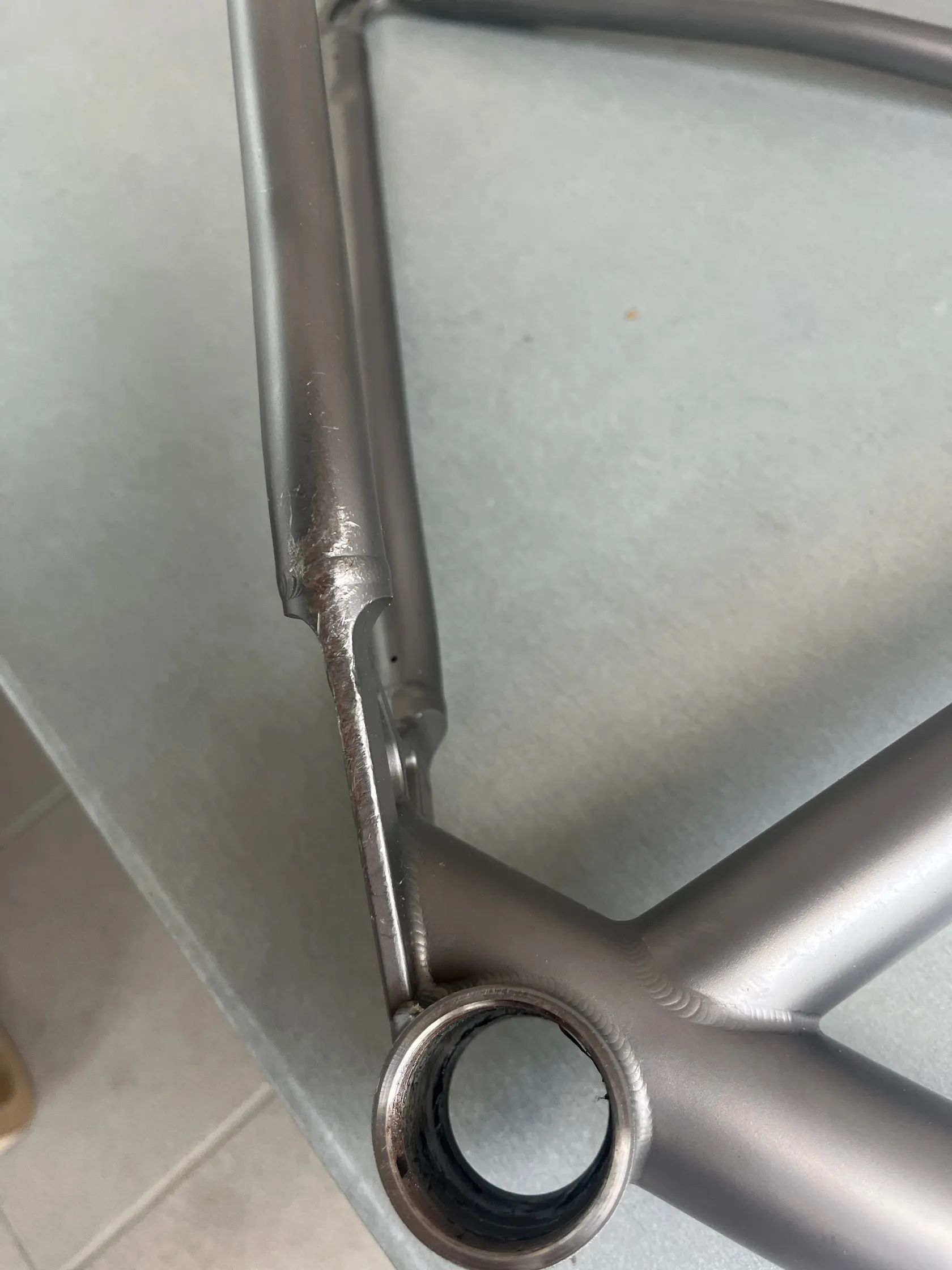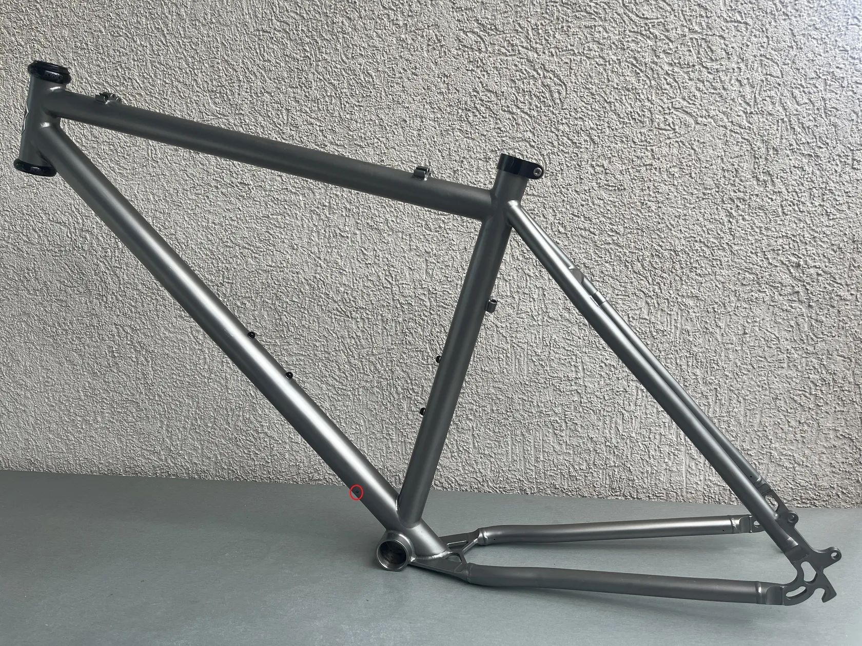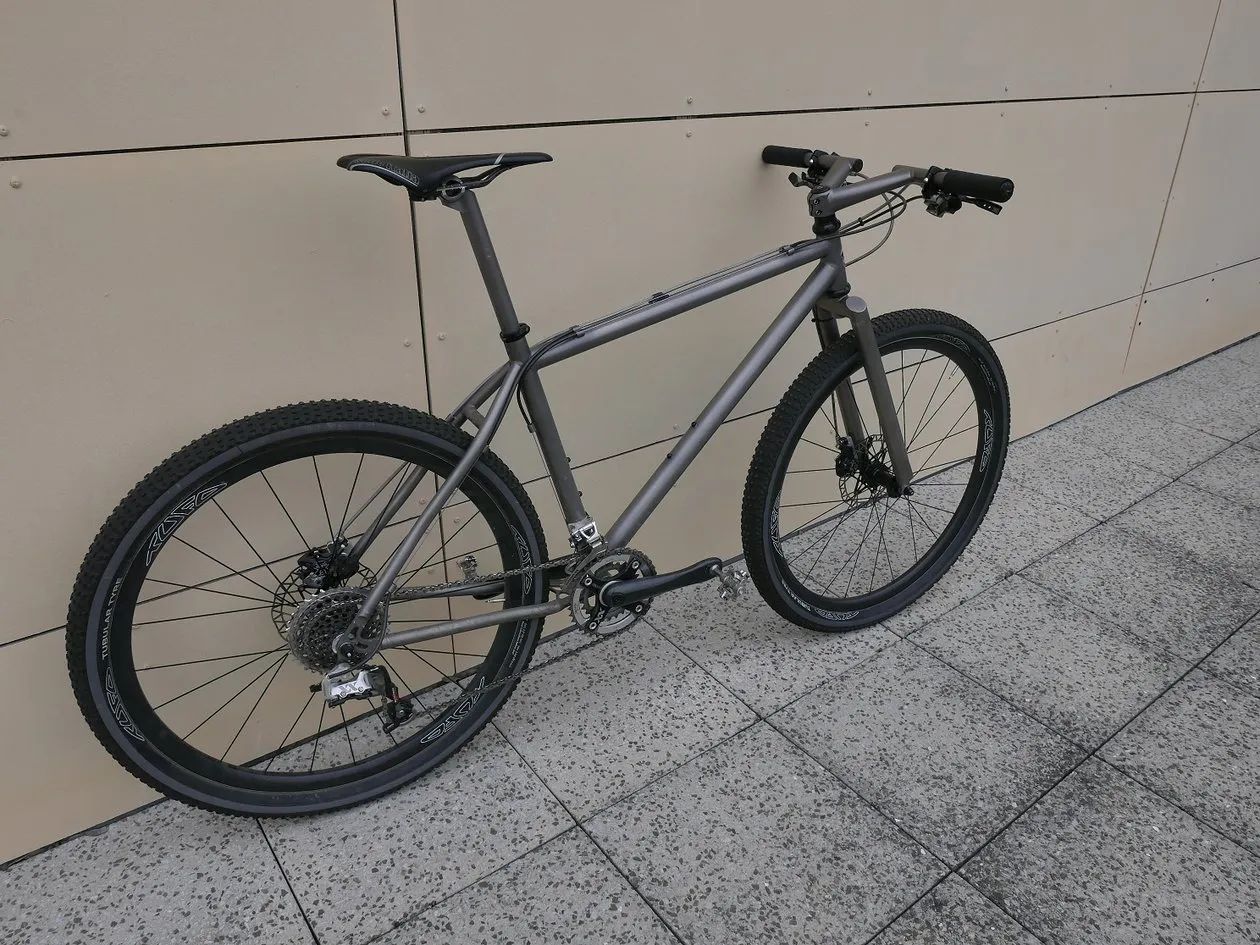 Stav rámu - není to leštěnka, pořídil jsem s již obroušeným stavem surového titanu především pod lanky a bovdeny. Vyznačeno na fotkách. (boky hlavy, horní rámovka) Bovdeny to zase částečně schovaj. Rám dostal v držení předchozího majitele v levé spodní části u středu dělo asi od kamene někdy v minulosti. Také vyznačeno na fotce. Pro inspiraci co z toho můžete poskládat přikládám i fotky celého kola jak jsem si to svého času jezdil