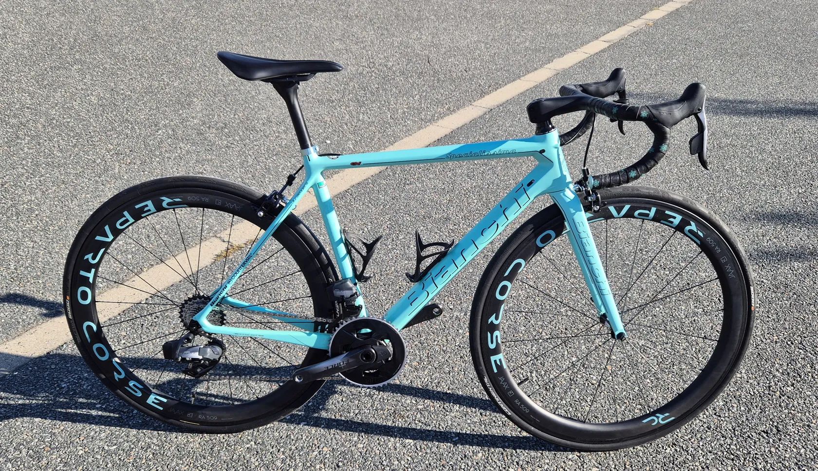 Prodám Italskou klasiku Bianchi Specialissima, velikost 53 v barvě celeste matt. Osazeno 12ti rychlostní sadou Sram FORCE AXS s powermetrem 48/35 ( 172,5 ). Karbonový kokpit ROVAL ( 100 mm ),karbonové sedlo Fizik Vento, brzdové čelisti FSA. Nová kazeta Sram Force 10/28, nový řetěz, nové košíky, nové špalky, nové pláště ( 28 mm ), kola najeto pouze 1 100 km s naboji DT swiss. Ježděno pouze za sucha a pěkného počasí, lehné kolo 6,5 kg Kolo bez investic " sedni a jeď ".