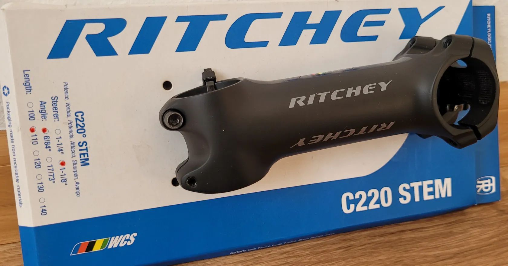 Prodám nový představec RITCHEY WCS C 220 Blatte black na průmer řídítek 31,8 mm, vidice 1-1/8", úhel 6 st., délka 110 mm, hmotnost 137 g (váženo), cena 1 000,- Kč.