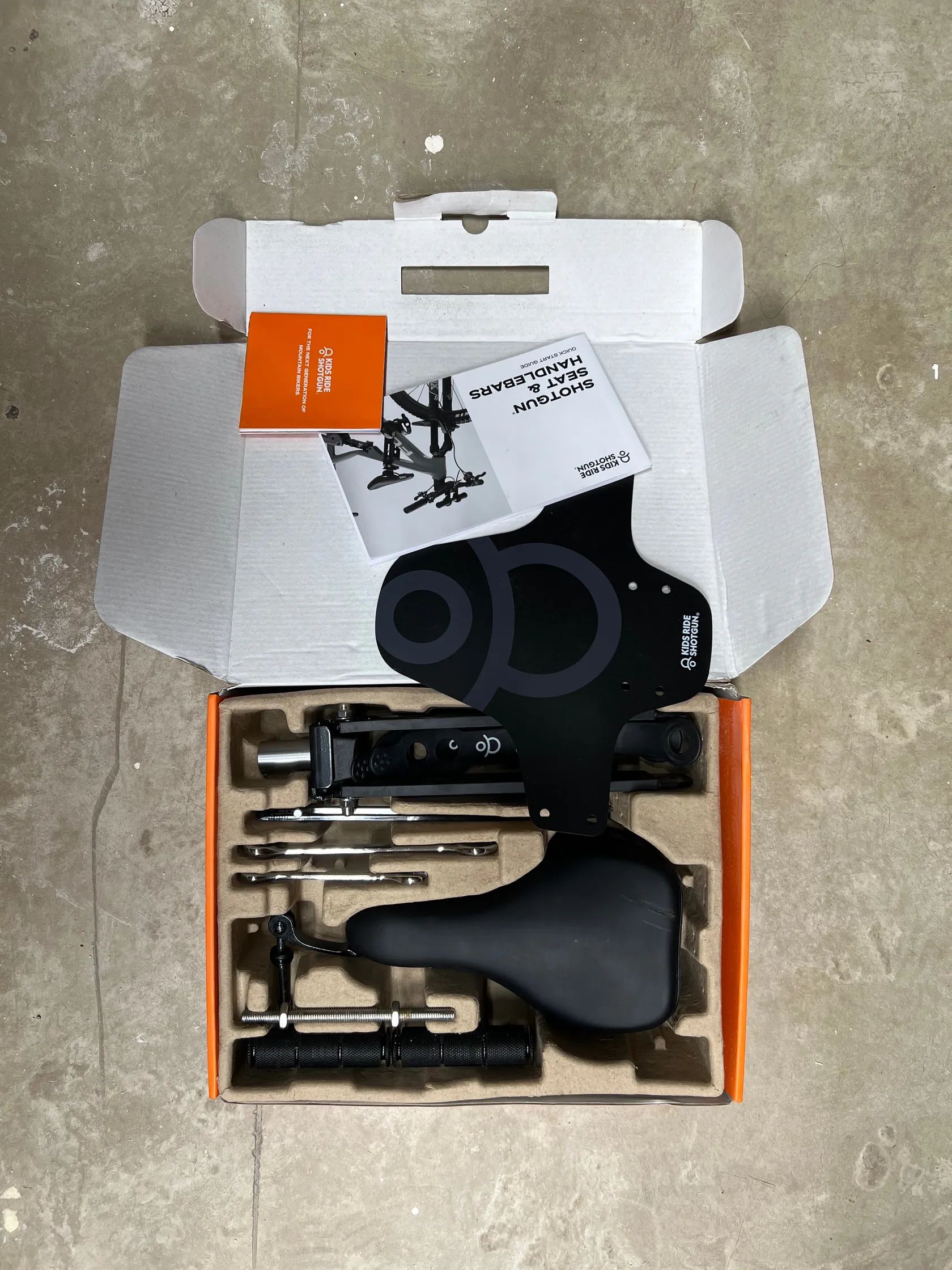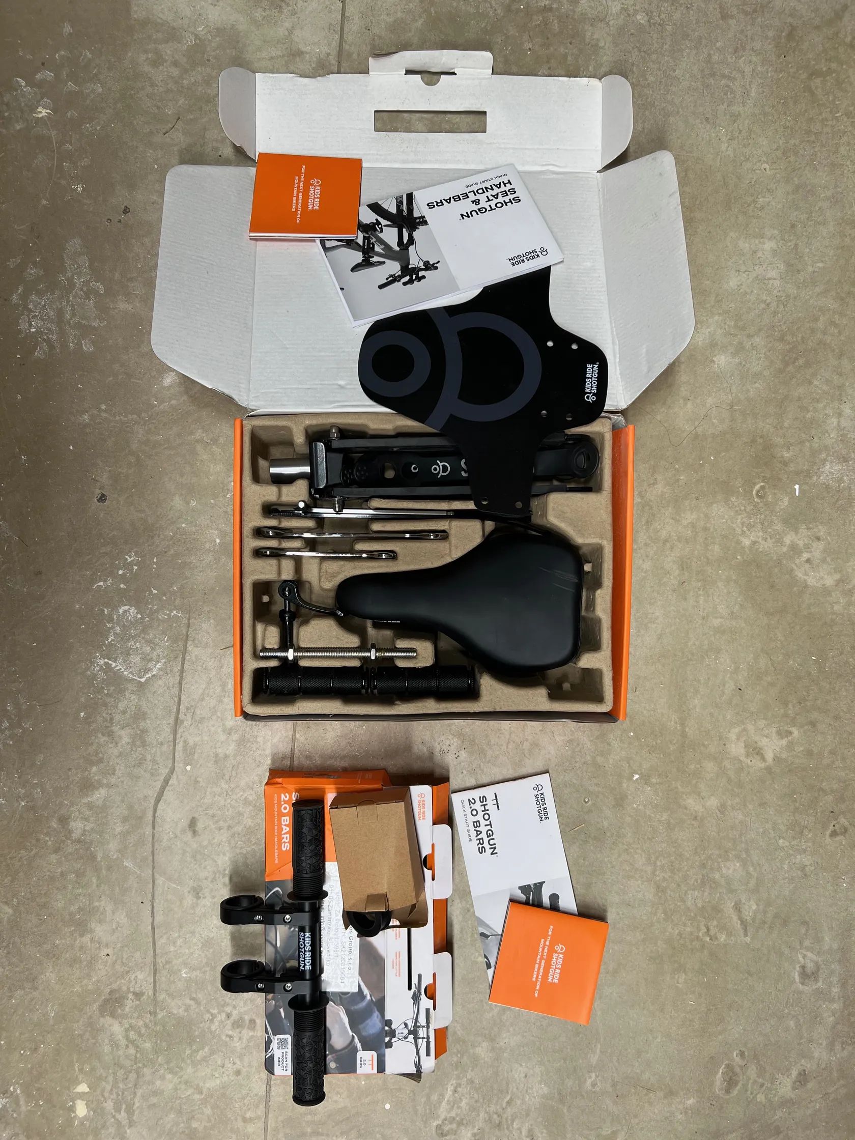 Prodám kompletní set Kids Ride Shotgun - sedačku verze 1.0 a řídítka verze 2.0. Oboje je plně funkční a připravené k okamžitému použití.