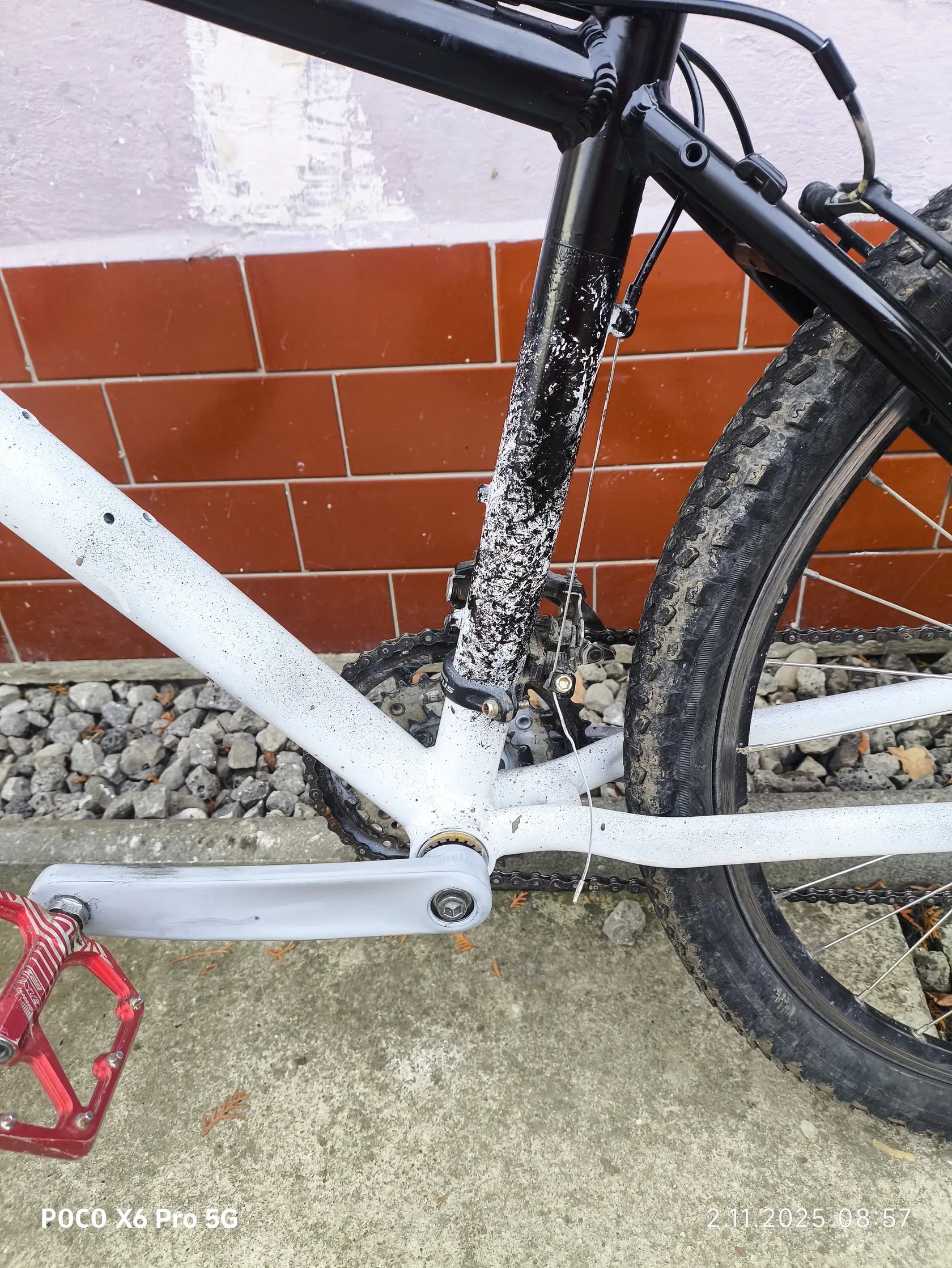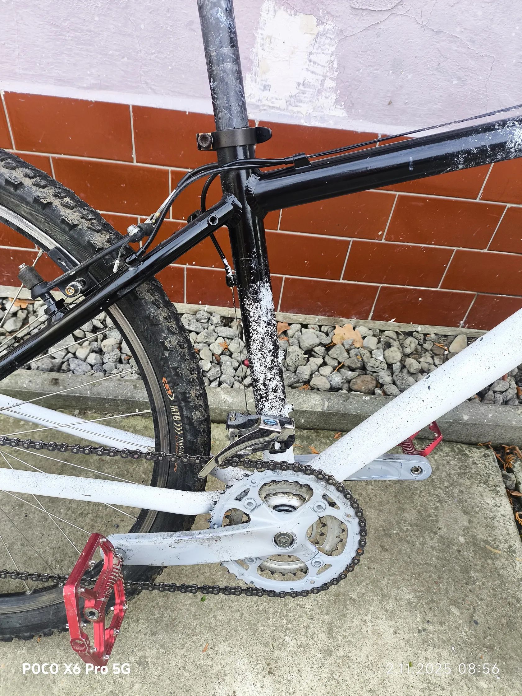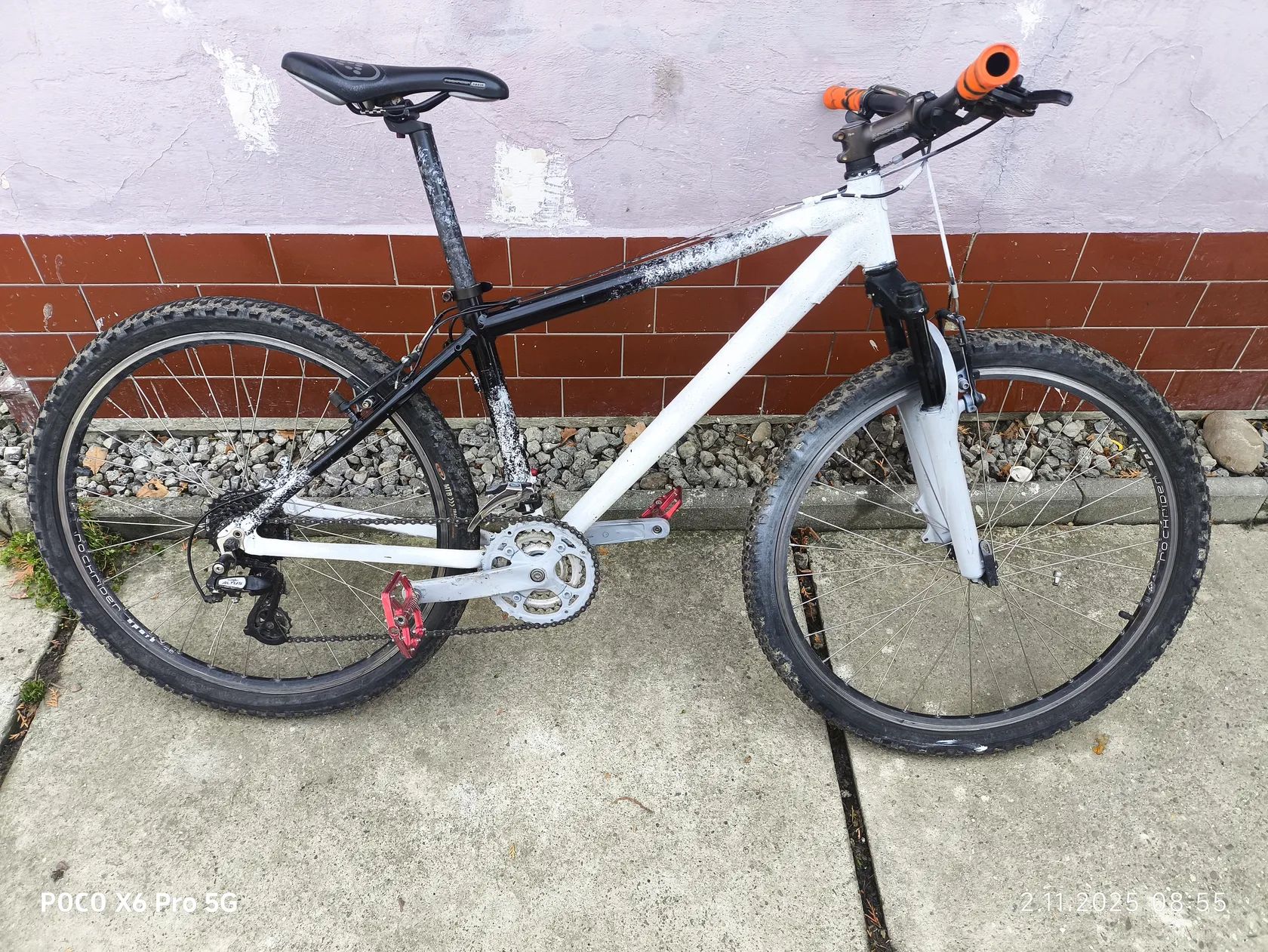 Červené hliníkové pedály Kolo je lehké, pohodlné a ideální pro rekreační jízdu nebo jako stylové městské MTB. Cena 3-6 tisíc původní cena z Decathlonu 13500 korun
