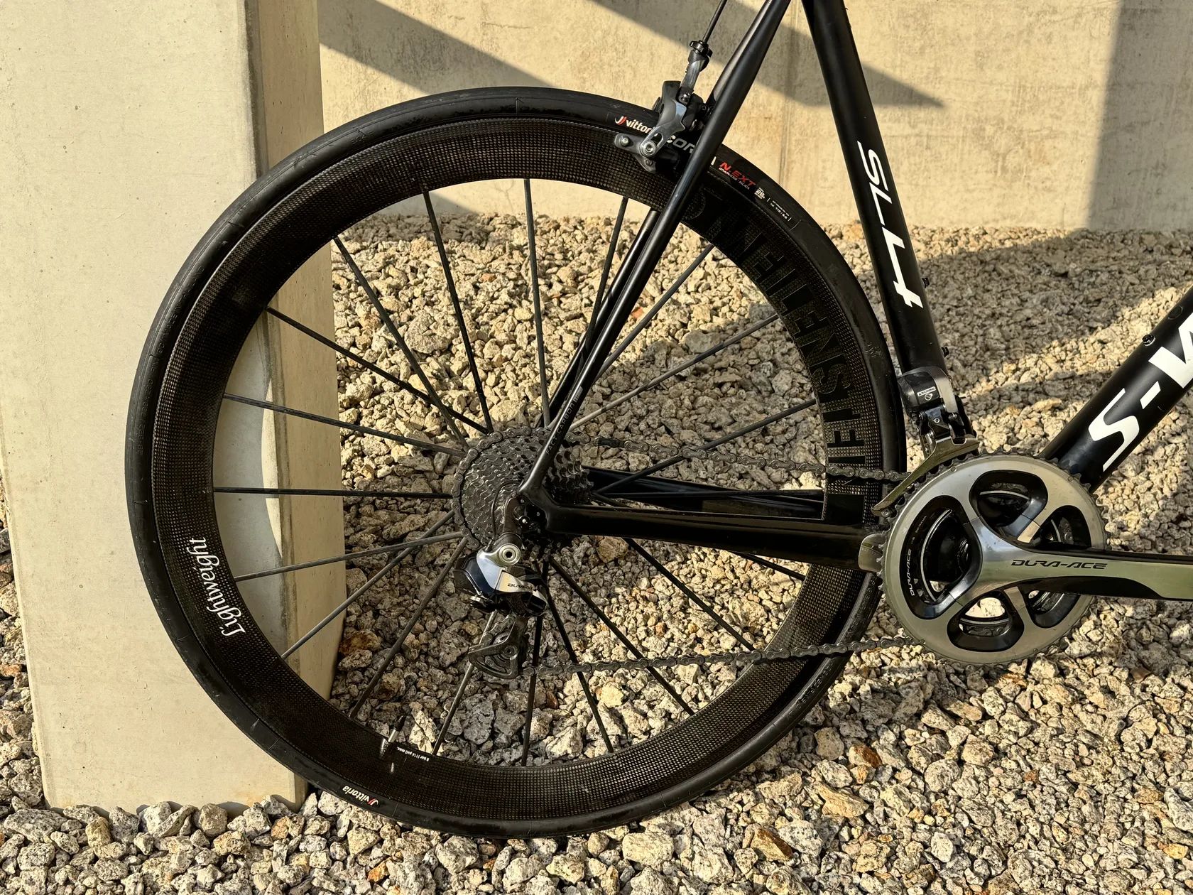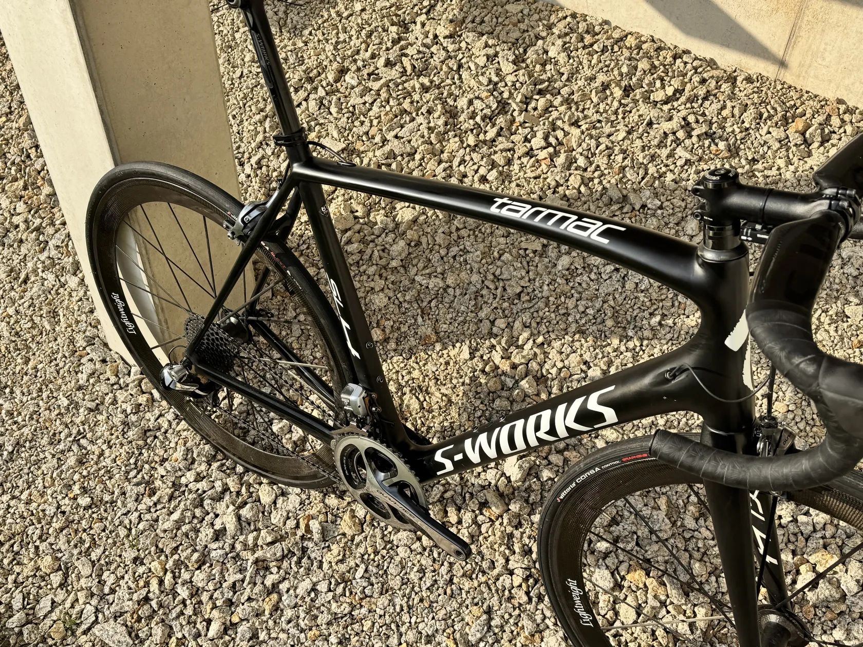 Prodám silniční kolo Specialized S-Works Tarmac SL4 Dura-Ace Di2, ve velikost 61" (momentálně nastaveno na 188cm). Kolo bylo ježděno rekreačně a po celou dobu pečlivě servisováno u autorizovaného prodejce Kolokrám Liberec. Ke kolu mám veškeré doklady i fakturu o koupi. Osazení tvoří kompletní sada Shimano Dura-Ace Di2, řídítka S-Works Aerofly a karbonová kola Lightweight Meilenstein. Obuté jsou zánovní pláště Vittoria Corsa 28 mm. Kolo je celkově ve velmi dobrém stavu, pravidelně servisované. Krásný lehký stroj na špičkových kolech, ideální pro někoho, kdo hledá klasickou silničku na ráfkových brzdách. Pouze osobní předání v Liberci, případně po domluvě v Praze.
