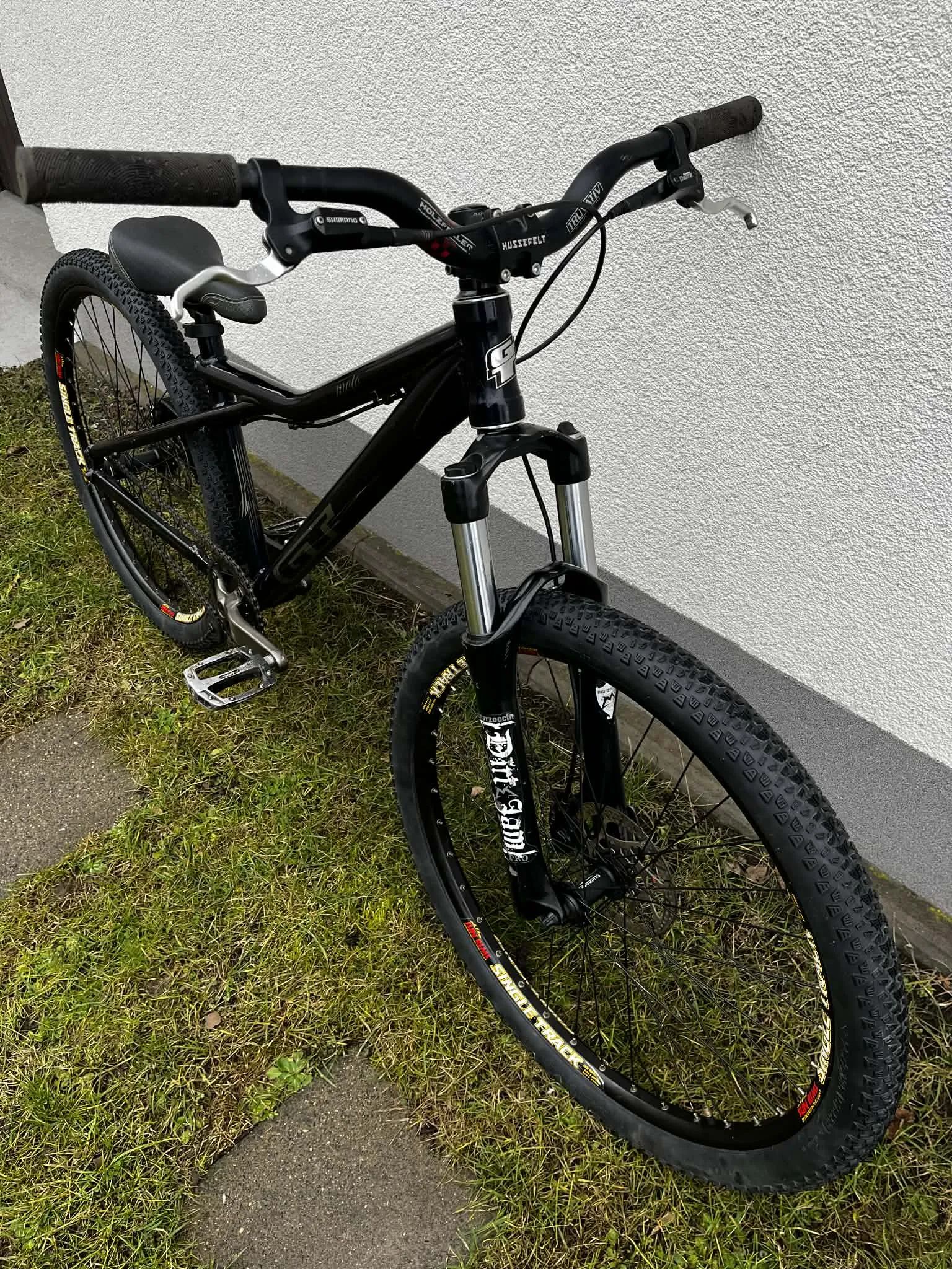 hliníkový rám GT Moto vzduchová vidlice Marzocchi DirtJam PRO 26" kola na nábojích Shimano a robustních ráfcích SunRims, úplně nové pláště Kliky Truvativ, singlespeed převod (lze předělat na přehazovačku) platformové pedály hydraulické kotoučové brzdy Shimano Deore, kokpit Truvativ