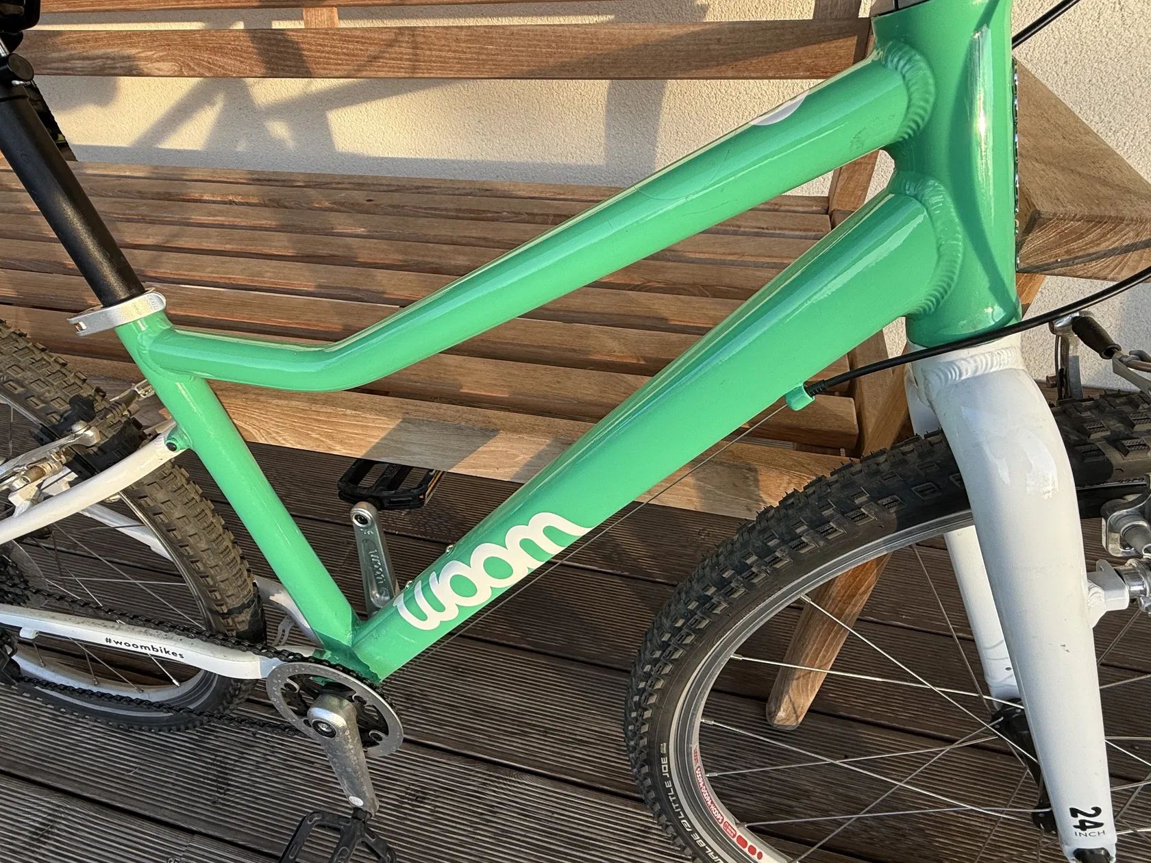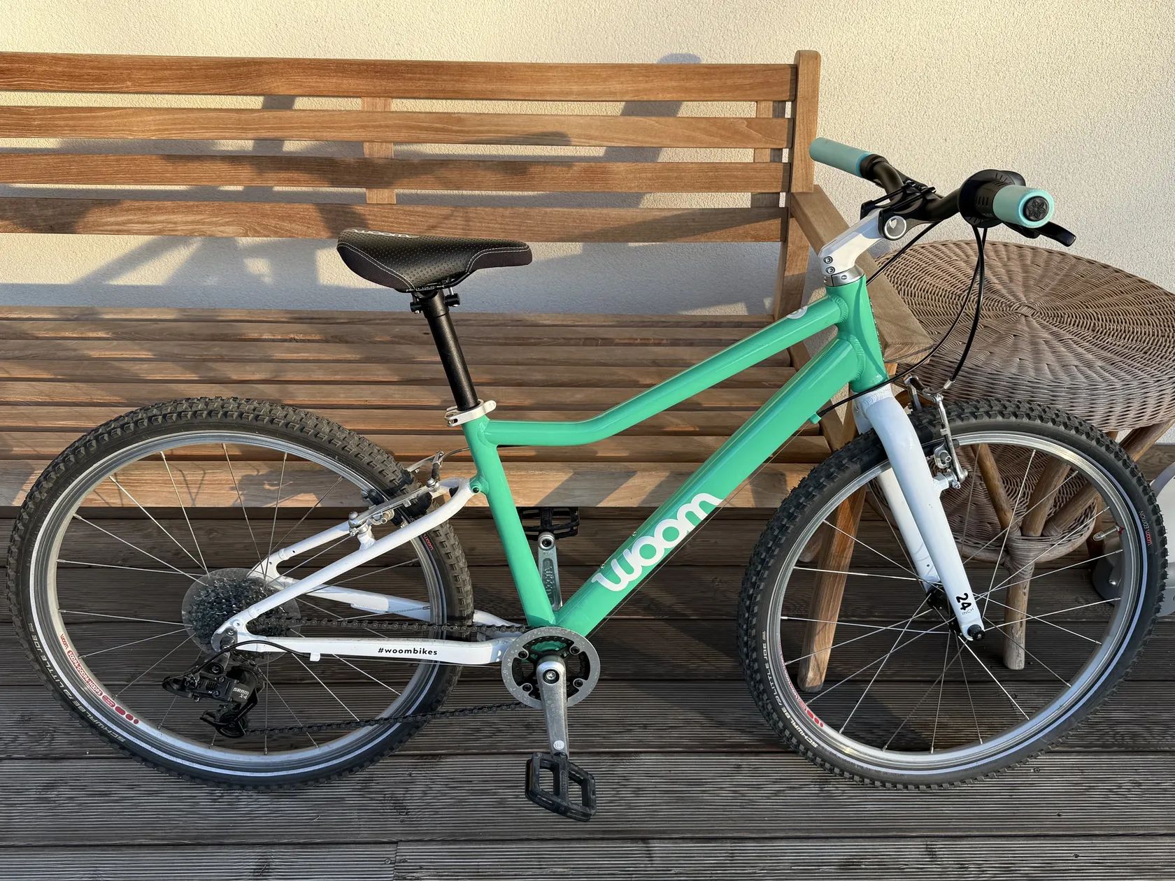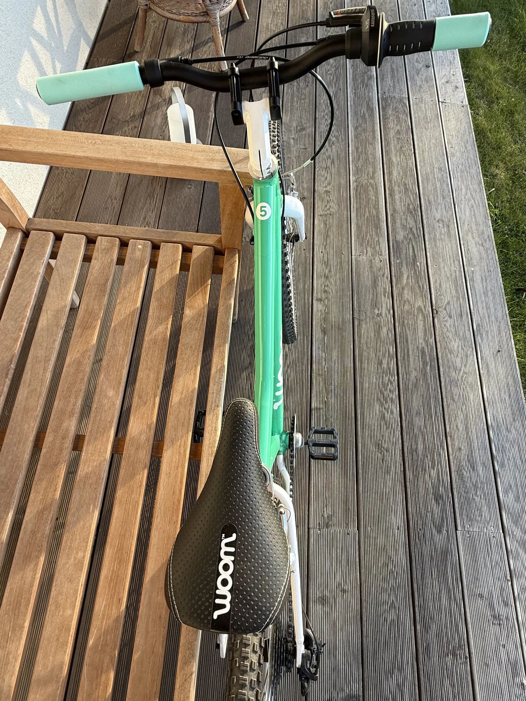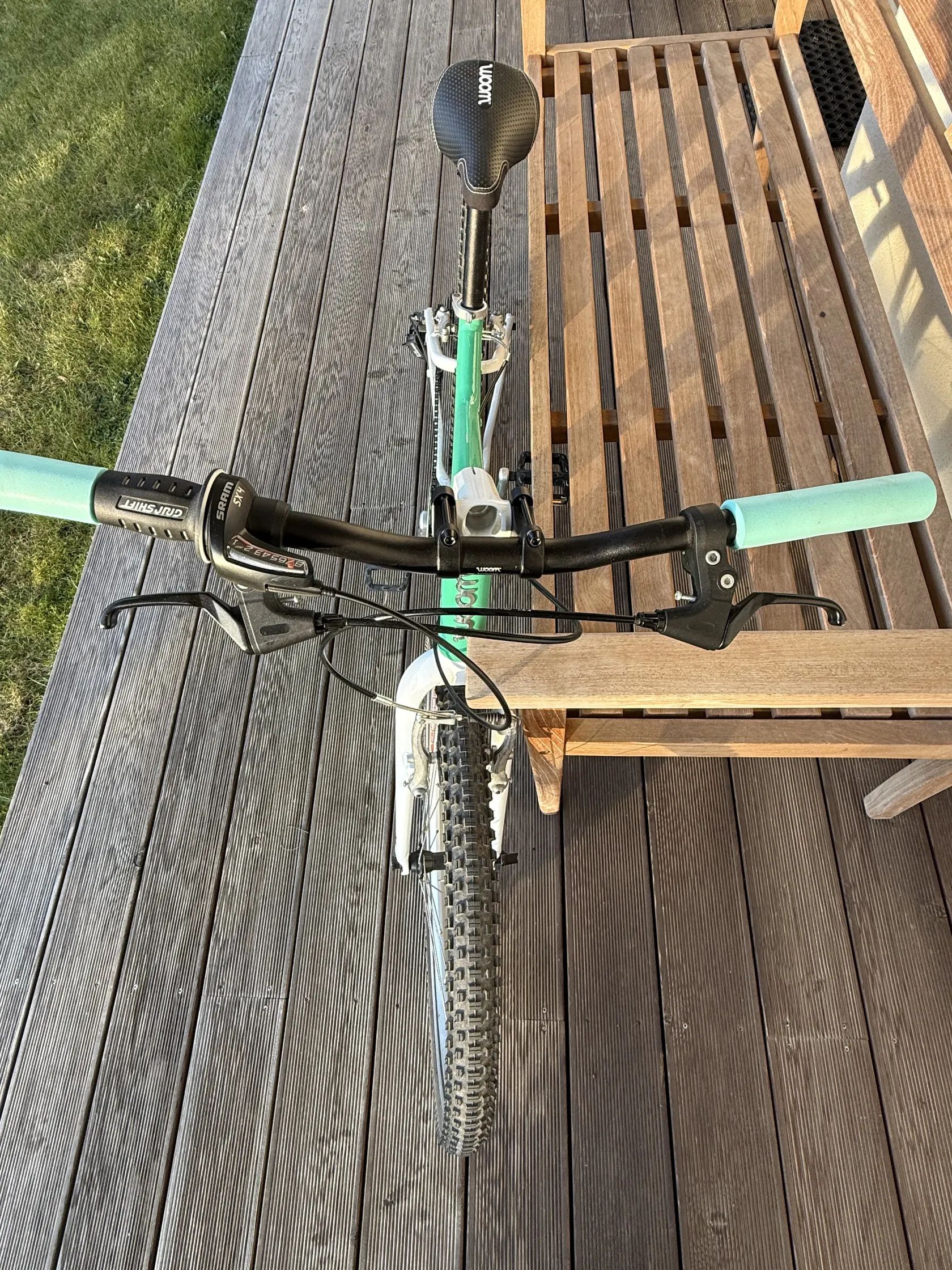 Prodám lehké dětské kolo WOOM 5, 24” kola, barva zelená Mint, nové silikonové gripy - mint (původní dám ke kolu). ALU rám. Kolo váží 8,2 kg. 1x8 převody. Na výšku postavy cca 125-150 cm. Krásný stav, nepoškrábané. Málo jeté. Viz foto.