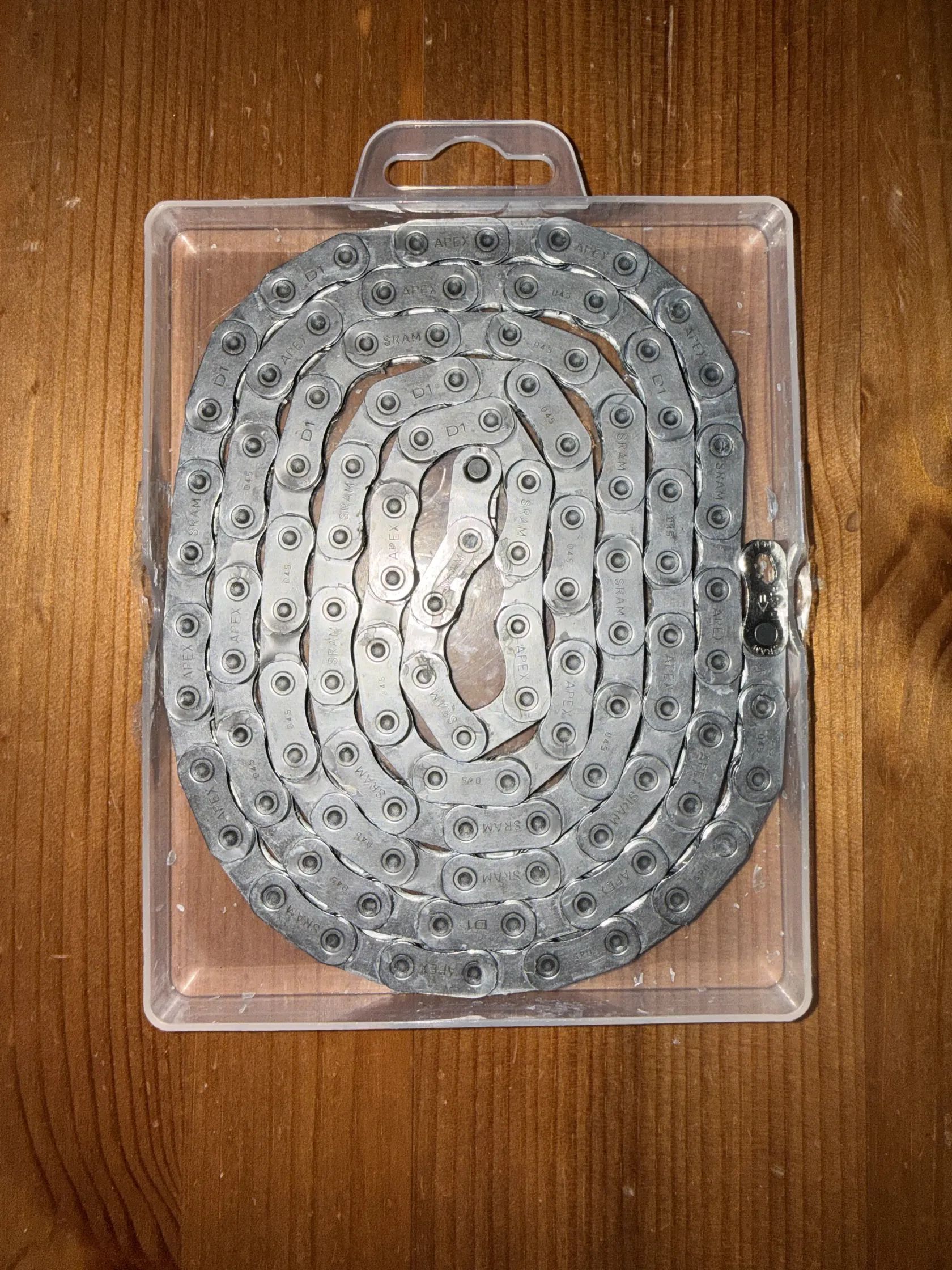A nový řetěz Sram Apex D1 12sp. Flattop 111 článků + rychlospojka navoskovaný pomocí Silca Super Secret Blend Hot Wax. Řetěz byl předtím odmaštěn v ultrazvukové čističce.